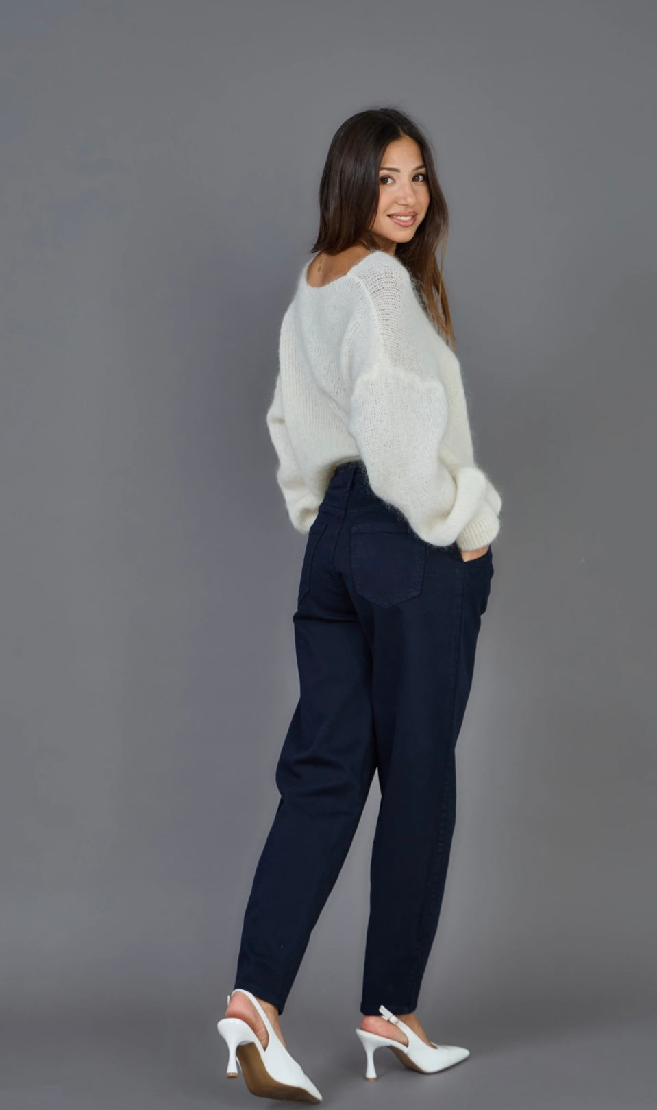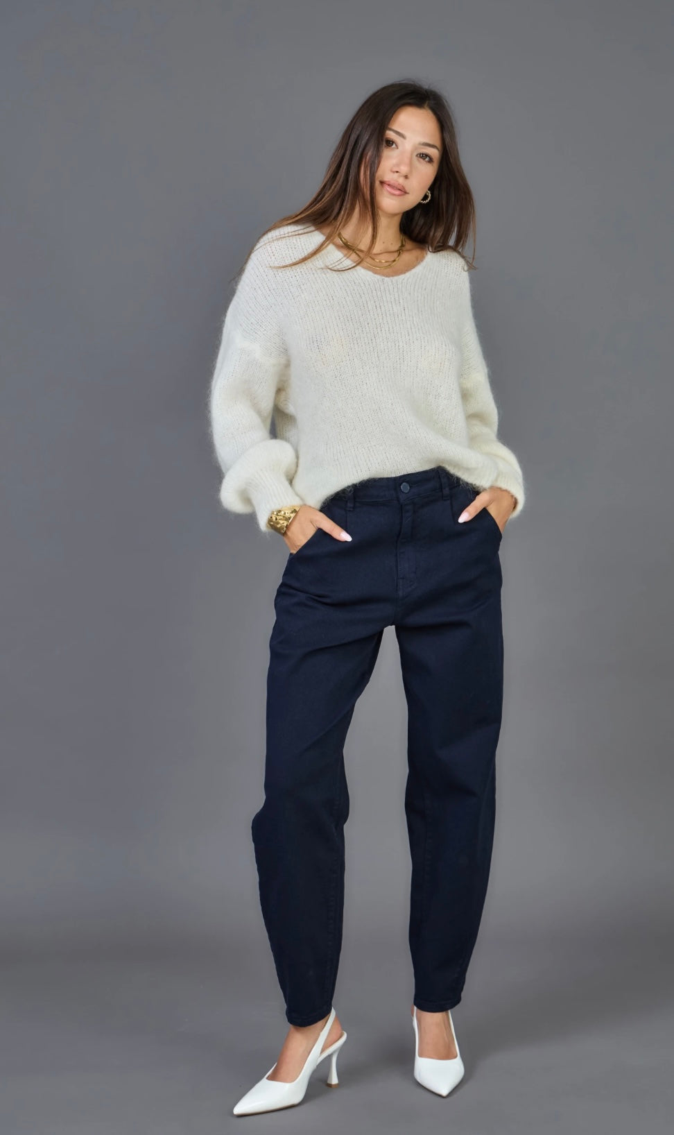 Snygg modell med mycket stretch normal i storleken tajtare över höften och rak i benen. 98 % bomull 2% elastan