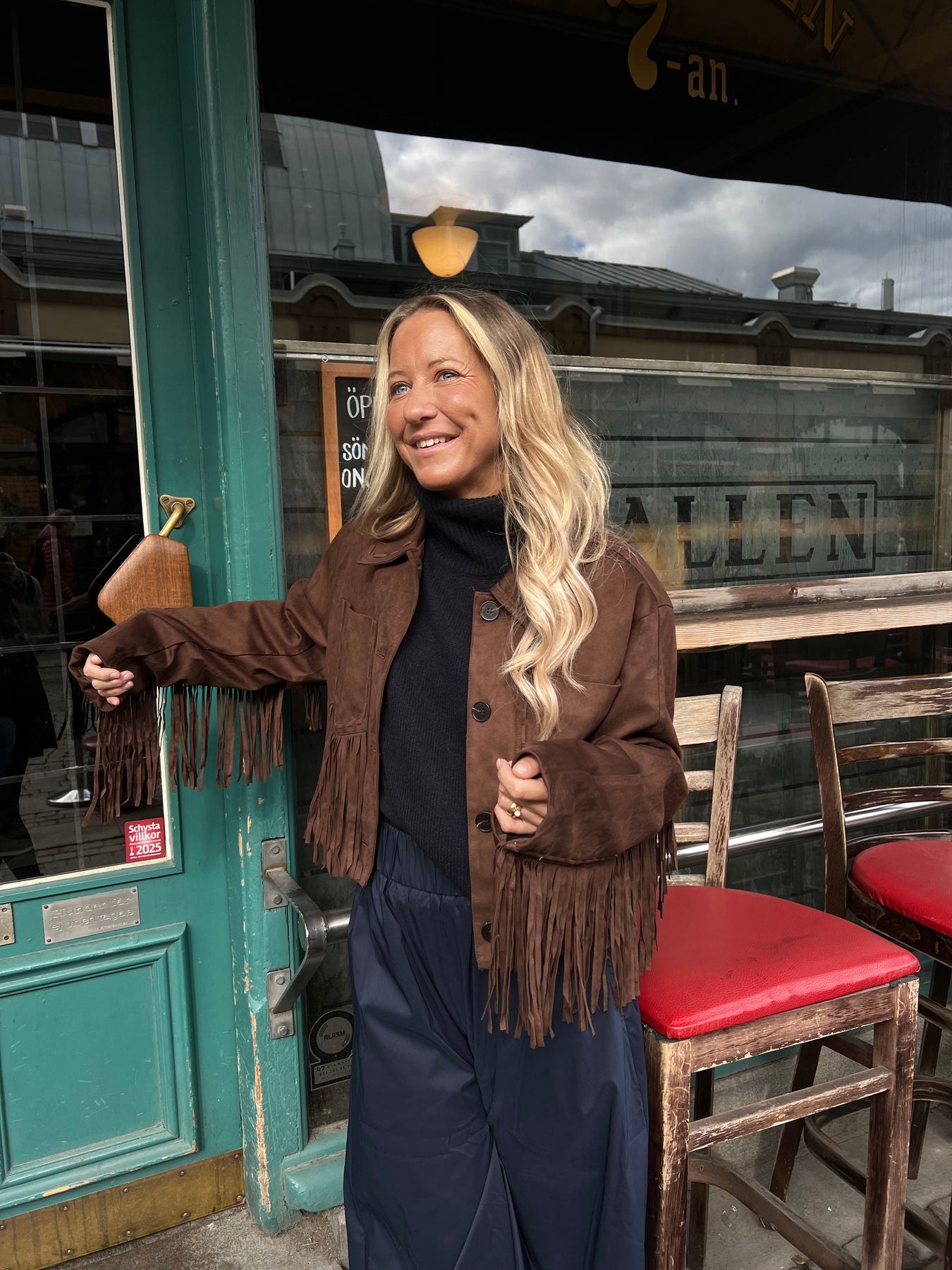 Supersnygg kortare mockajacka med fransar och fickor fram till materialet är 90 % polyester 10 % elastan