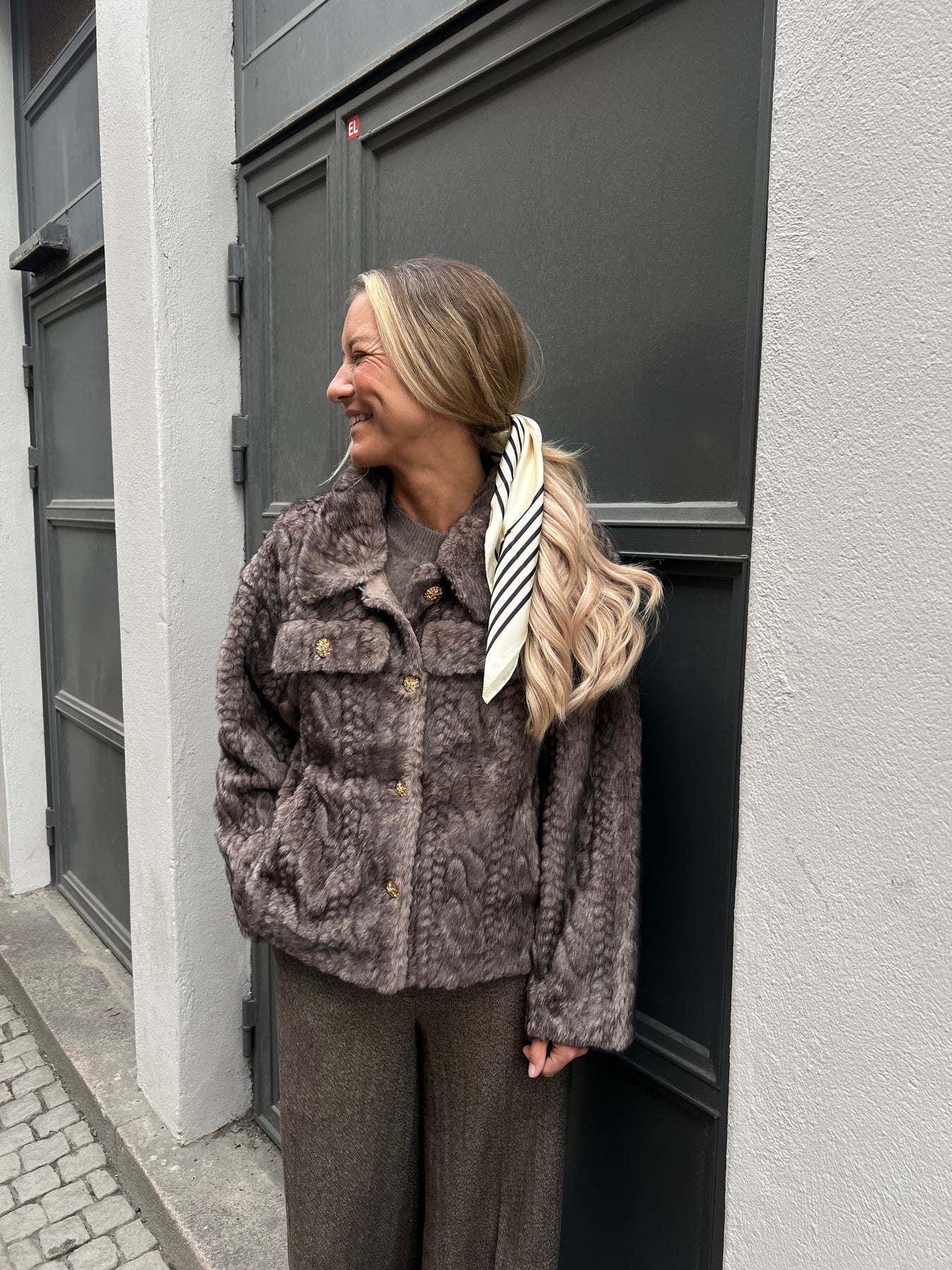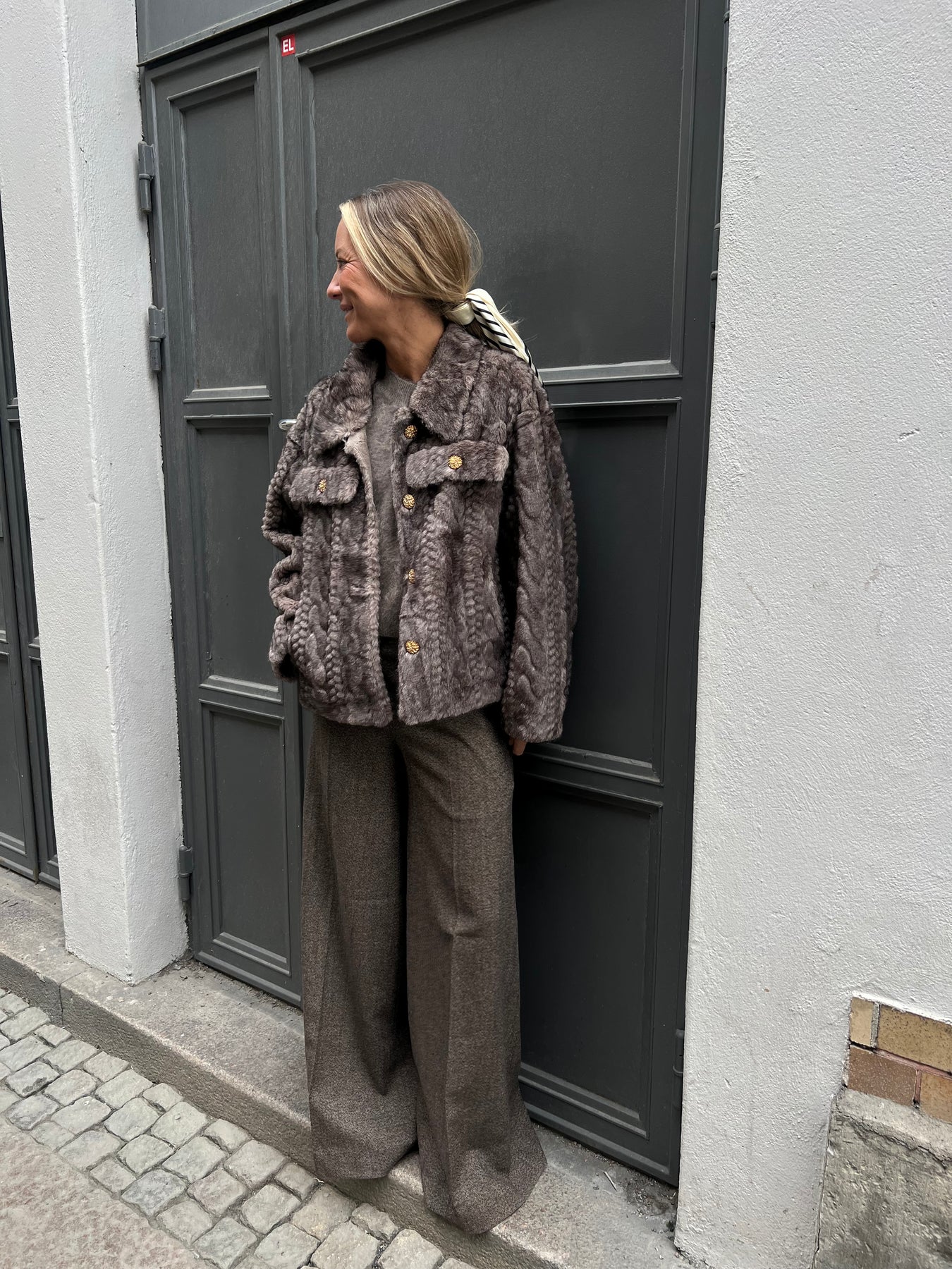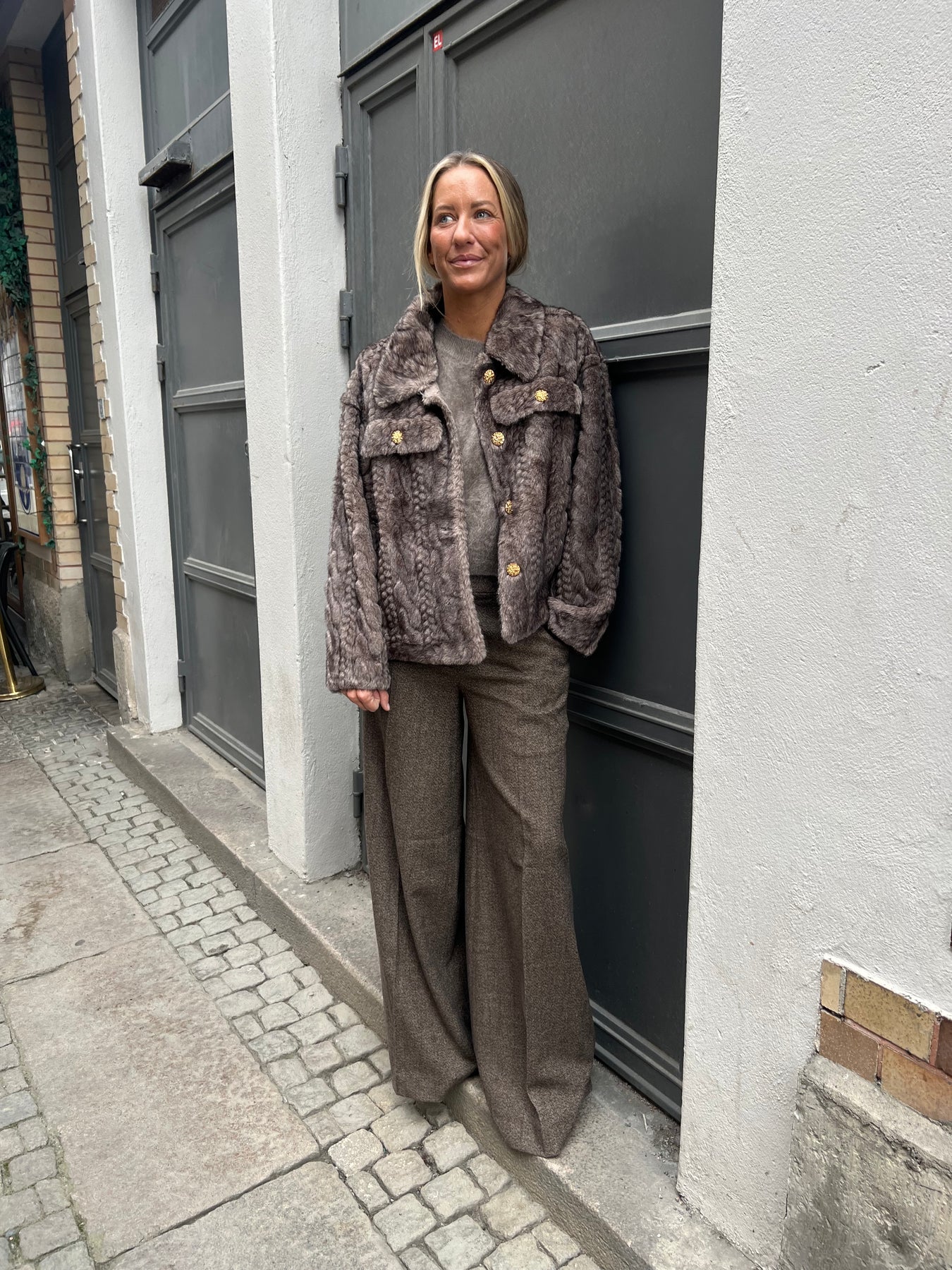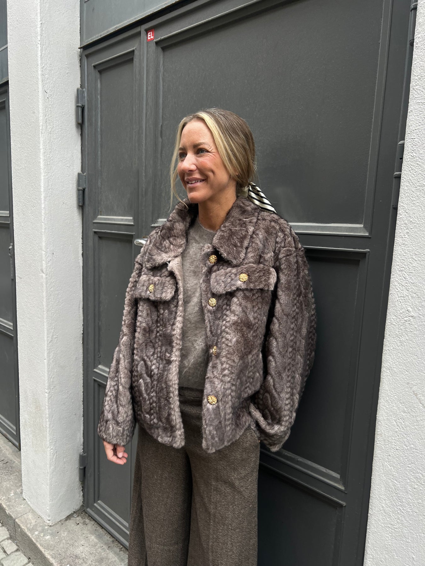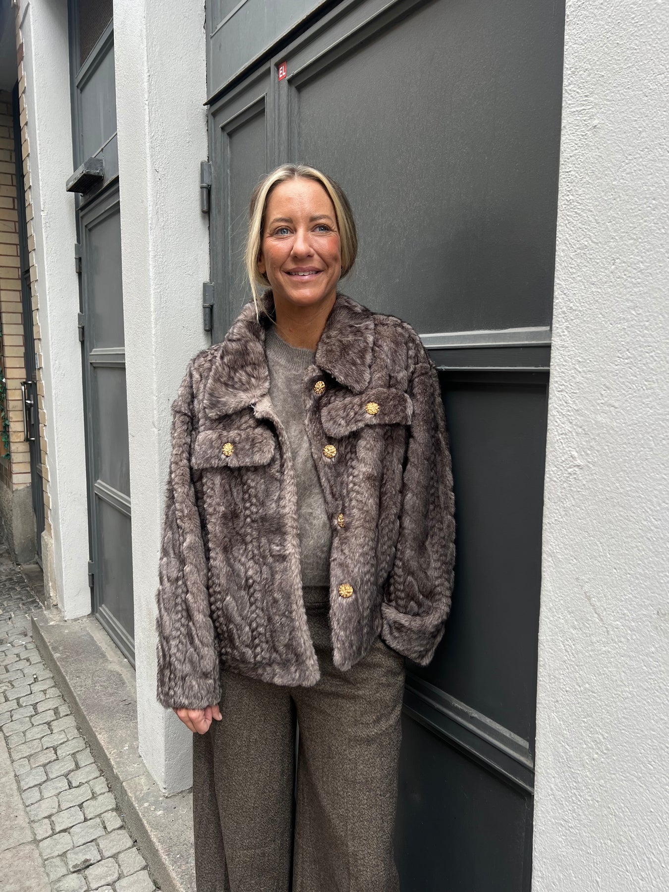 Otroligt fin jacka i fuskpäls, kabelstickad päls med guldknappar.