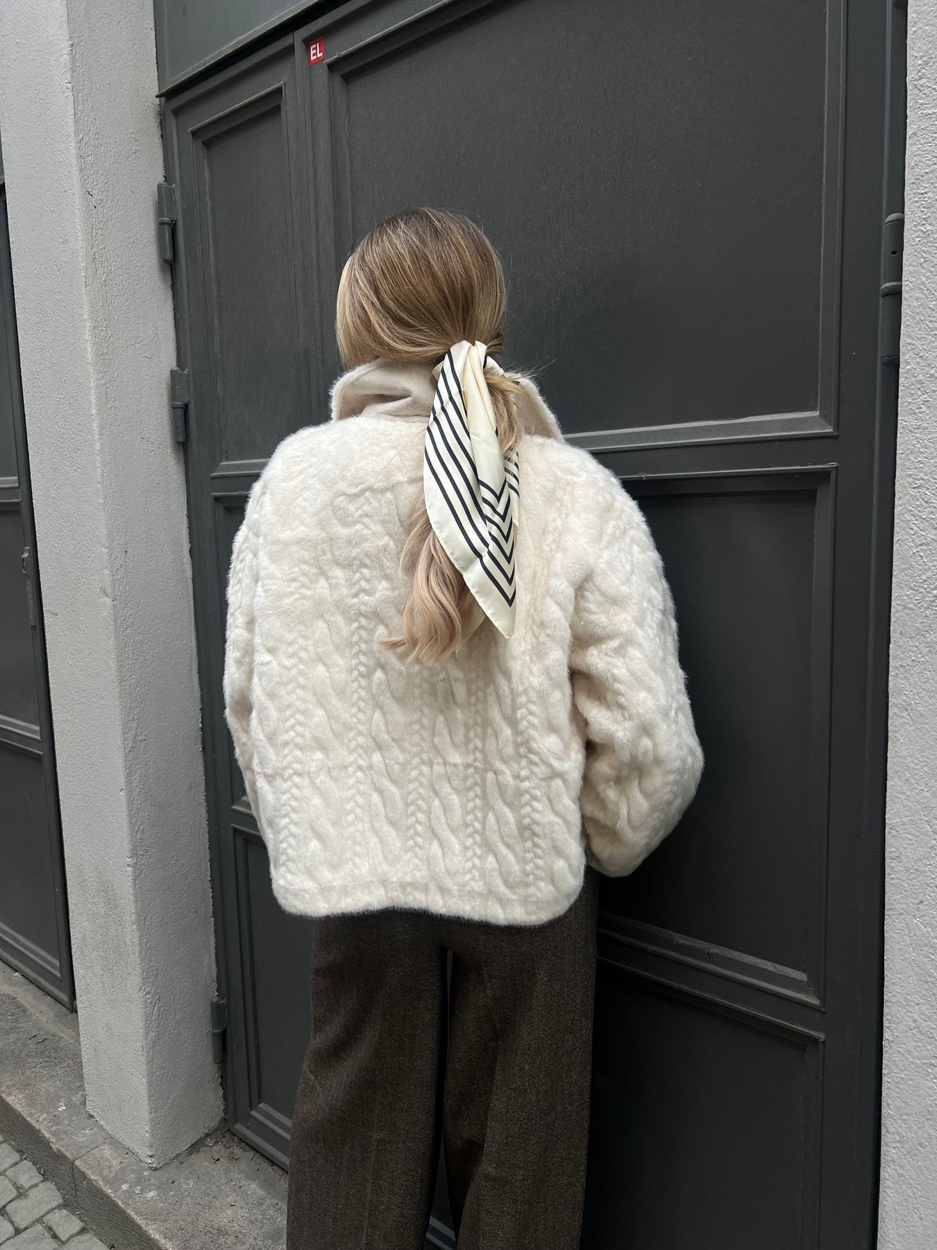 Otroligt fin jacka i fuskpäls, kabelstickad päls med guldknappar.
