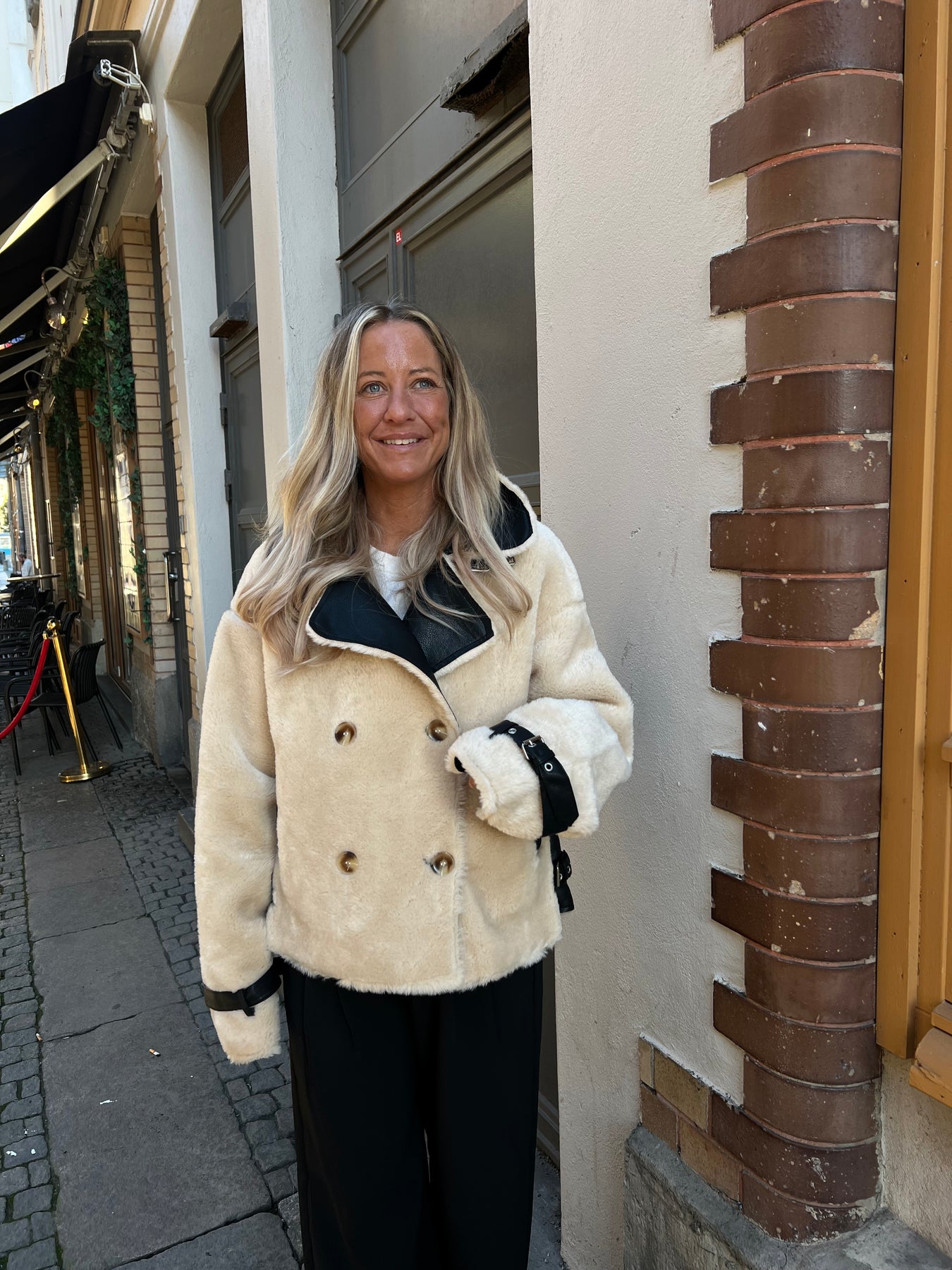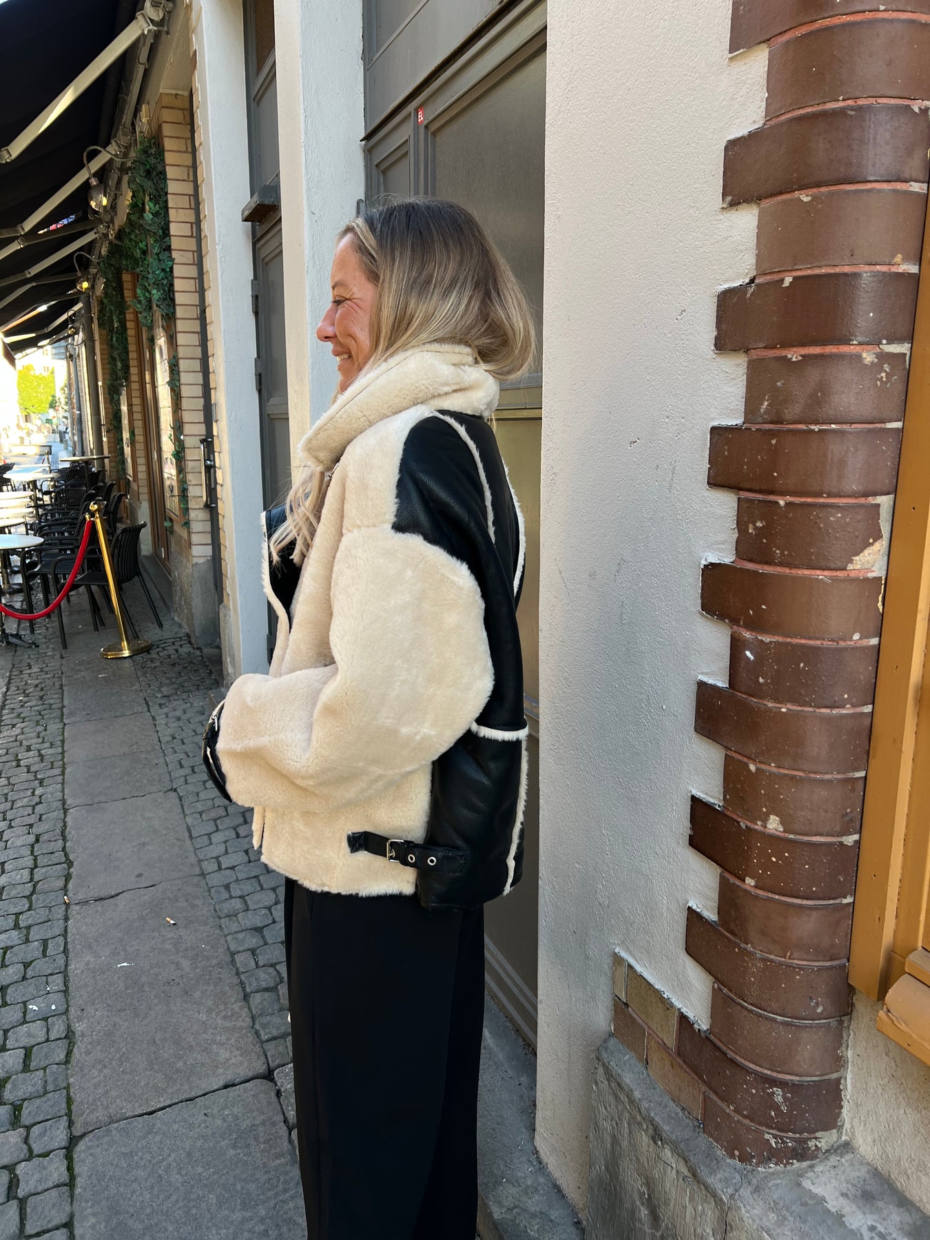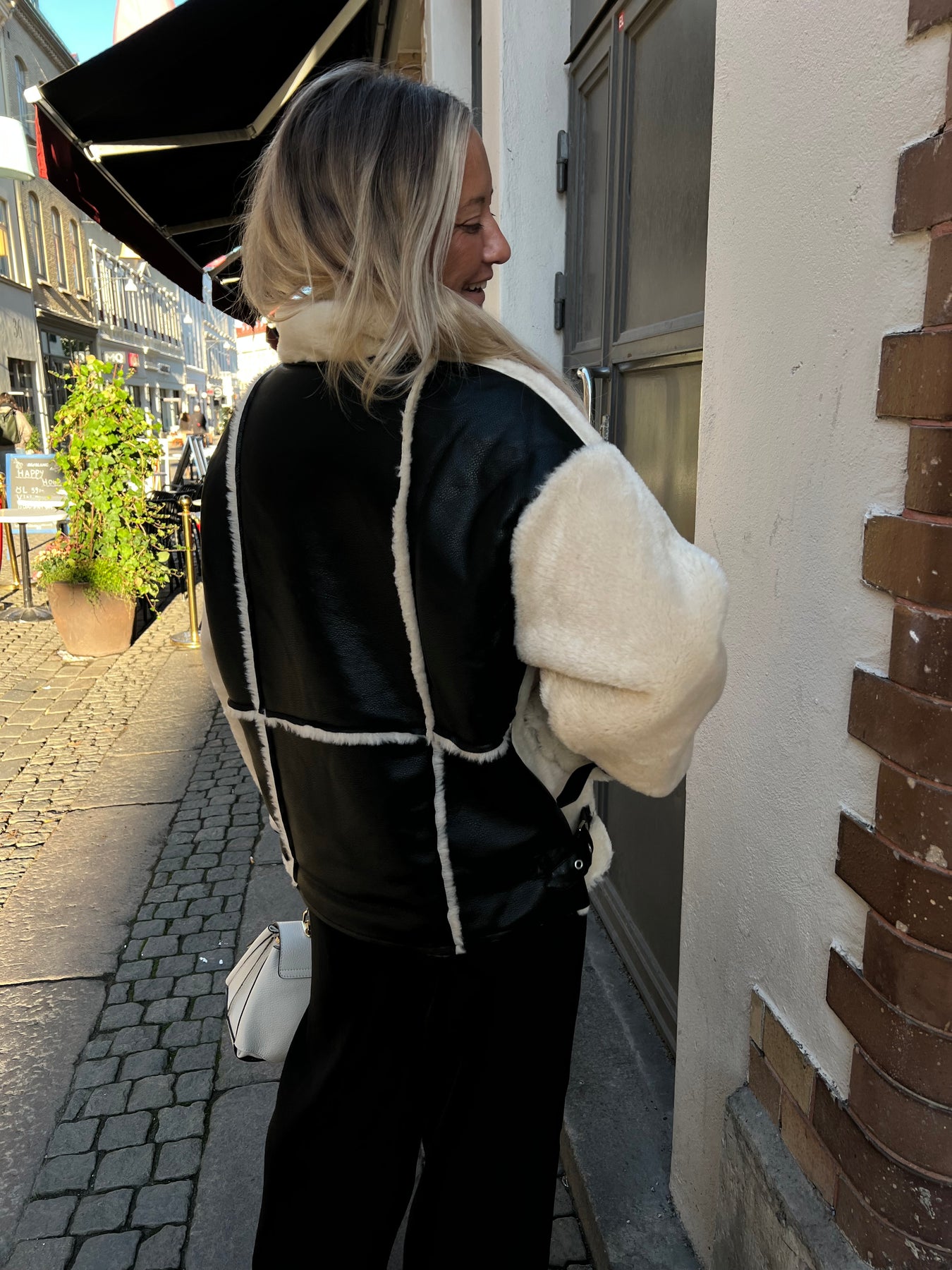 Super cool jacka, oversize i modellen Jessica bär storlek. S. Den är i PU läder med teddy på insidan.