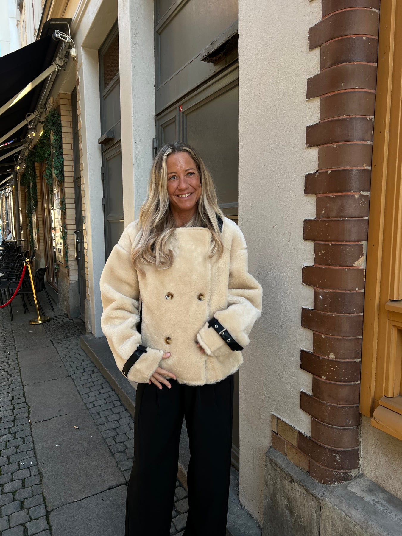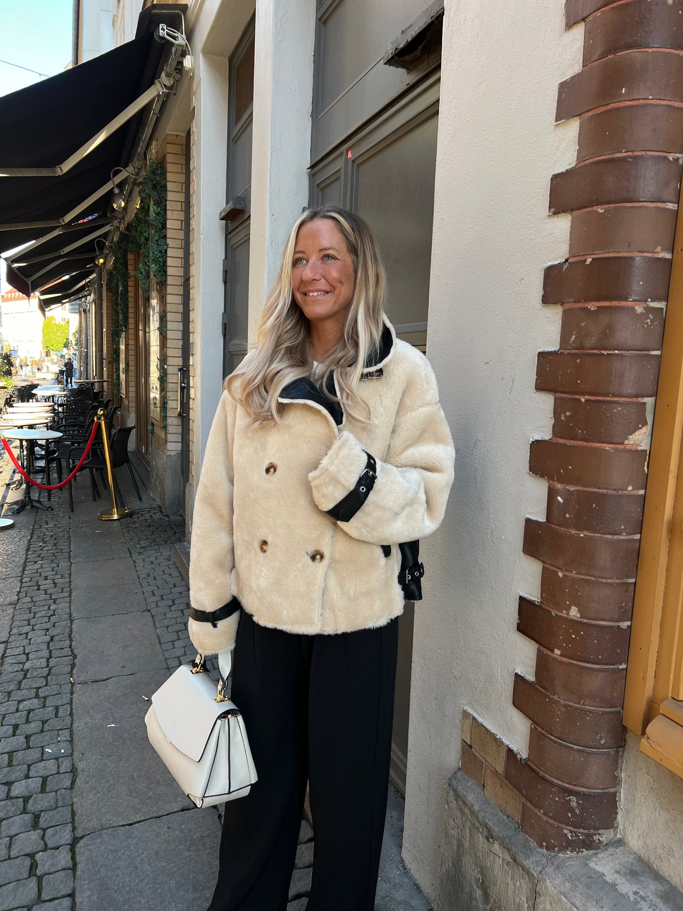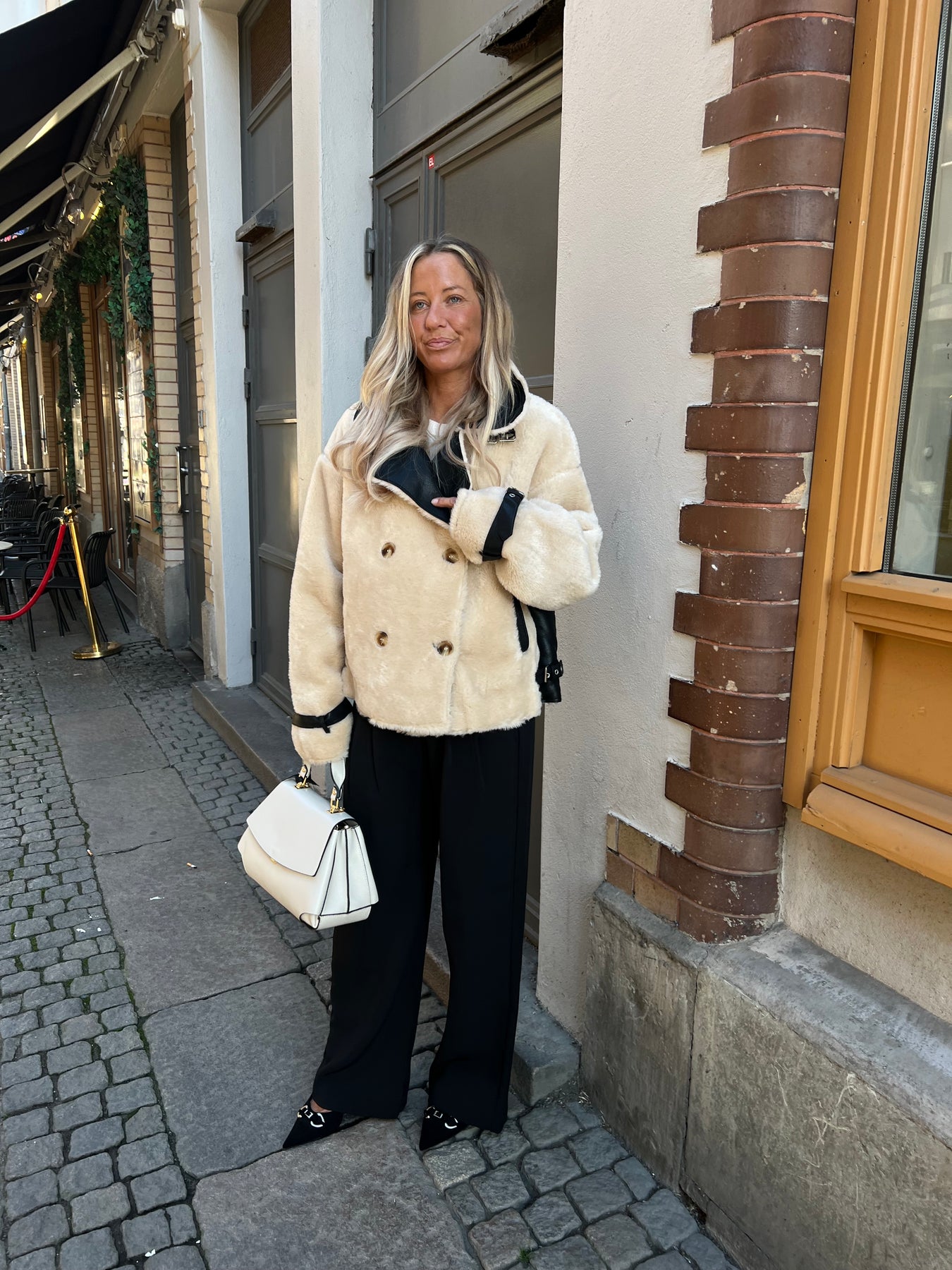 Super cool jacka, oversize i modellen Jessica bär storlek. S. Den är i PU läder med teddy på insidan.
