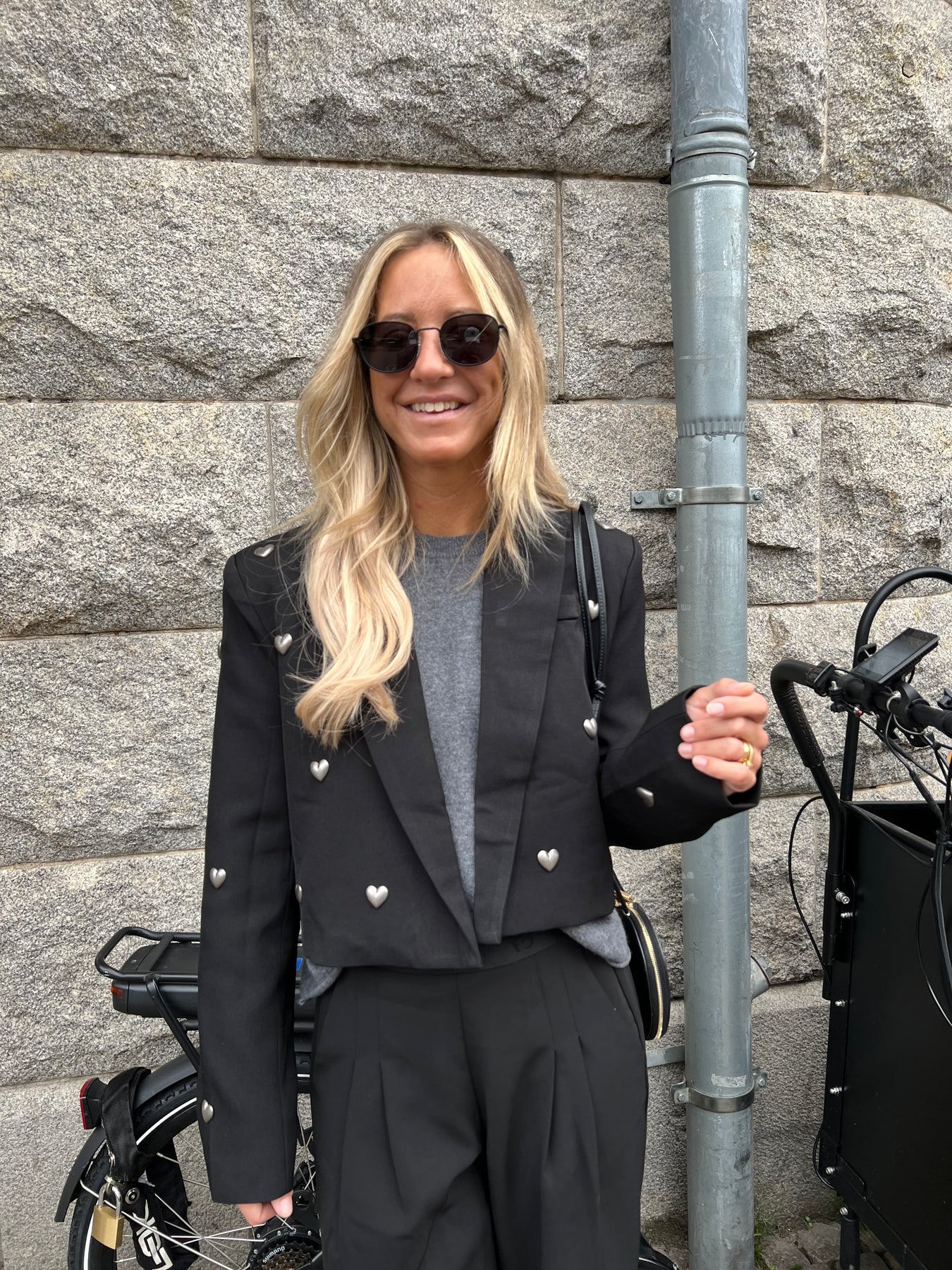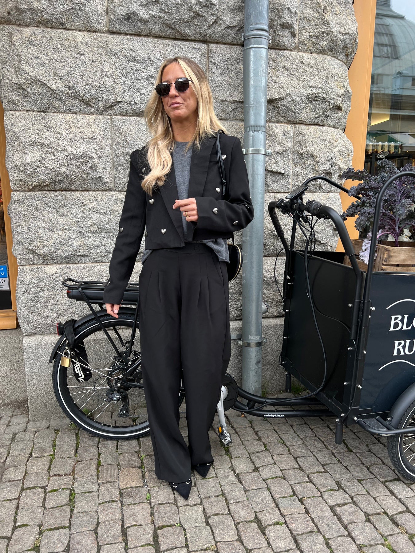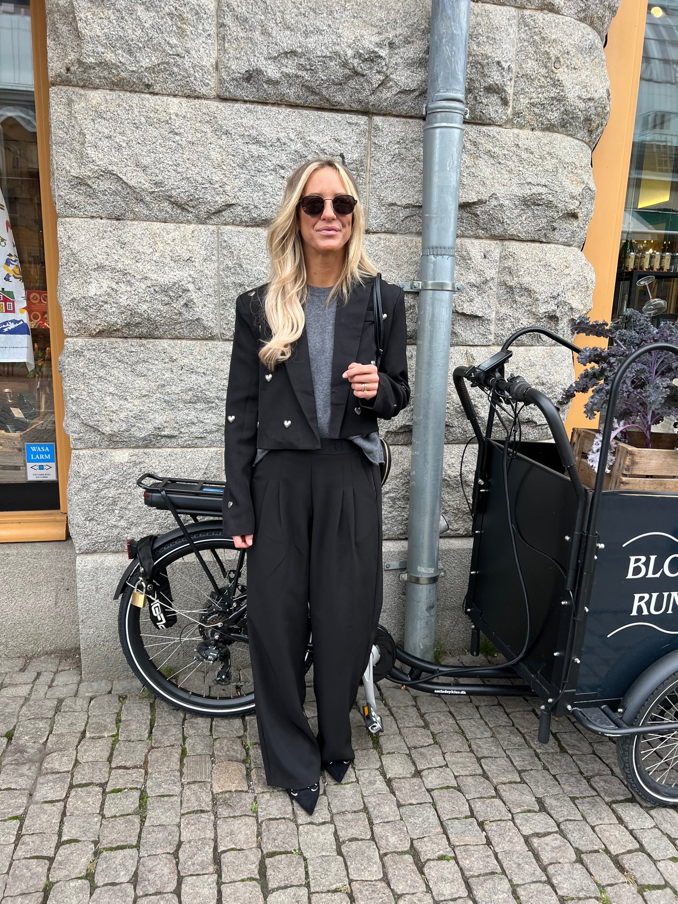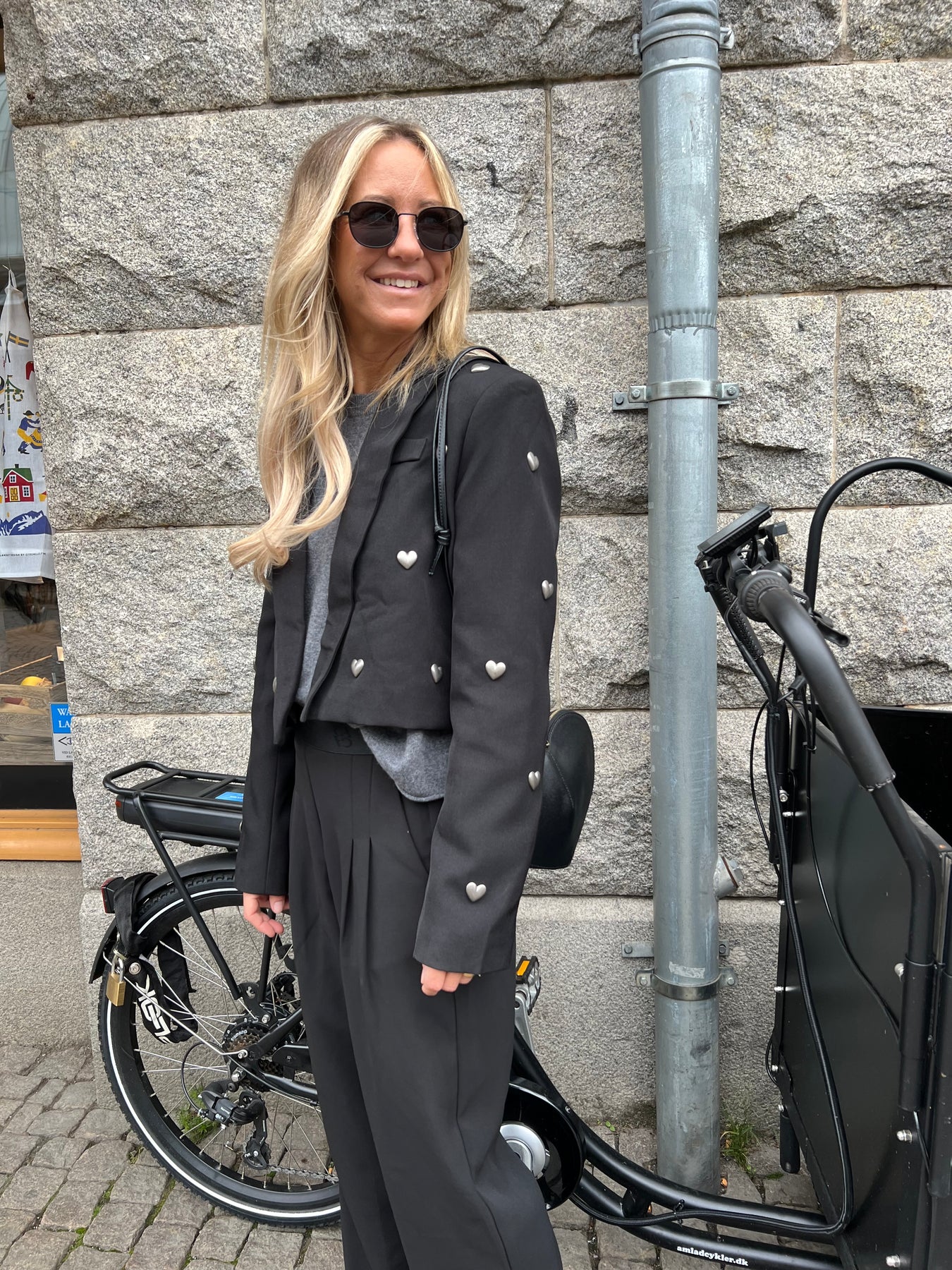 Den lilla korta kavajen med metall silver hjärtan kavajen är i en storlek passar 34 till 38 materialet är 95 % polyester 5 % Spandex