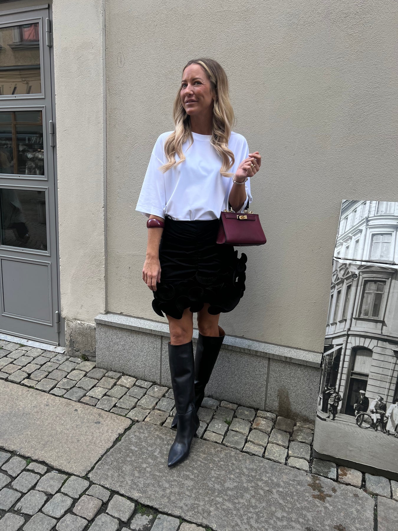 Kort partykjol med stora blommor längst ner i kanten, normal storleken.