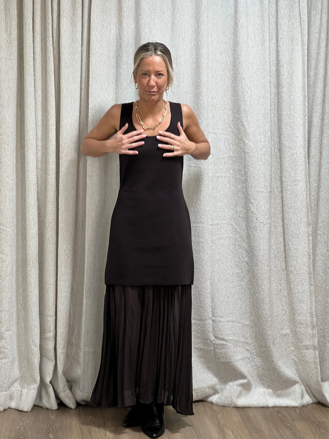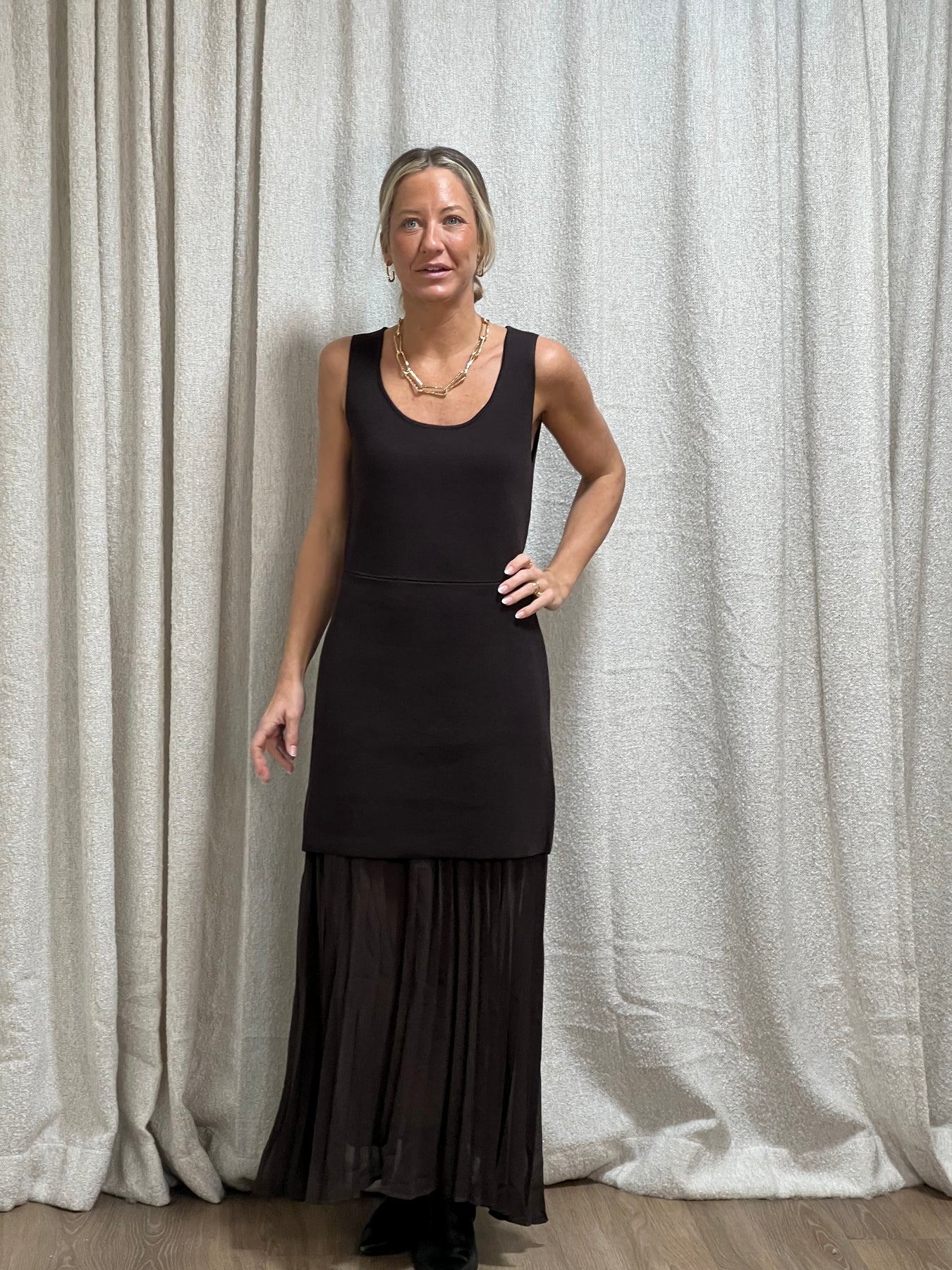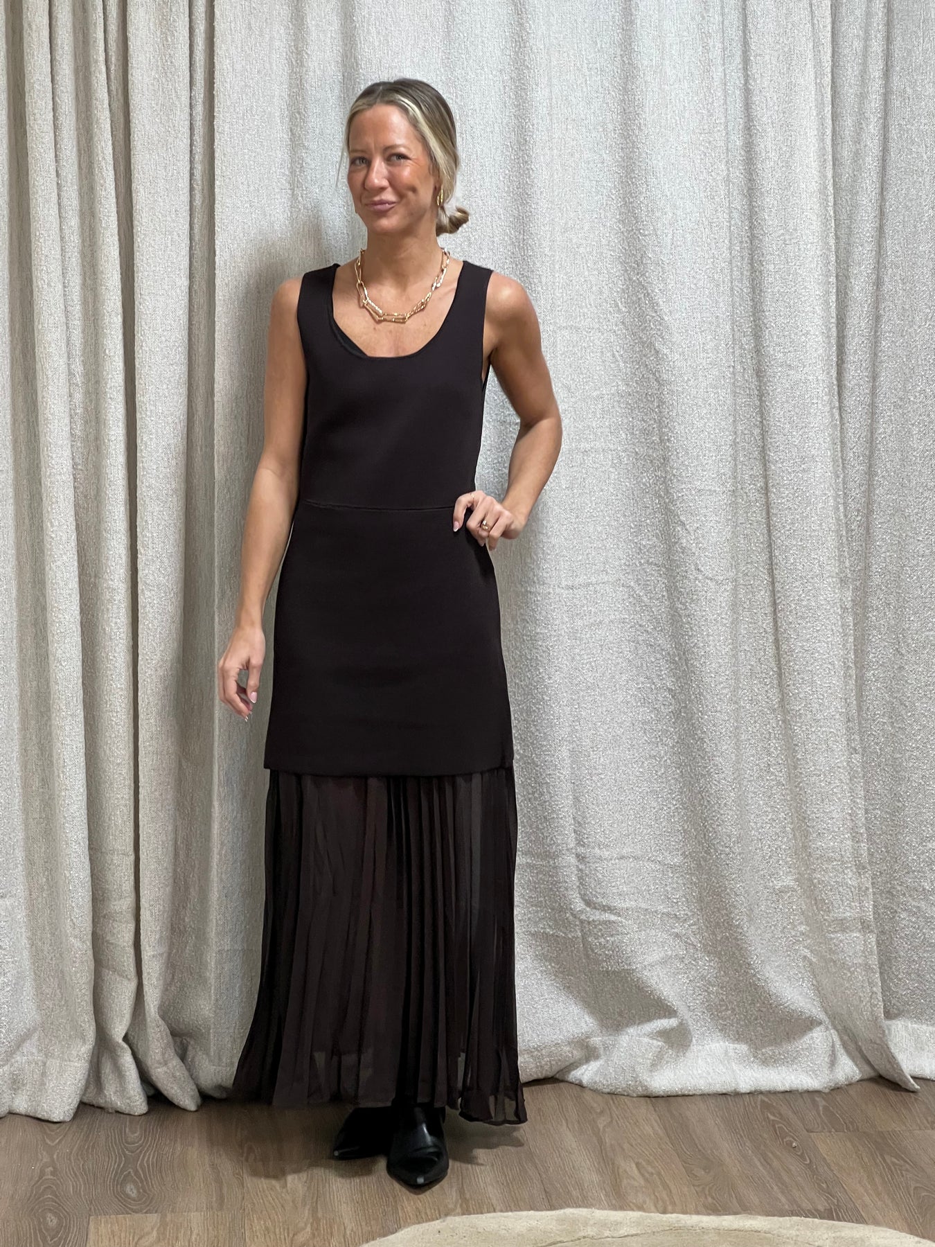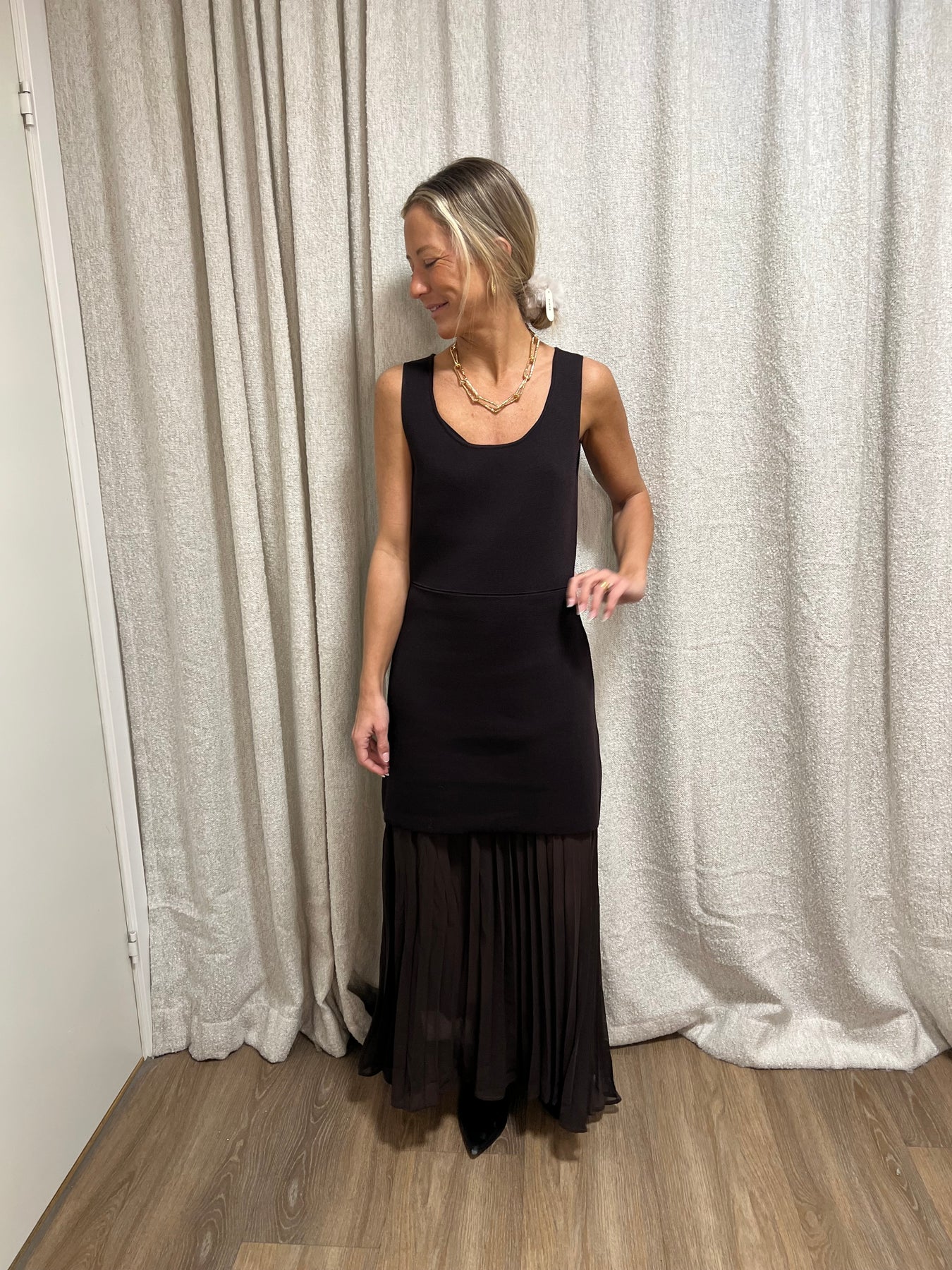 Så fin kjol med plisserad klänning fast under! Normal i storlek och Jessika bär s/m