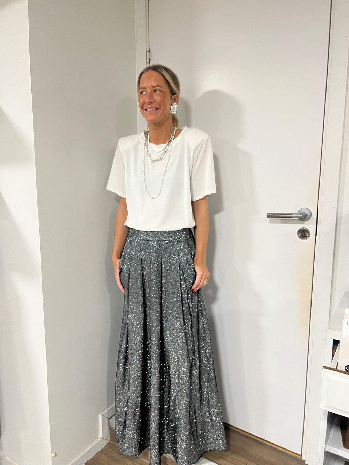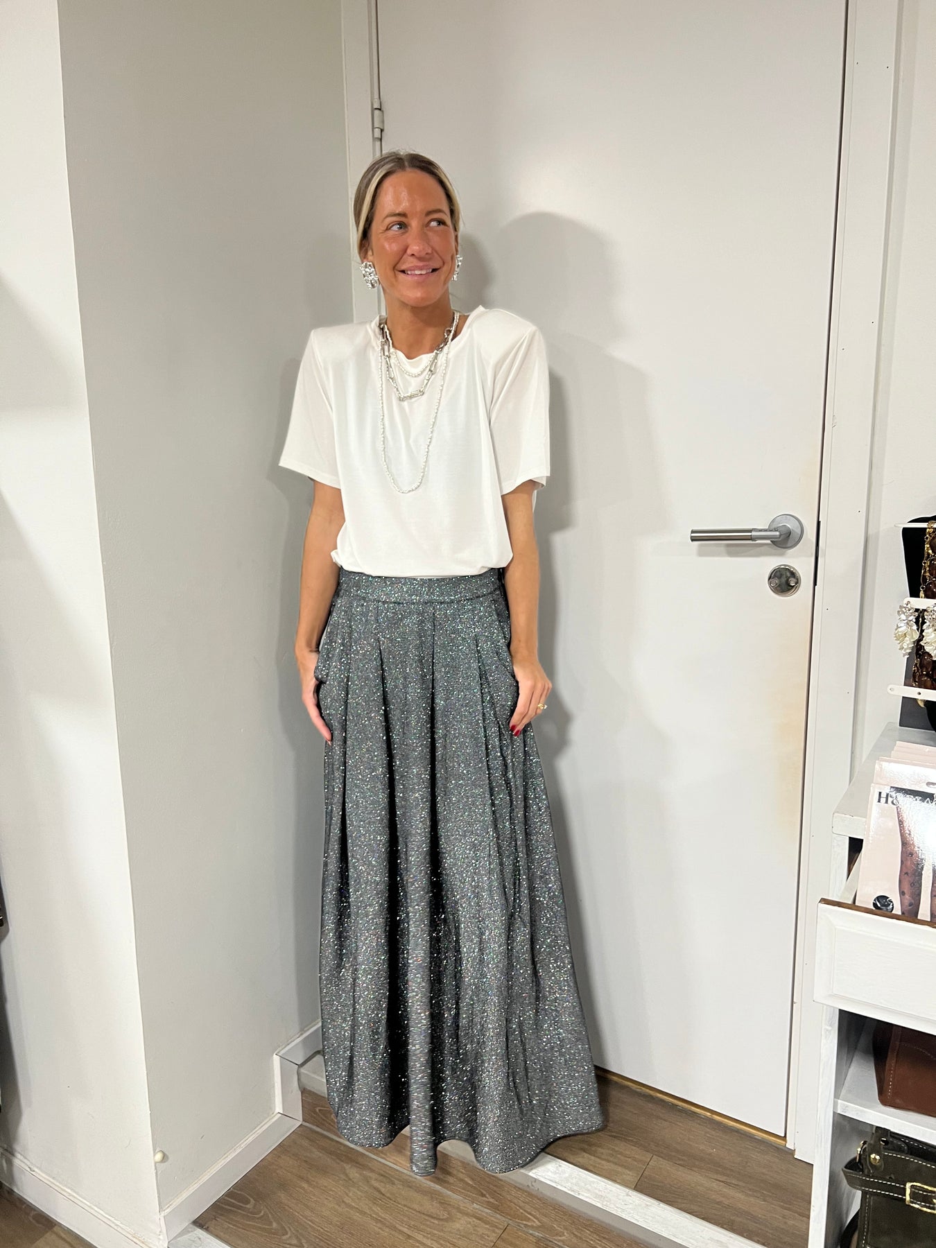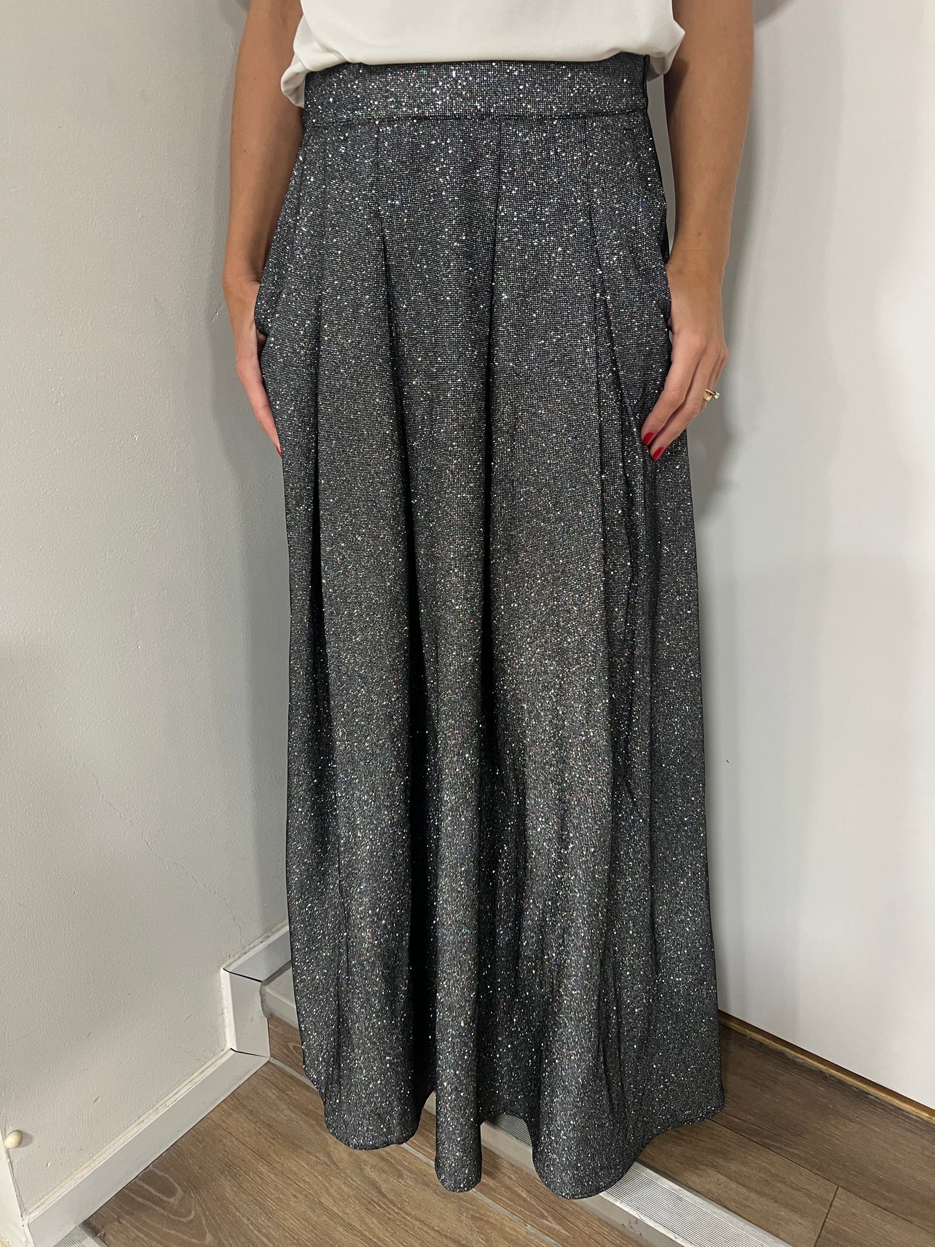 En riktig party kjol till alla fester och nyår, svart med silver glitter .Lagda veck fram till och fickor i sidan kort underkjol sitter fast under kjolen