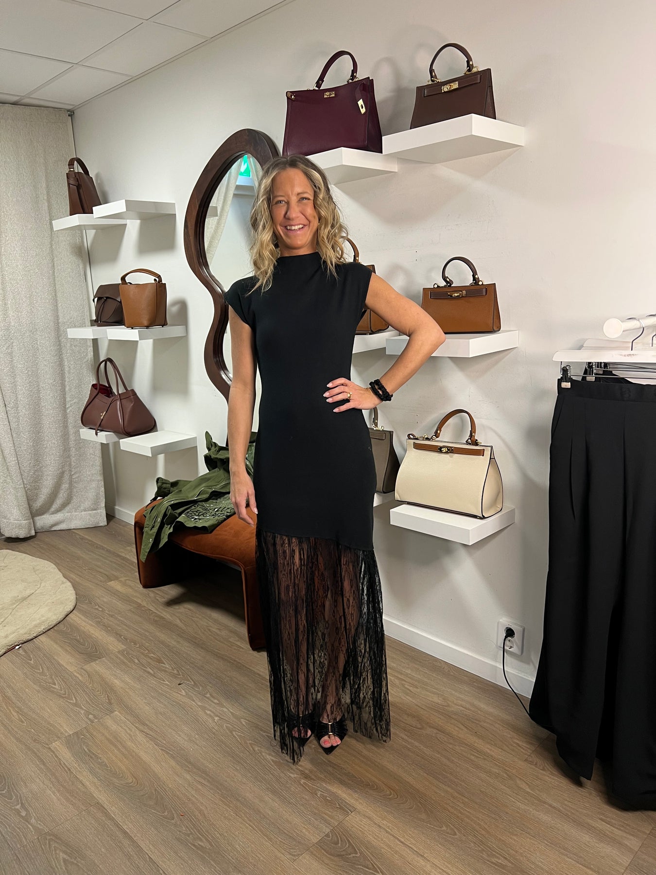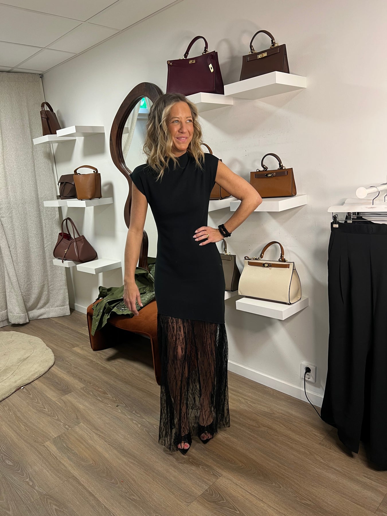 Super fin klänning i stickad kvalité med snedskuren spetts nedtill 50% viscose 28% polyester 22% nylon
