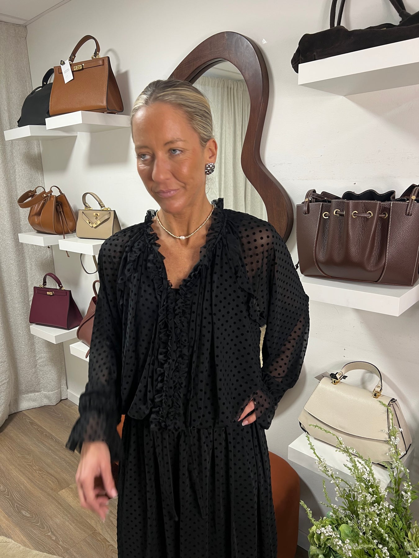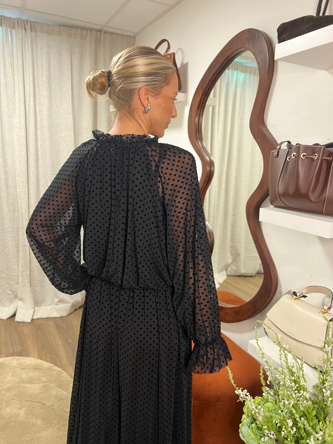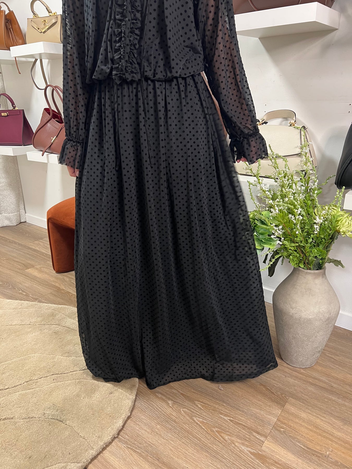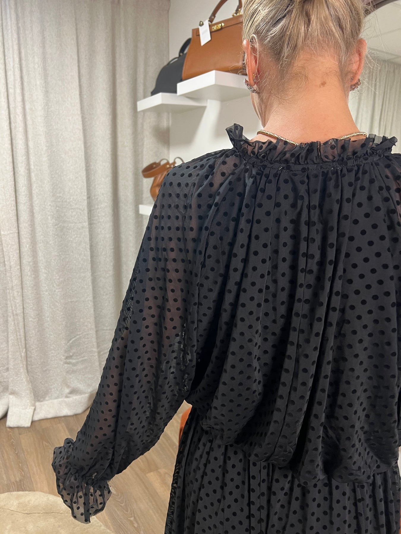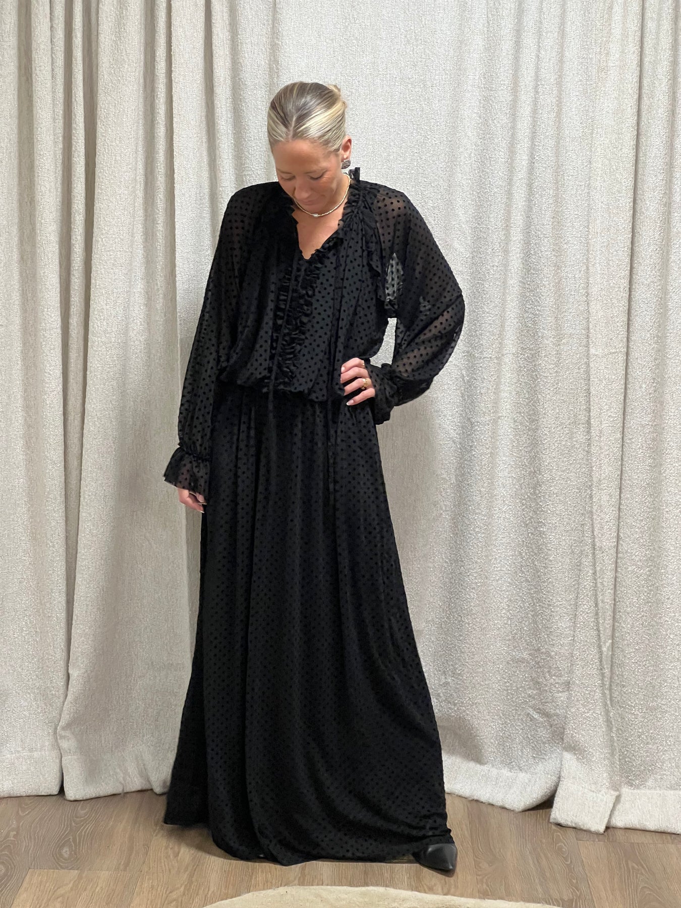 En festlig klänning i ett tunnare material med sammetspricksr tryckta I tyget , Resår som är lite stretchigt i midjan Fast du väljer din vanliga storlek materialet är 100 % polyester