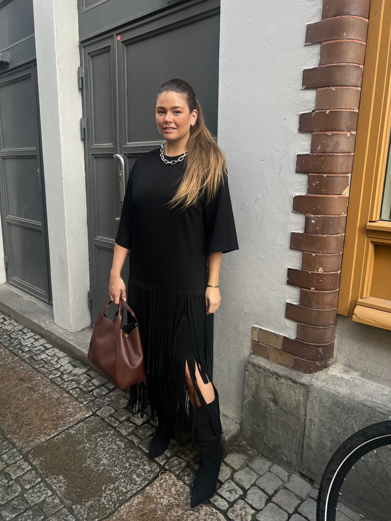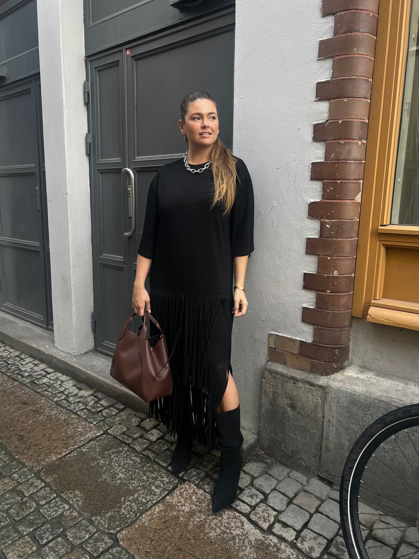 Superhärlig klänning i mjukt college material Med fransar nertill en storlek passar 34 till 4055% Polyester 39% Viscose 6% Elasthanne