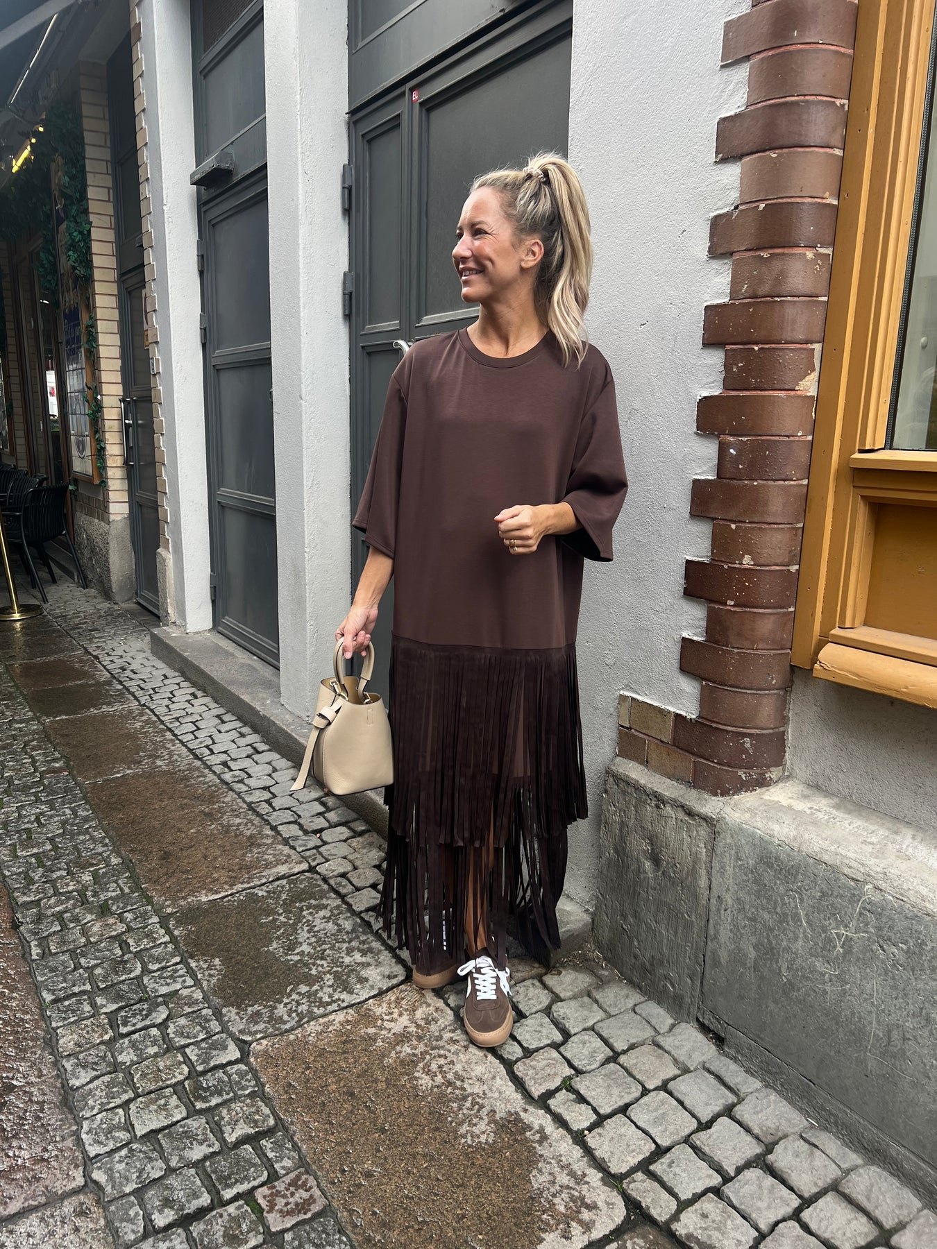 Superhärlig klänning i mjukt college material Med fransar nertill en storlek passar 34 till 40
