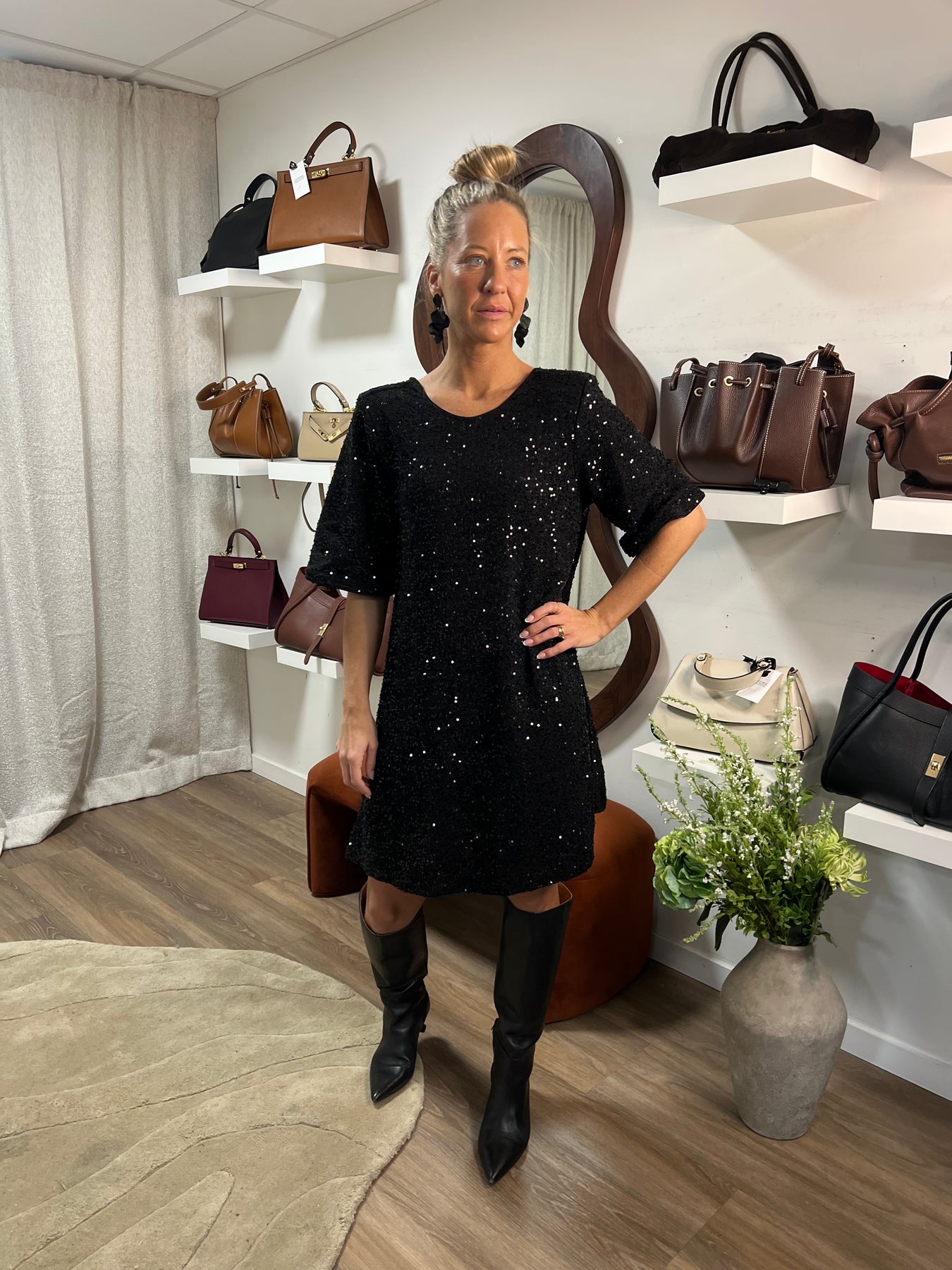 Perfekta festklänningen med paljetter och fodrad normal i storleken. Klänningen kan användas åt båda hållen rosett fram till och även baktill 100 % polyester