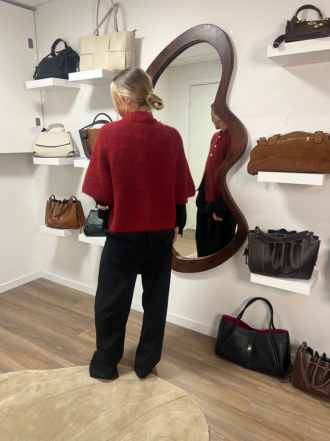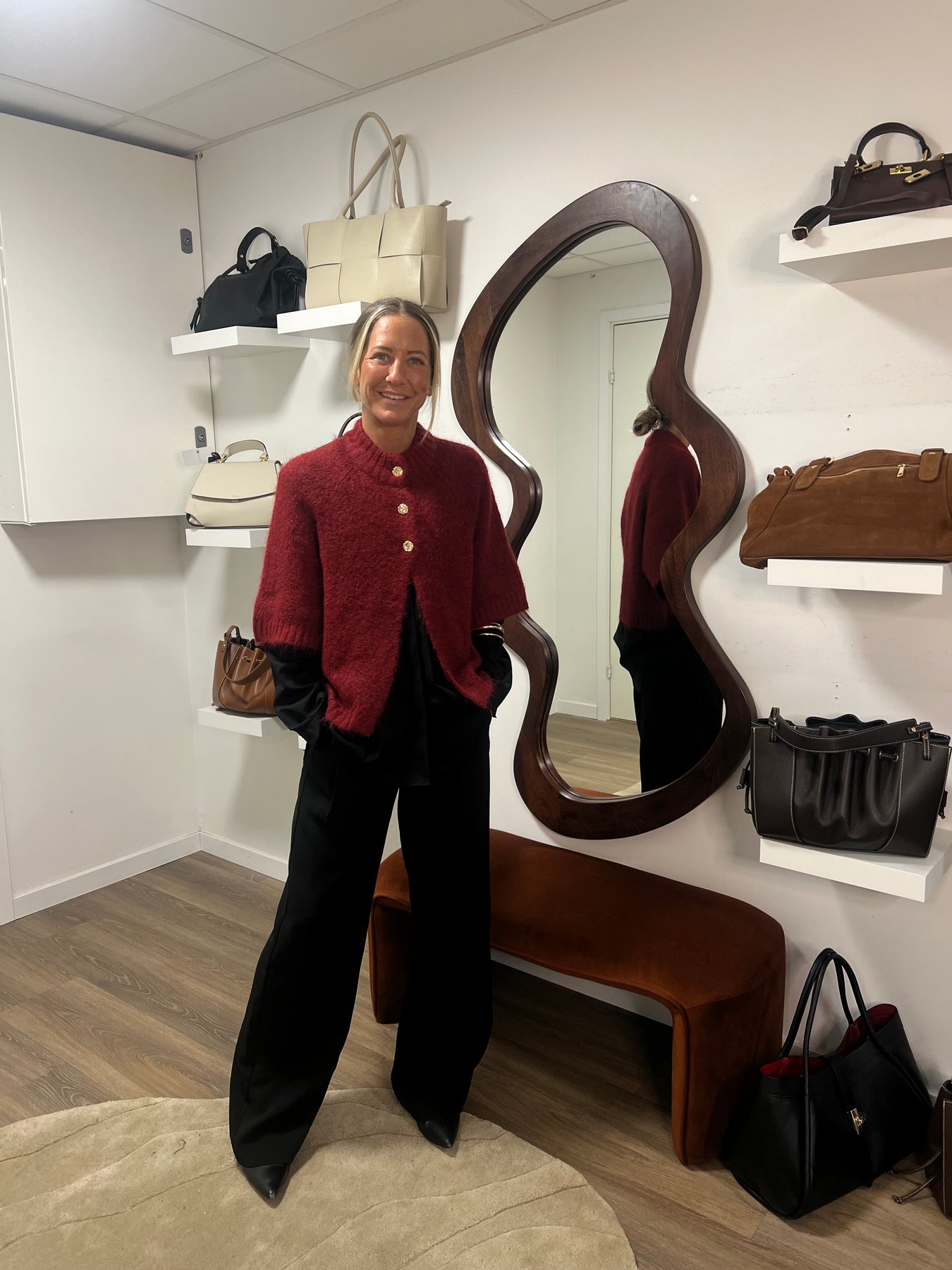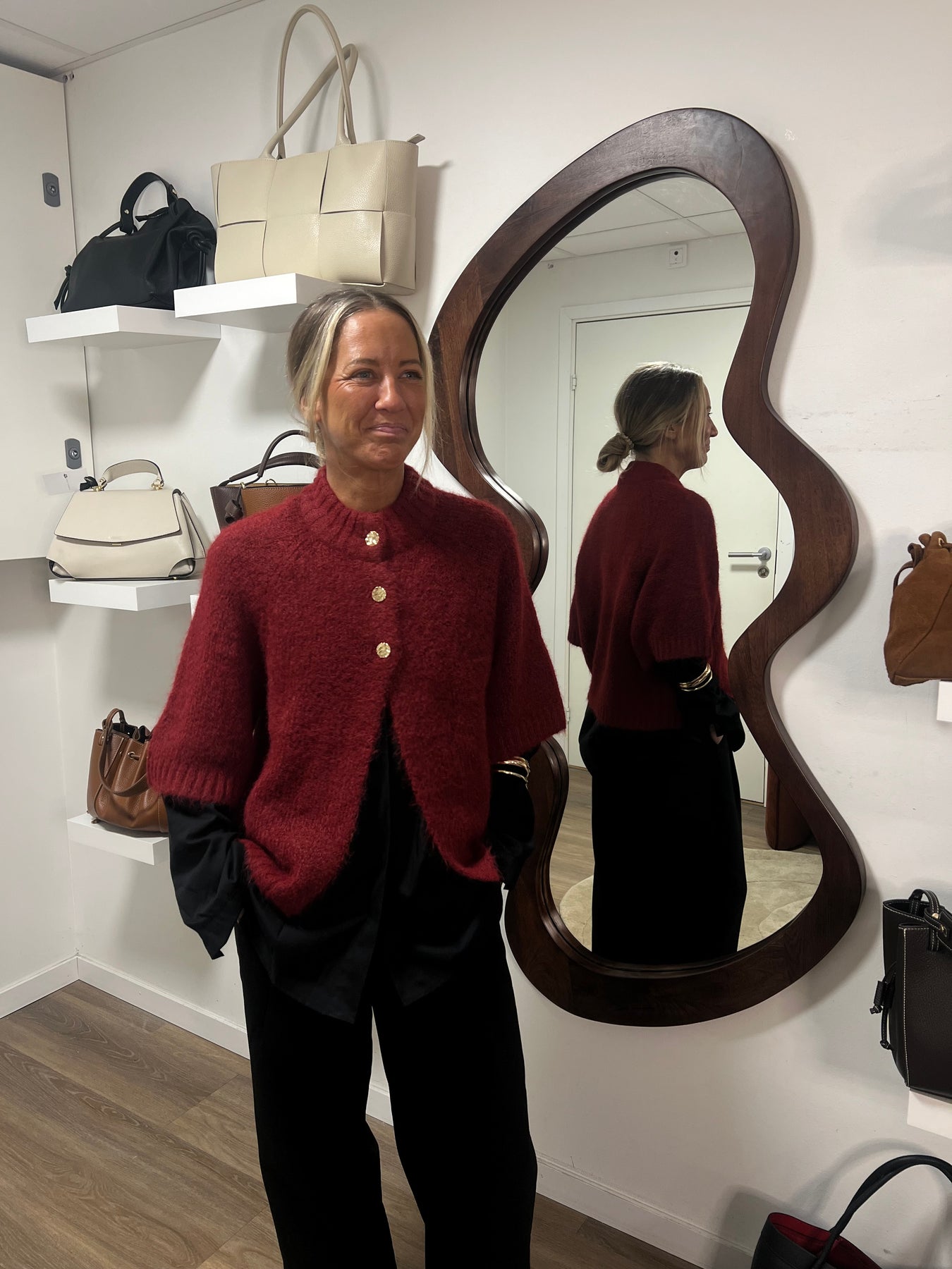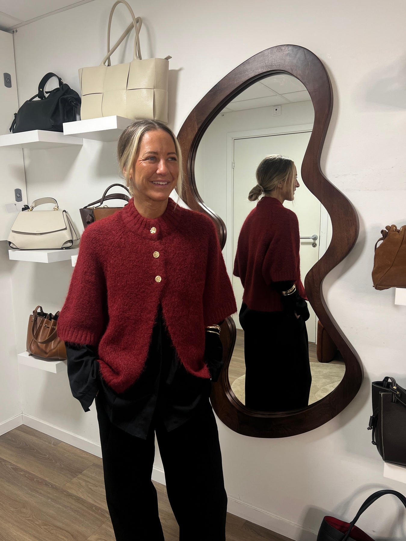 Stickad Cap-kofta tre guldknappar fram till och öppen ner till , normal i storleken. Materialet är 70 % polyester 21 % nylon, 8 % ull 1 % elastan