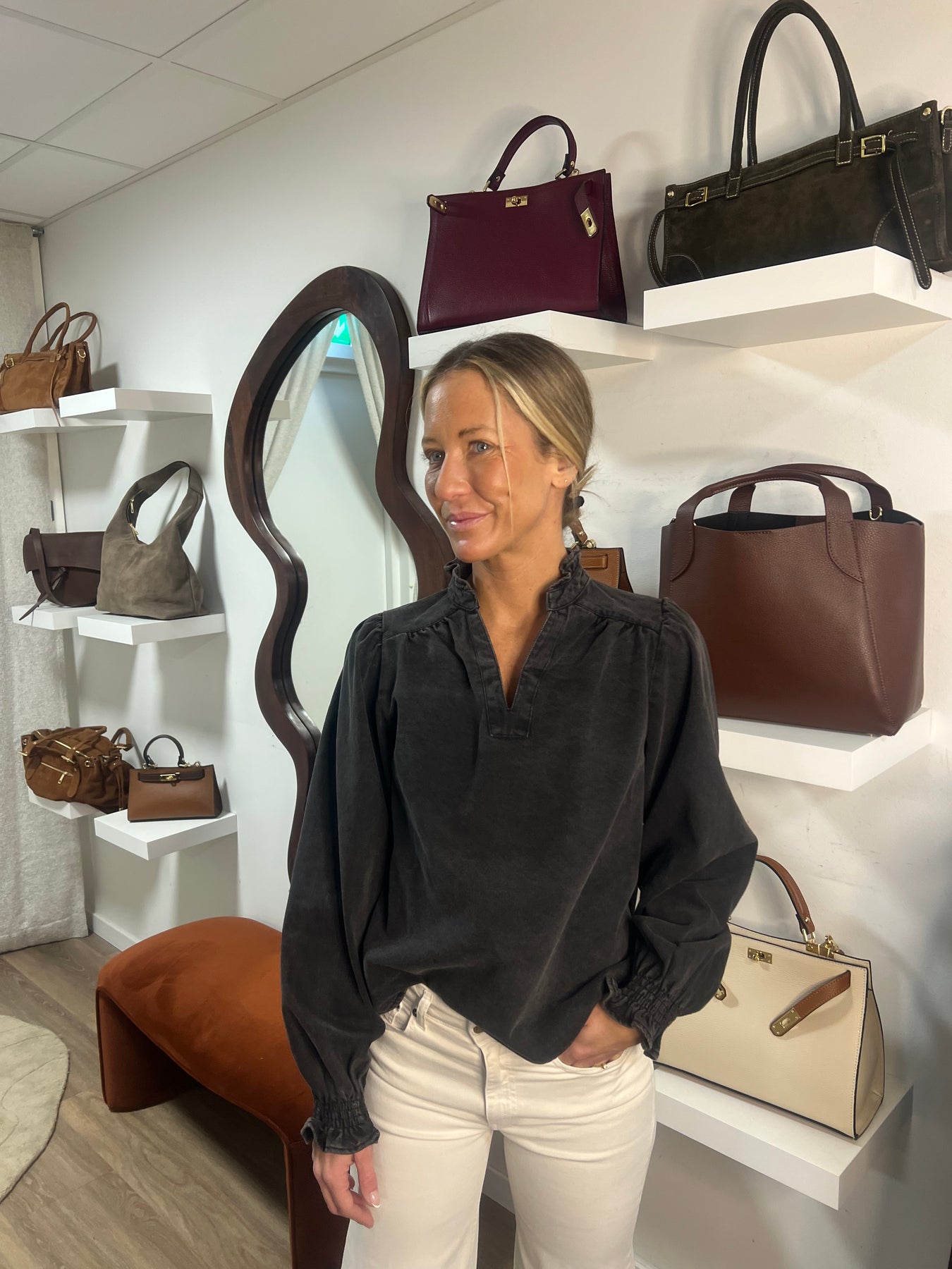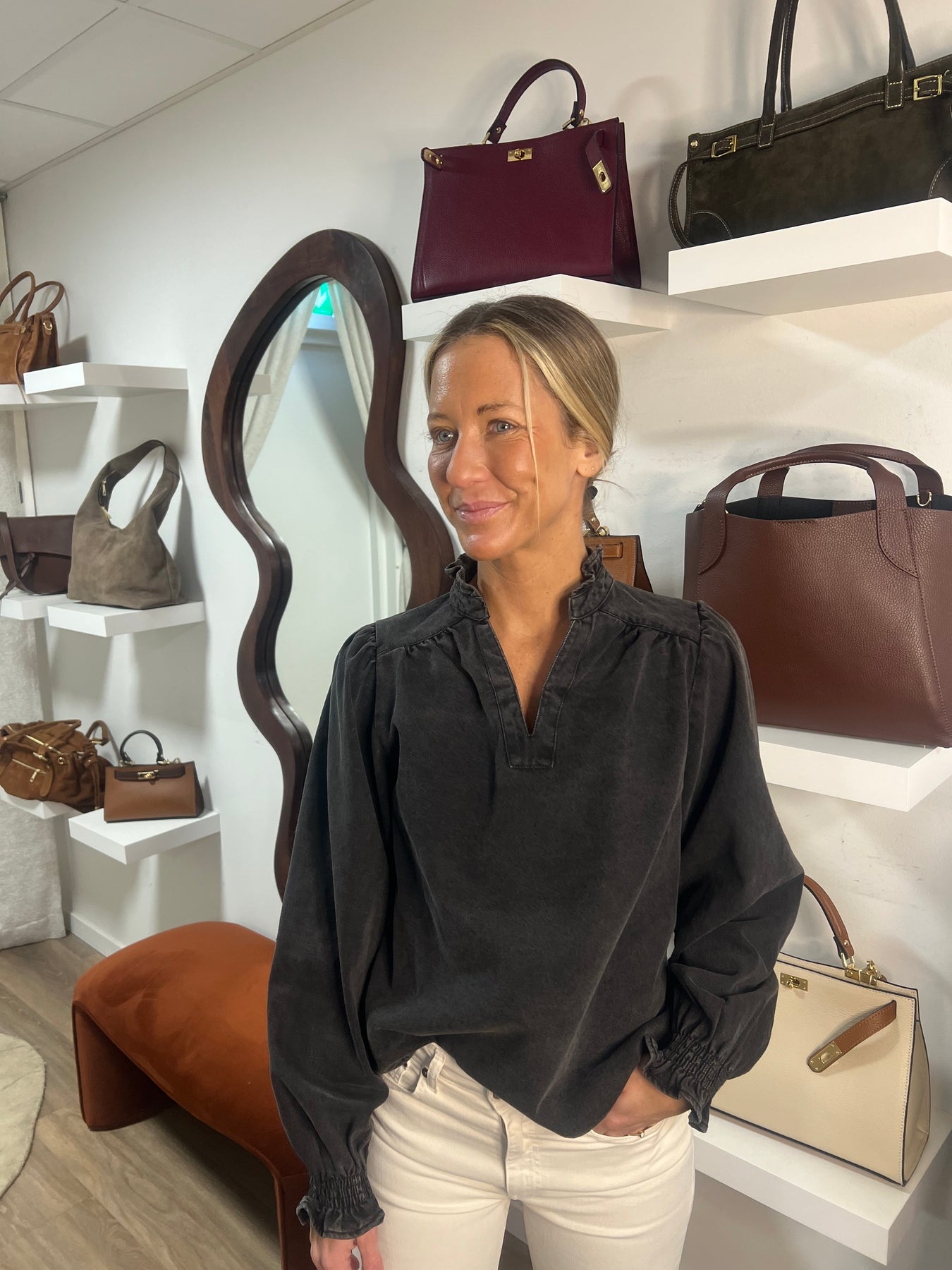 V ringad denim blus med volang i halsen och vid armslut.