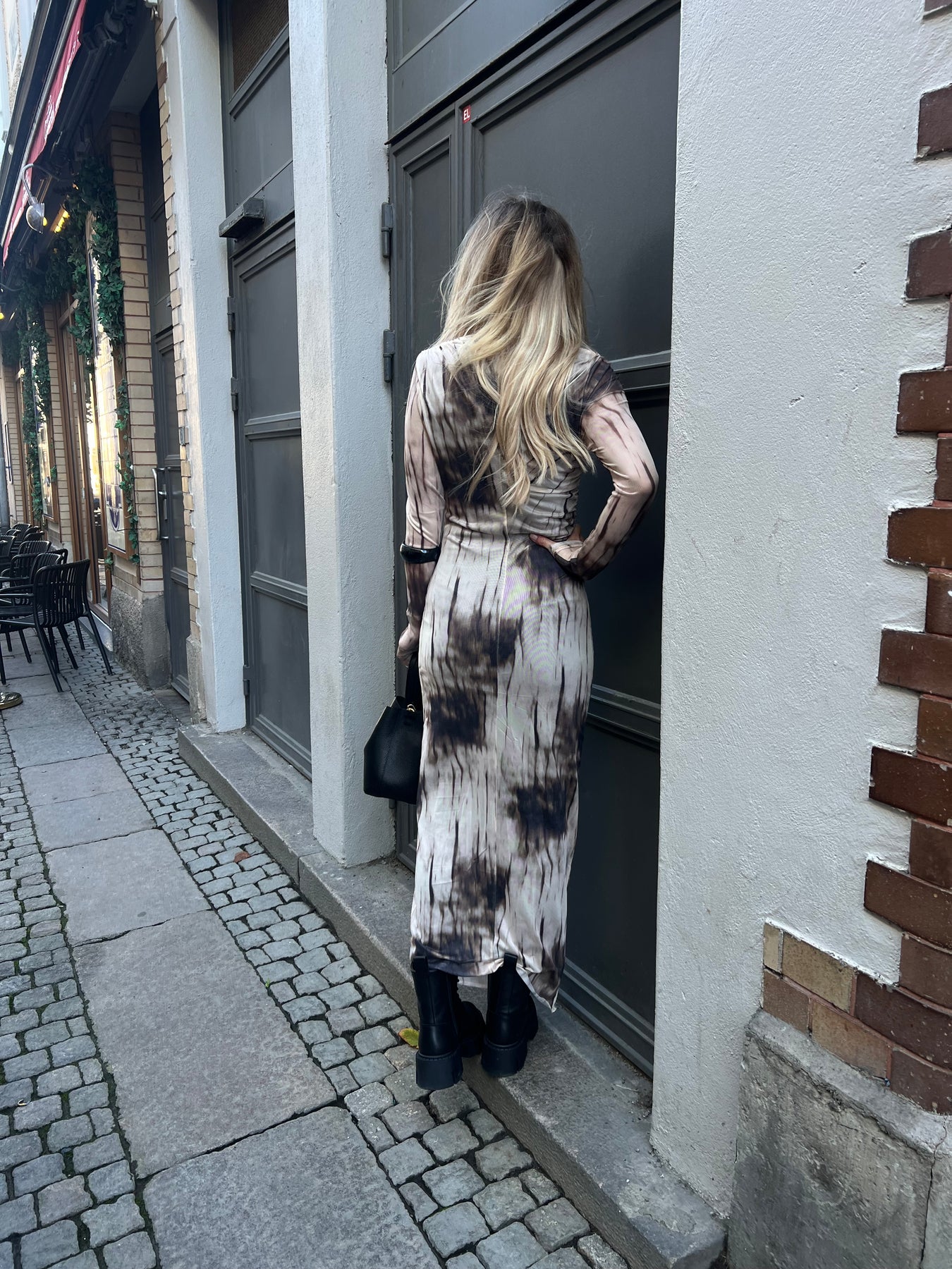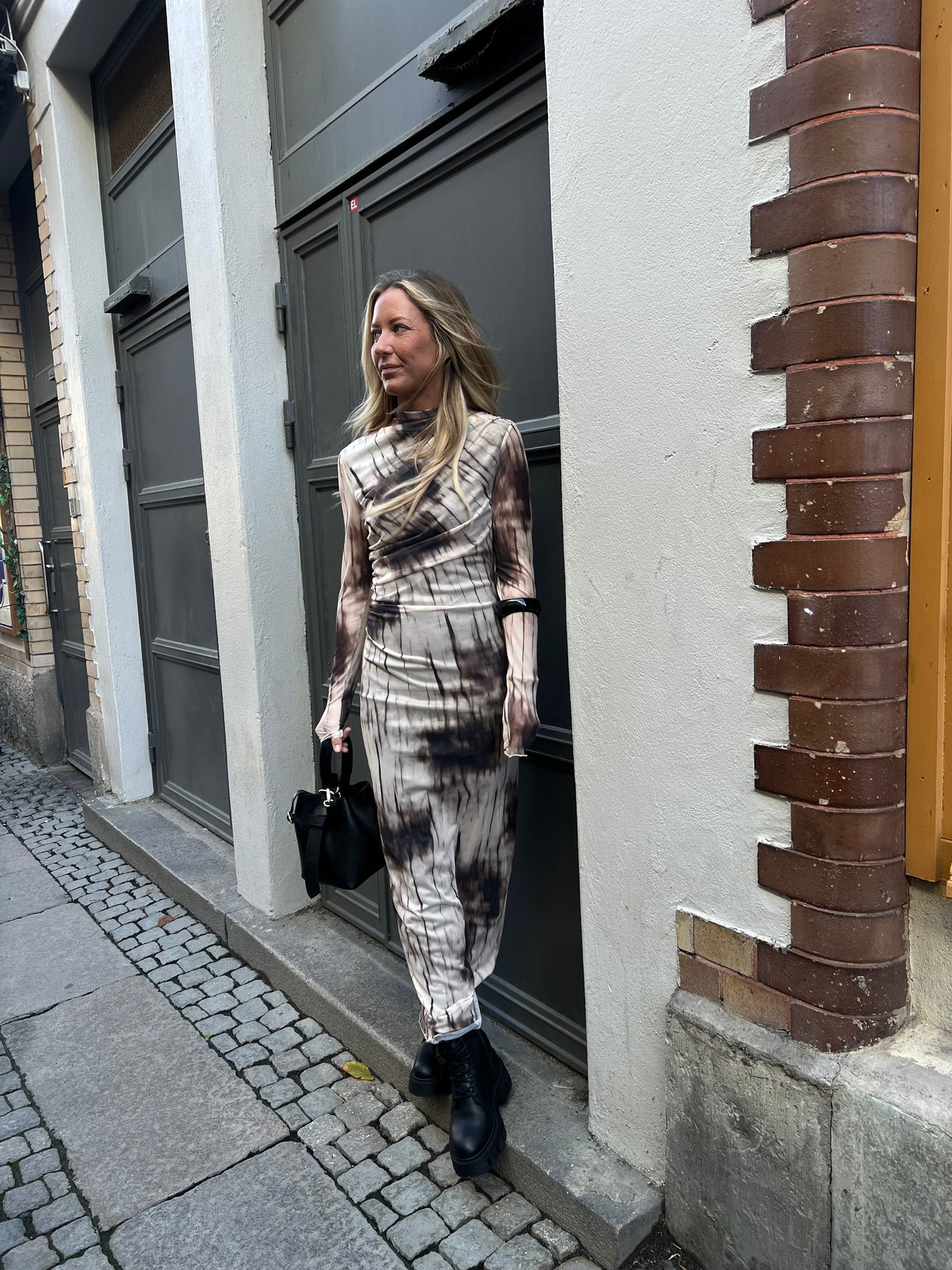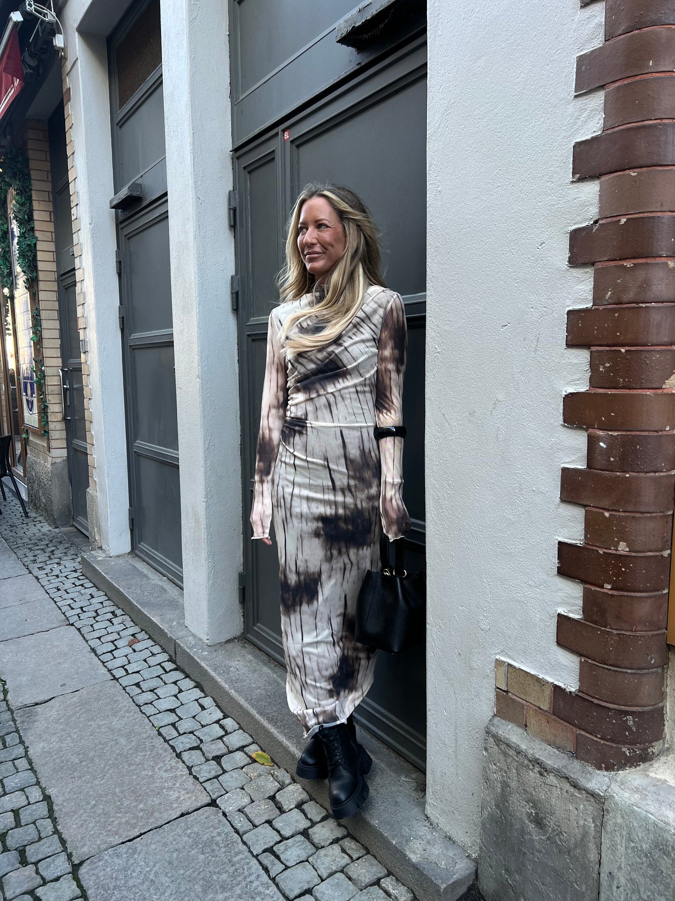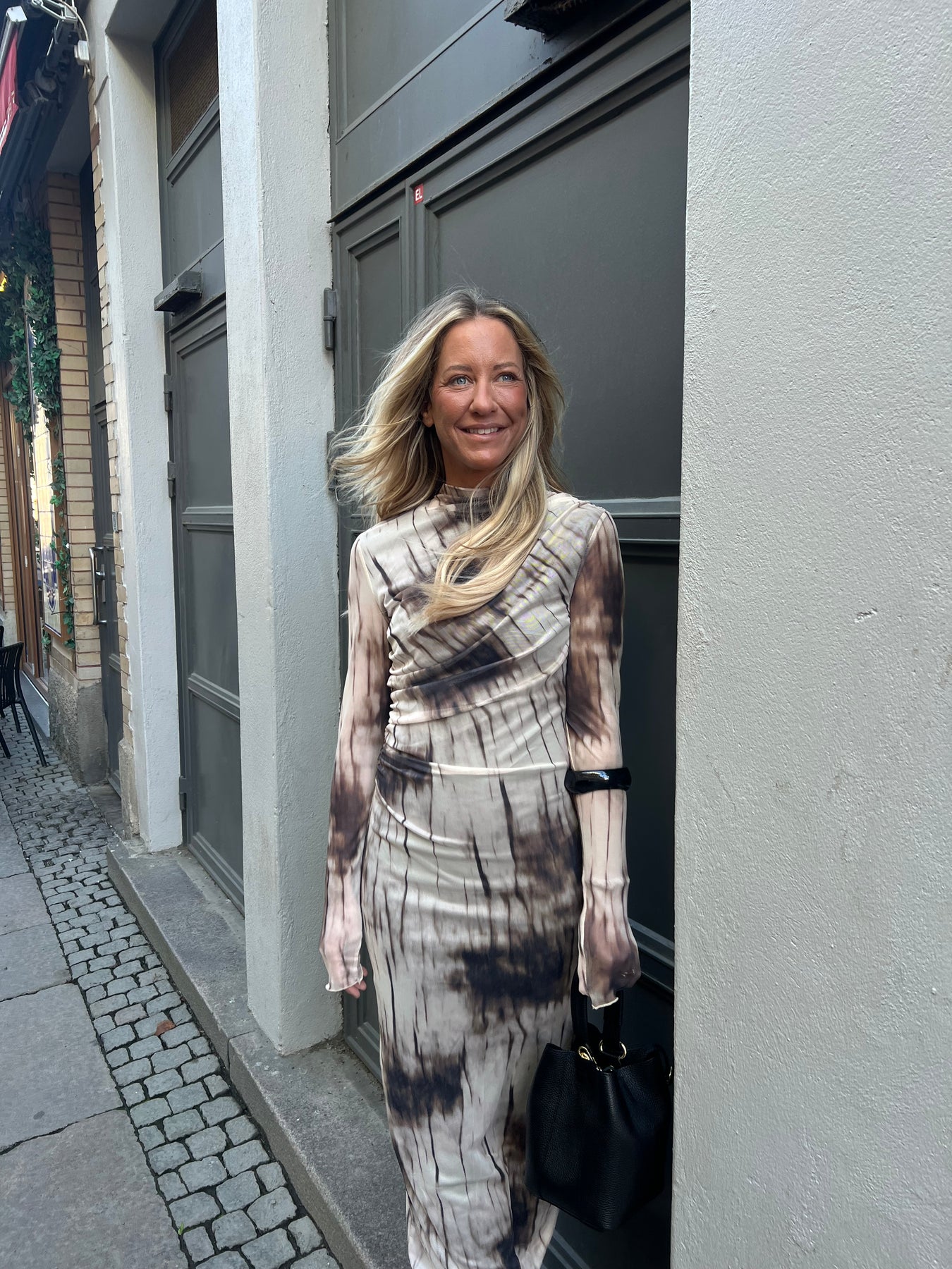 Lång meshklänning, draperad fram till.