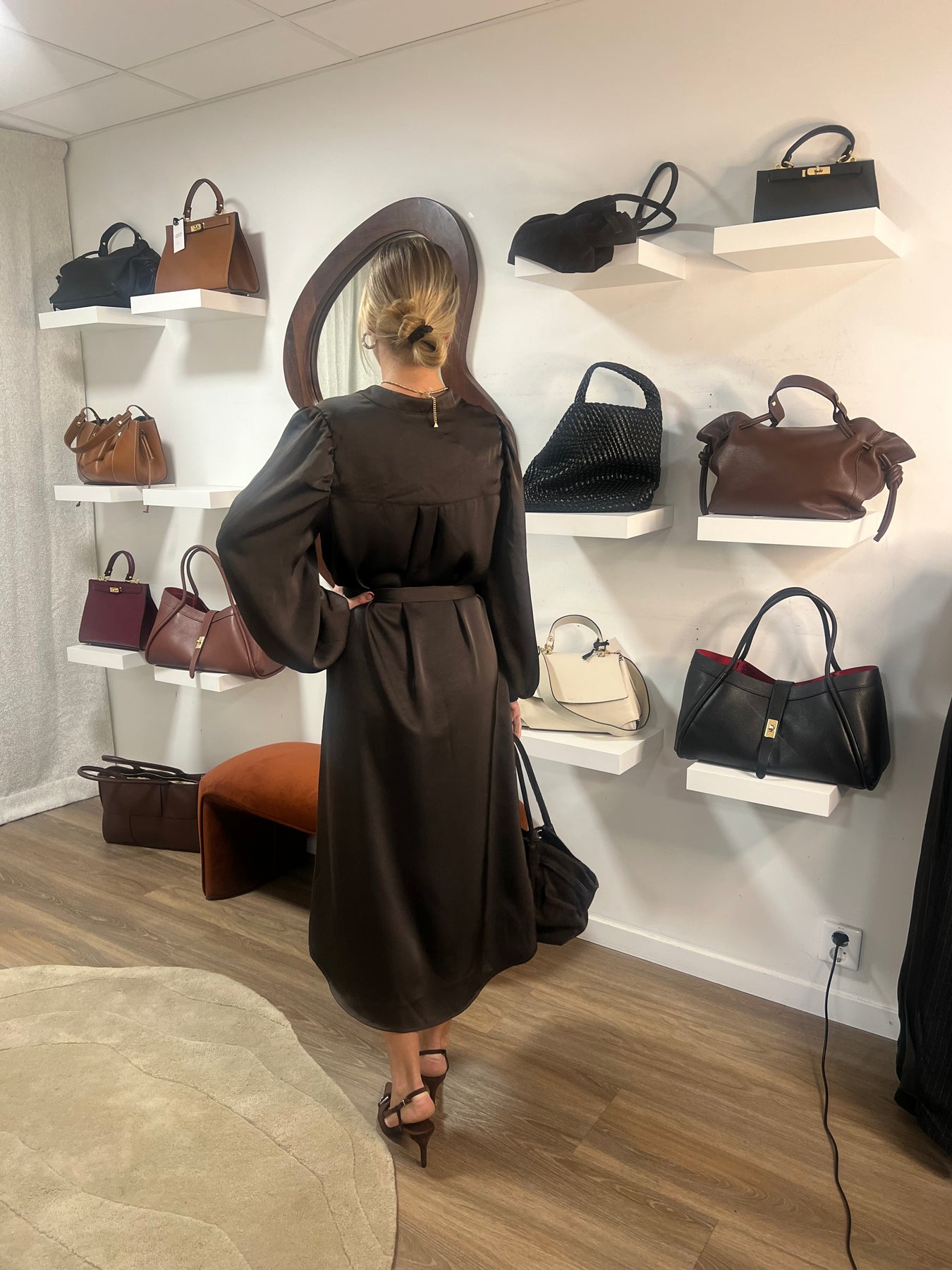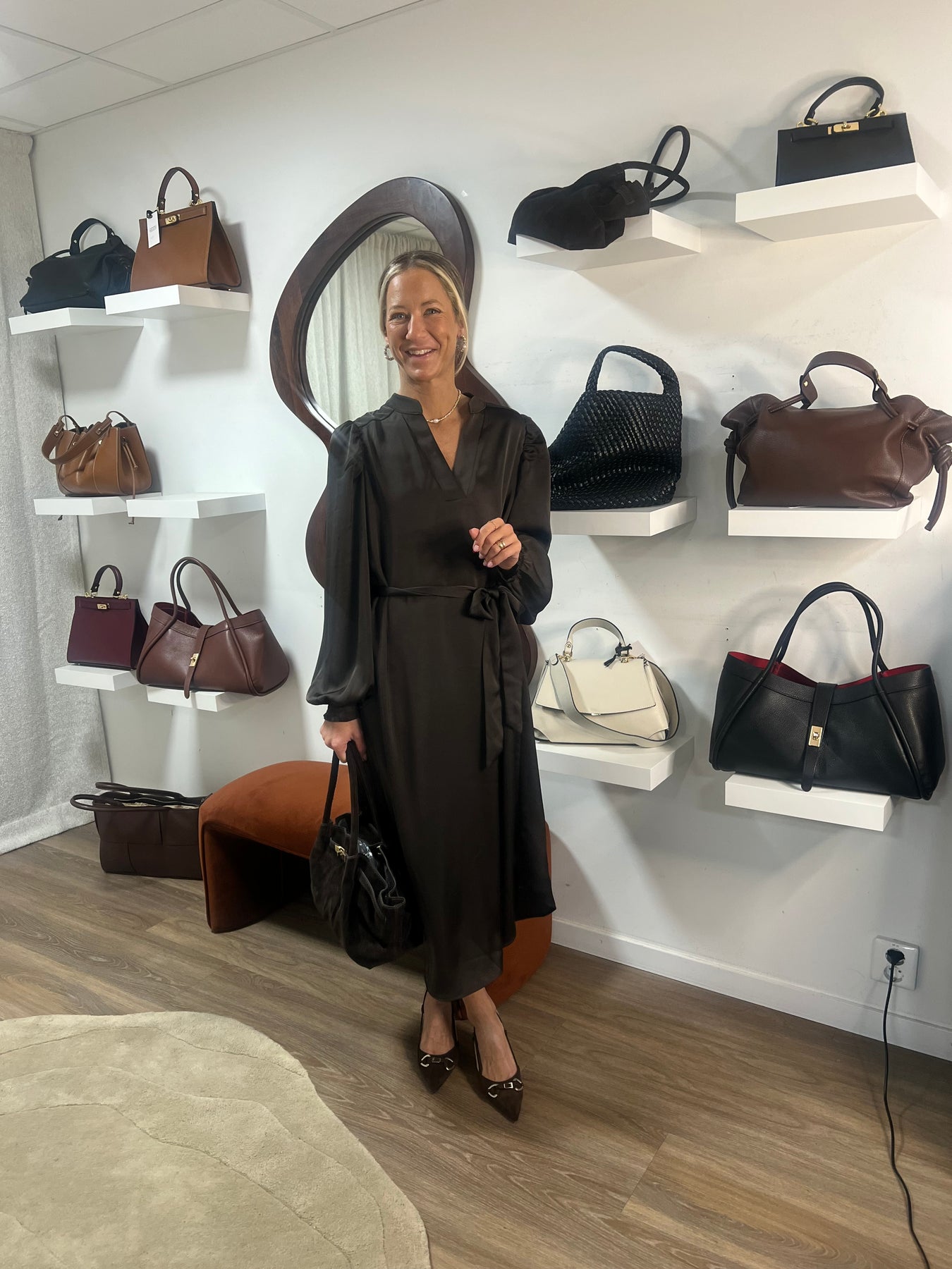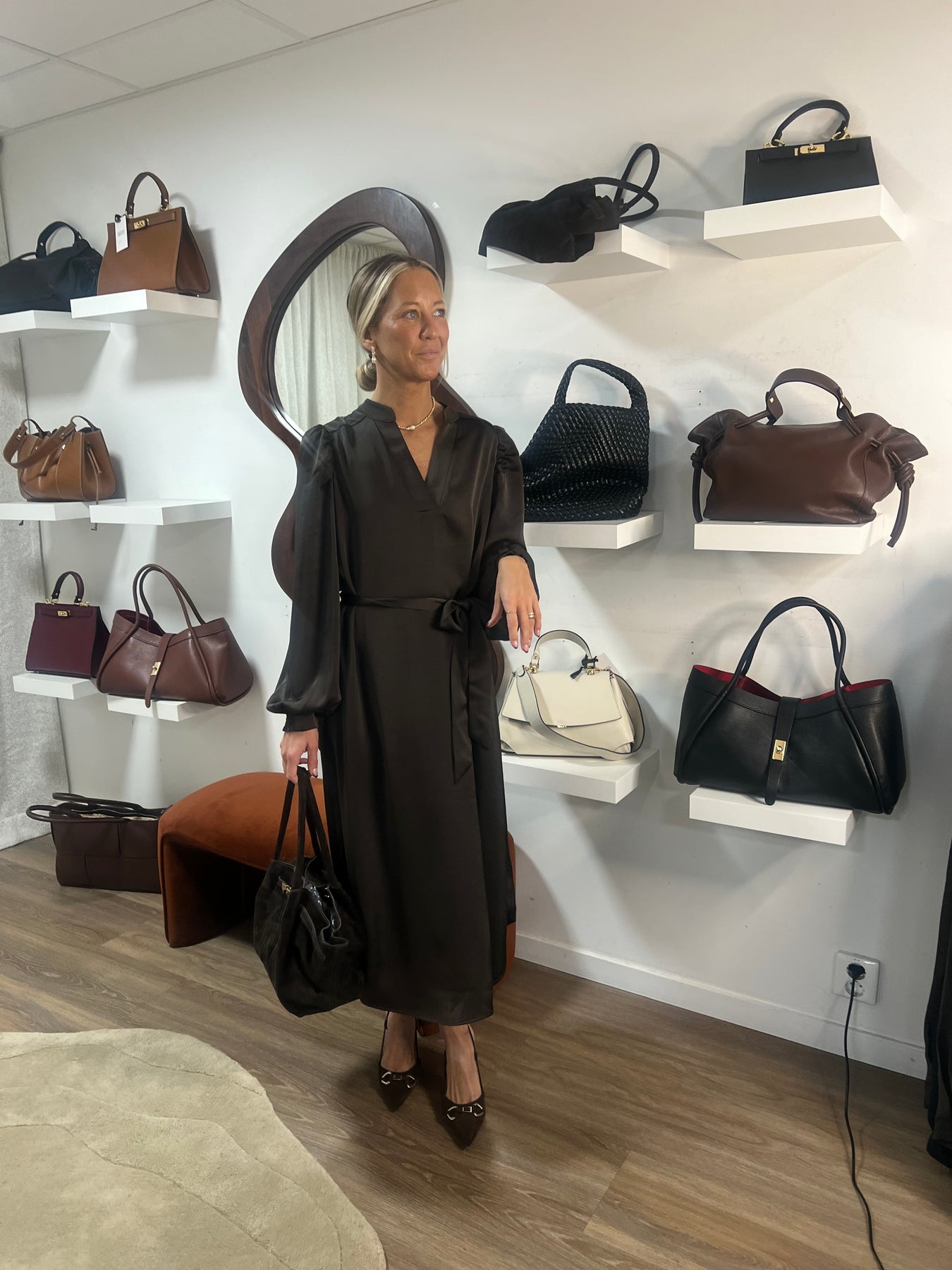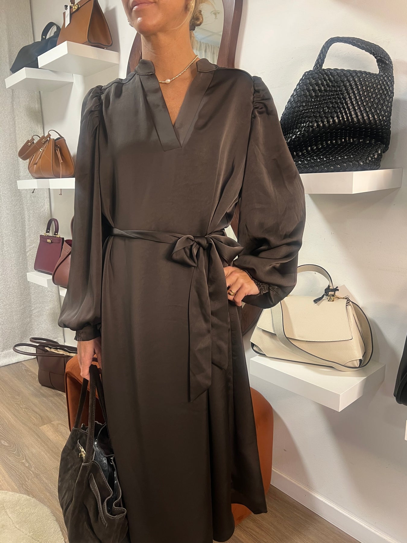Snygg klassisk klänning v ring i halsen band som du knyter i midjan normal i storleken. Materialet är 97 % polyester 3 % elastan