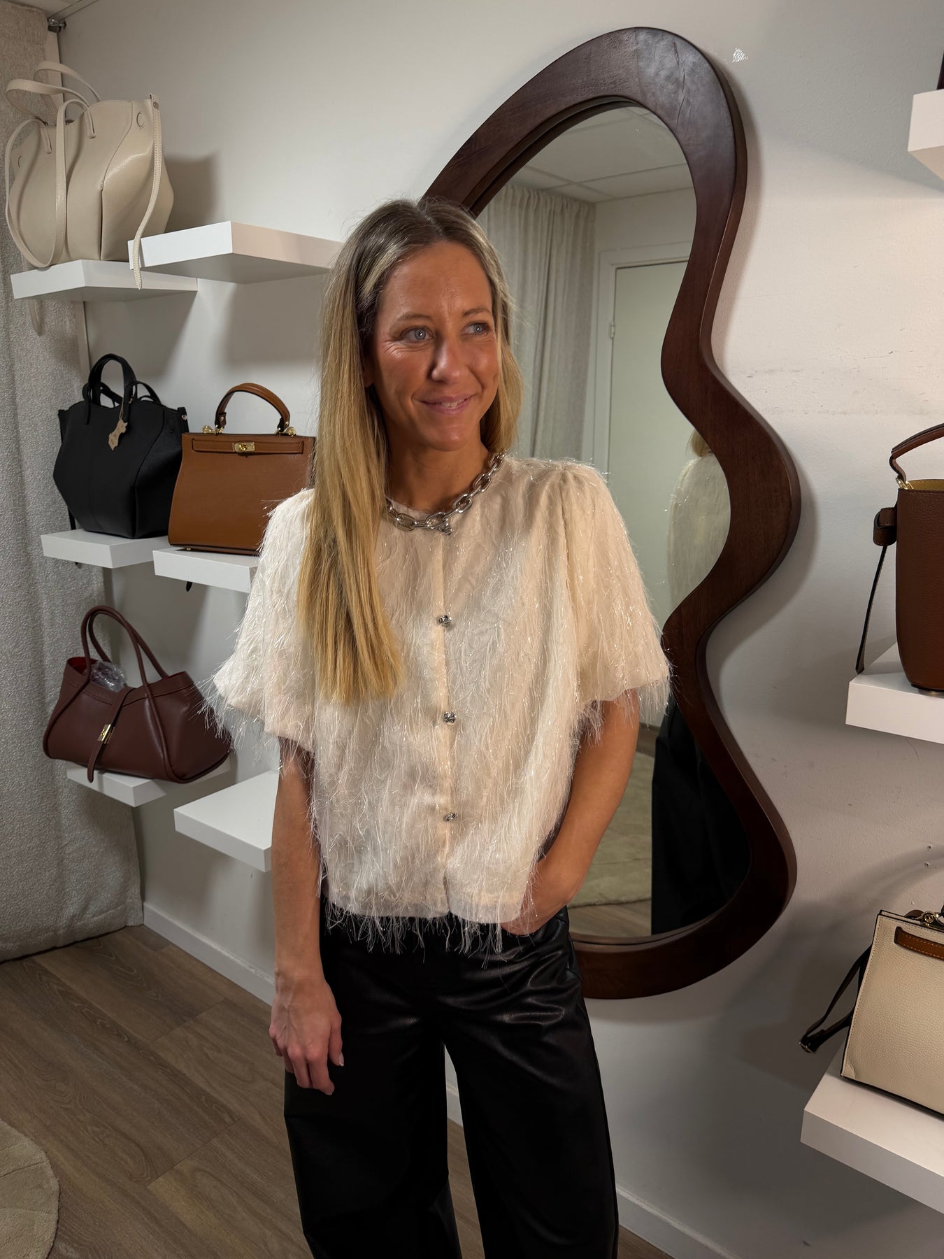 Festligare topp med blom applikationer i tyll som täcker hela blusen, silvriga knappar fram