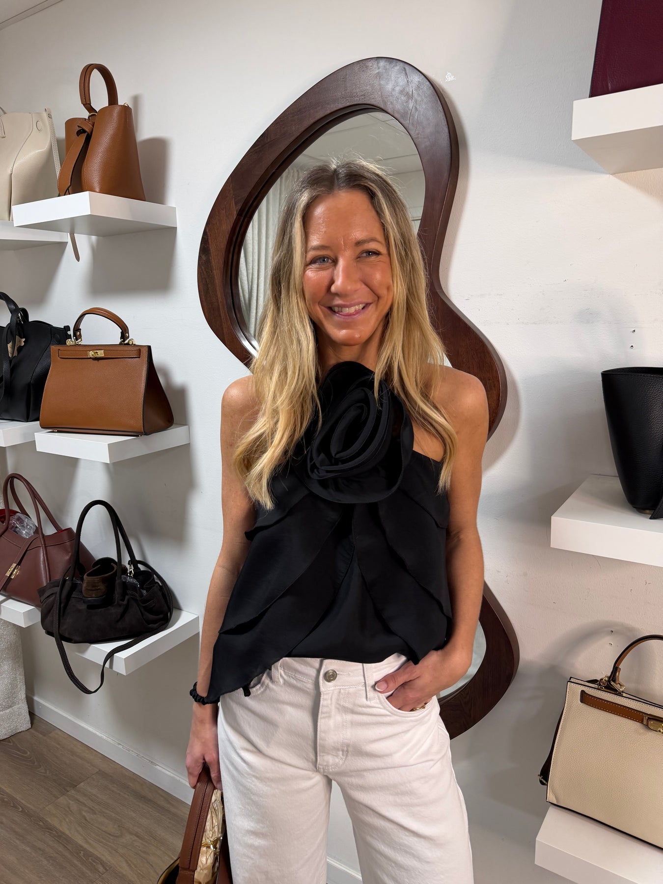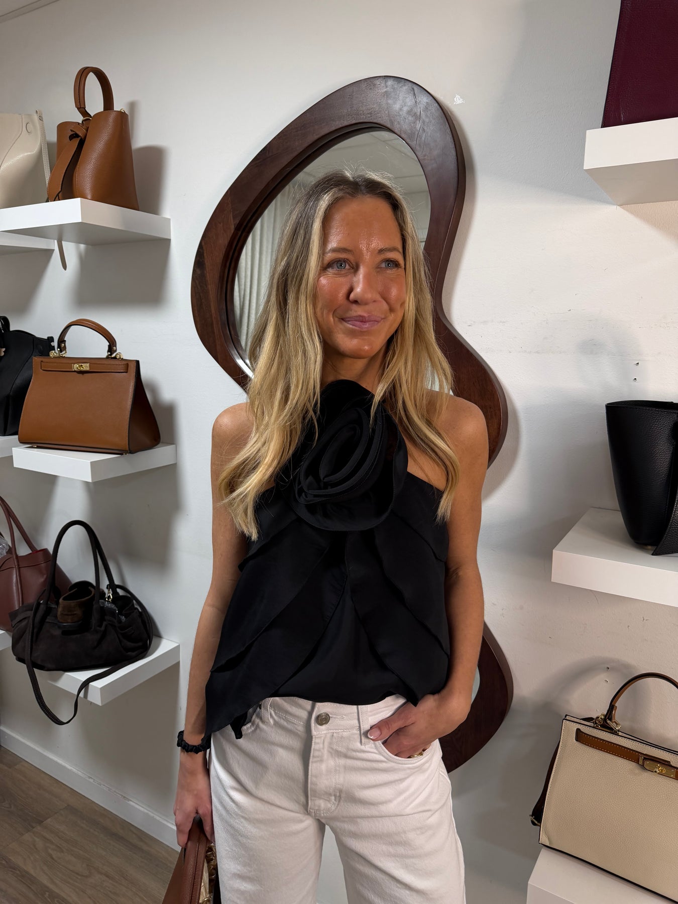 Halterneck topp med tunna axelband med en stor ros applikation i mitten, lager på lager drapering för ett elegant fall. normal i storleken