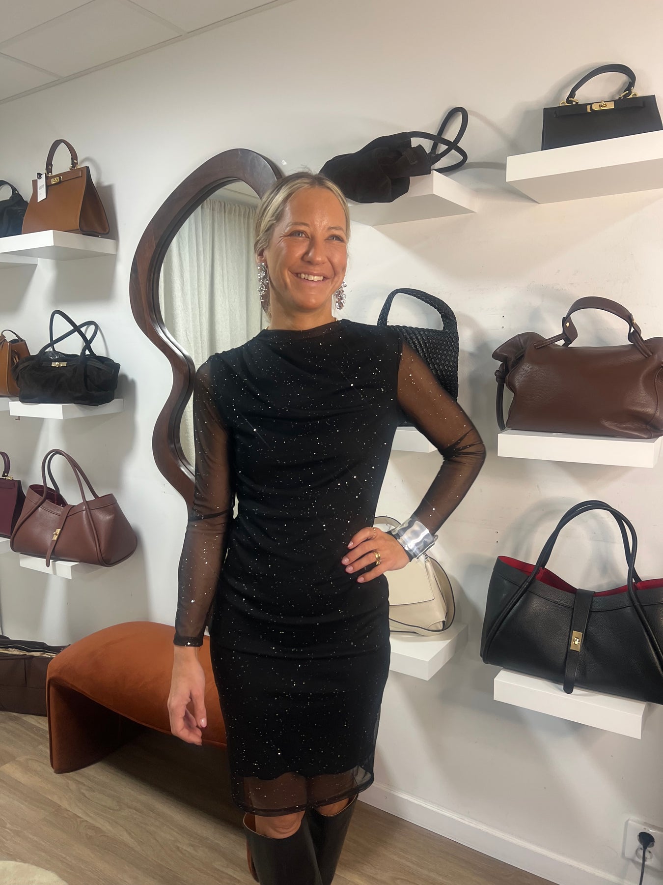 Lite tajtare mesh klänning med foder, glitter inslag i tyget och rynkade detaljer på axlar, armar och i midja.