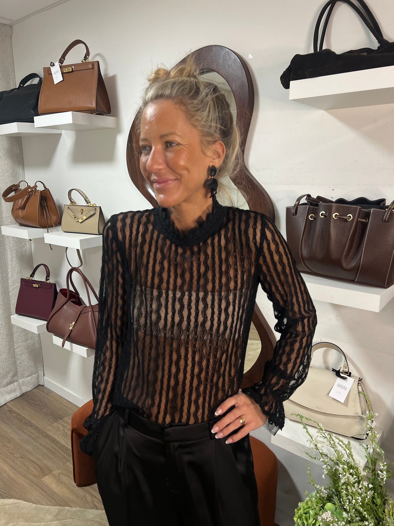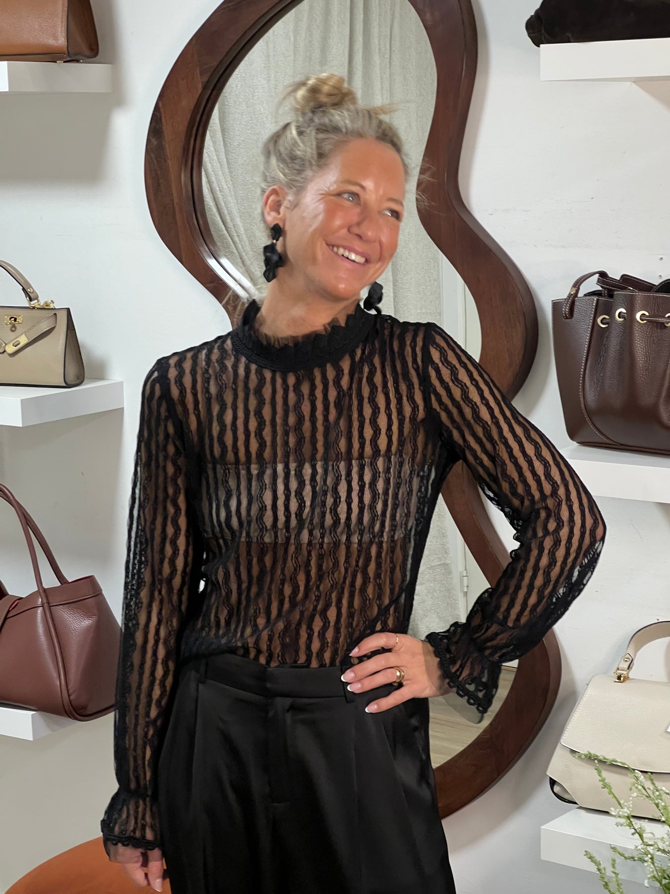 Lite tajtare spets topp med underliggande mesh Liten spetskant längs hal Sq Aunt, med knapp, baktill, resår och volang kant längst ner vid ärmslutet  normal storleken