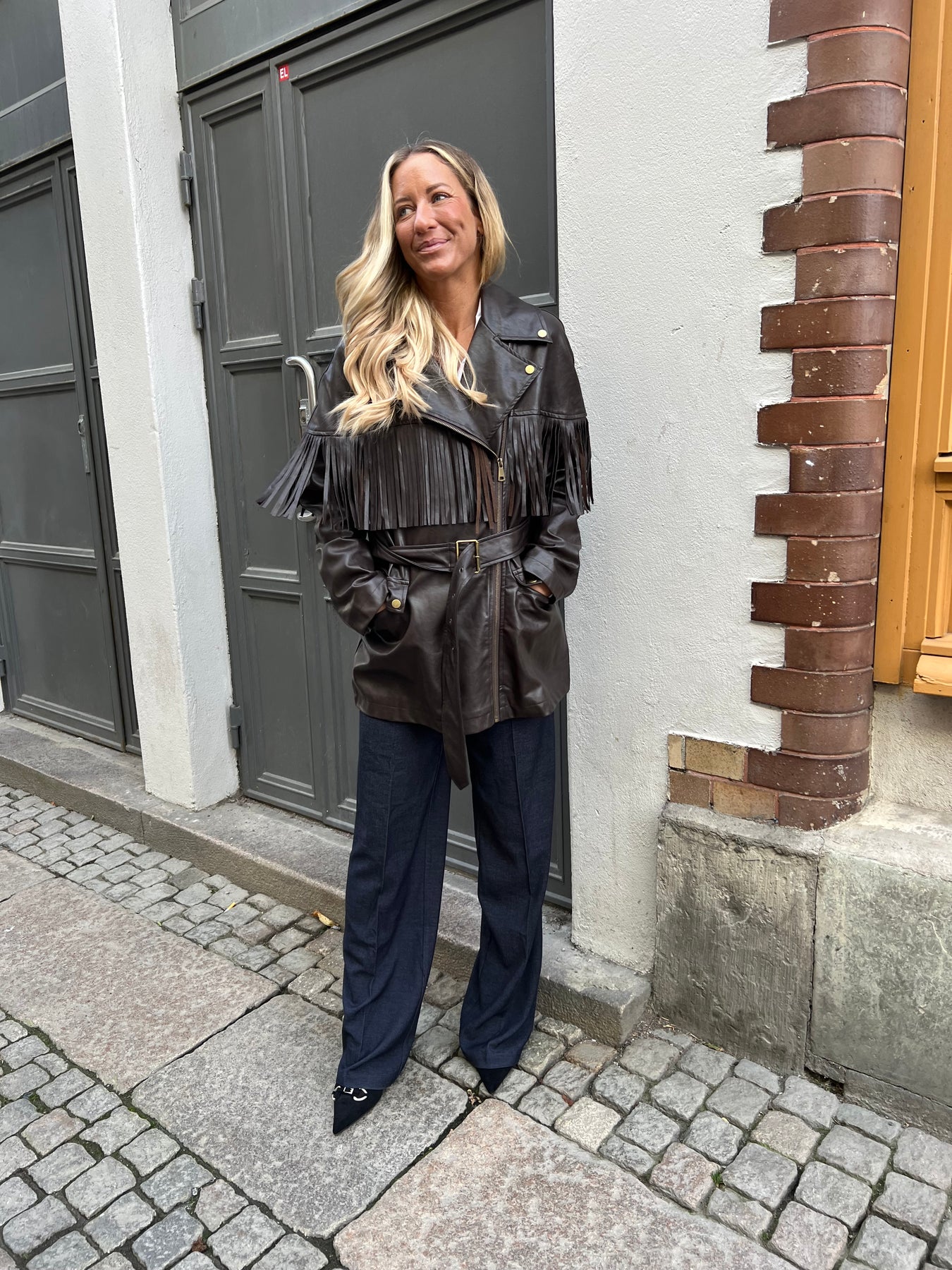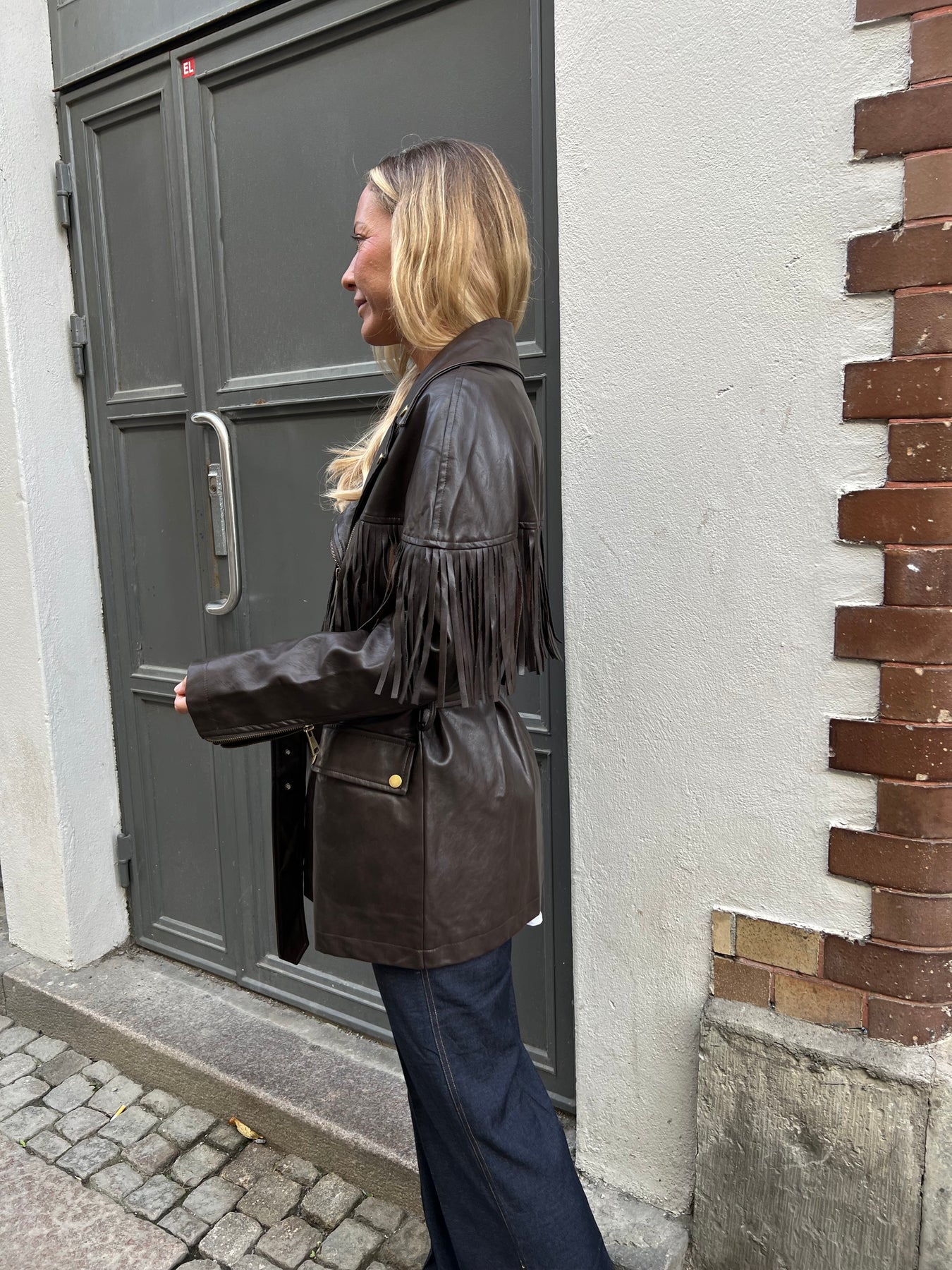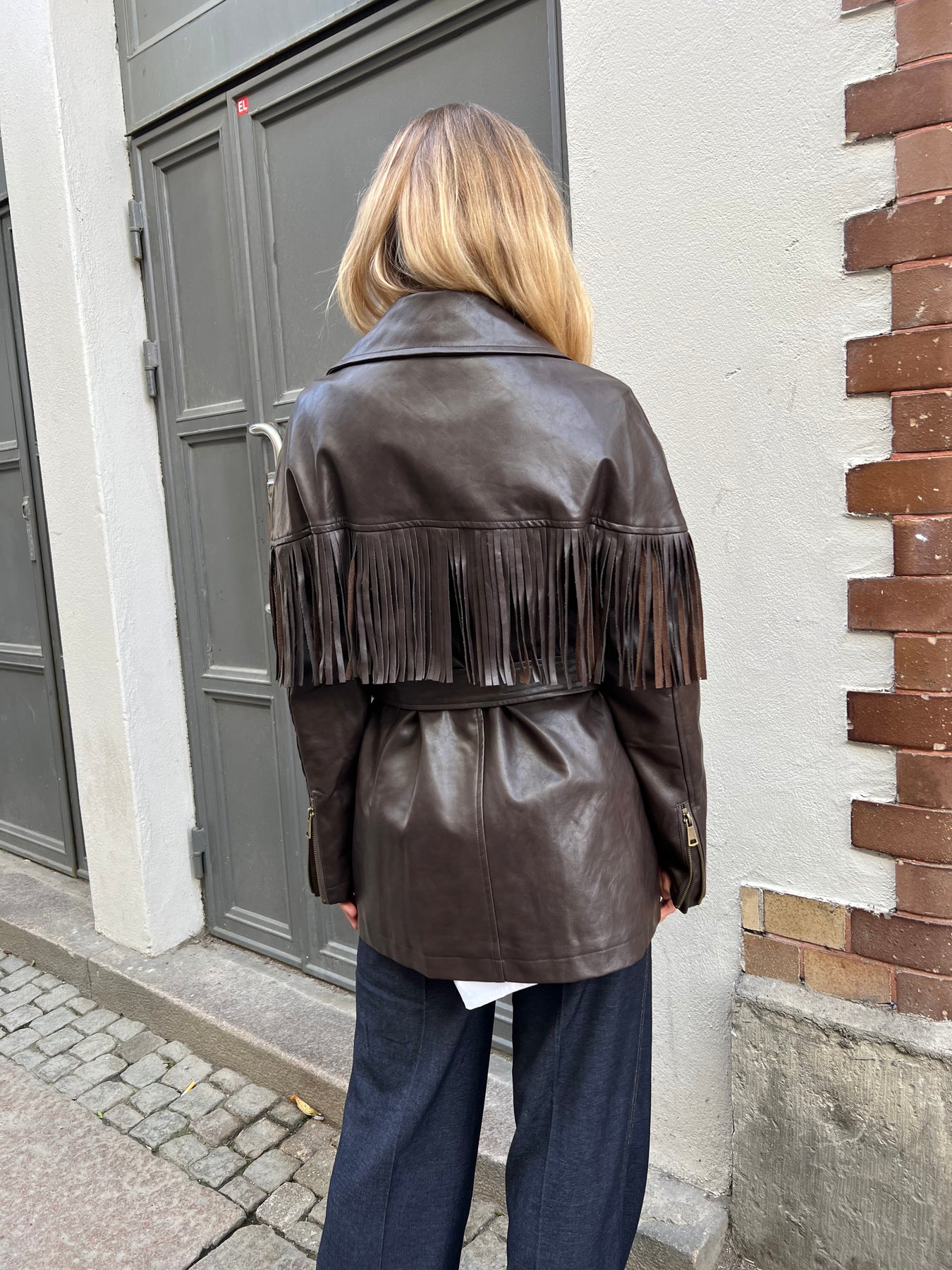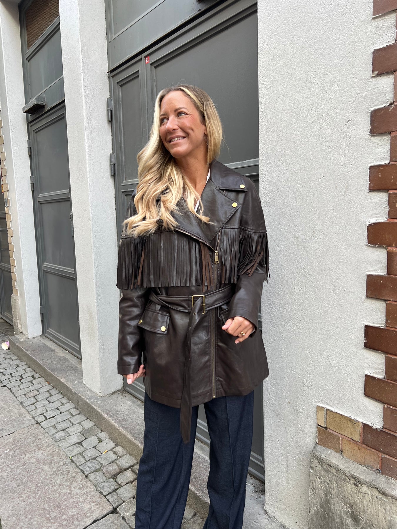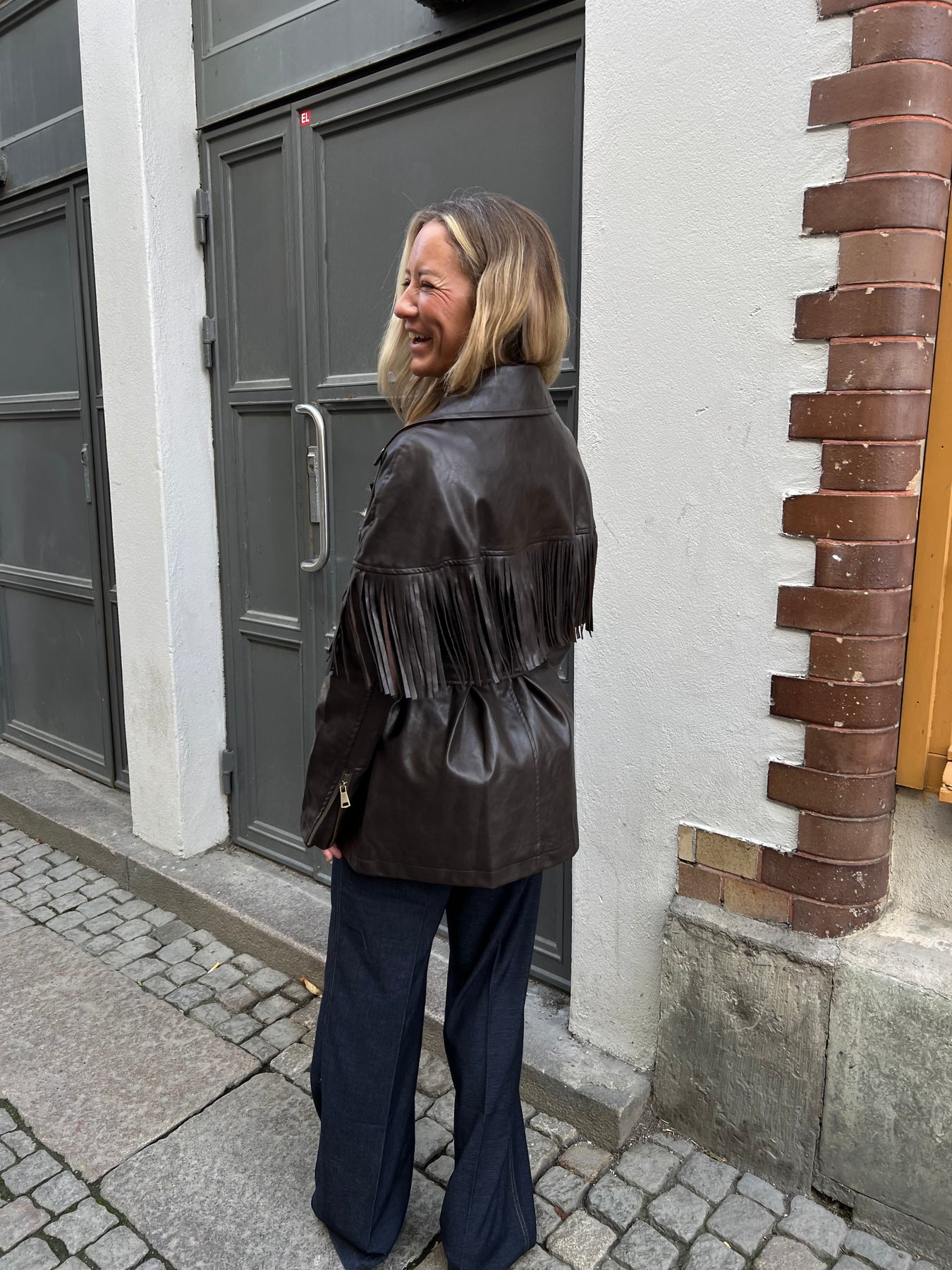 Fransjacka i bikermodell, finns endast ett fåtal. Materialet är i PU, jackan kommer i en storlek som passar 34 till en mindre 40.