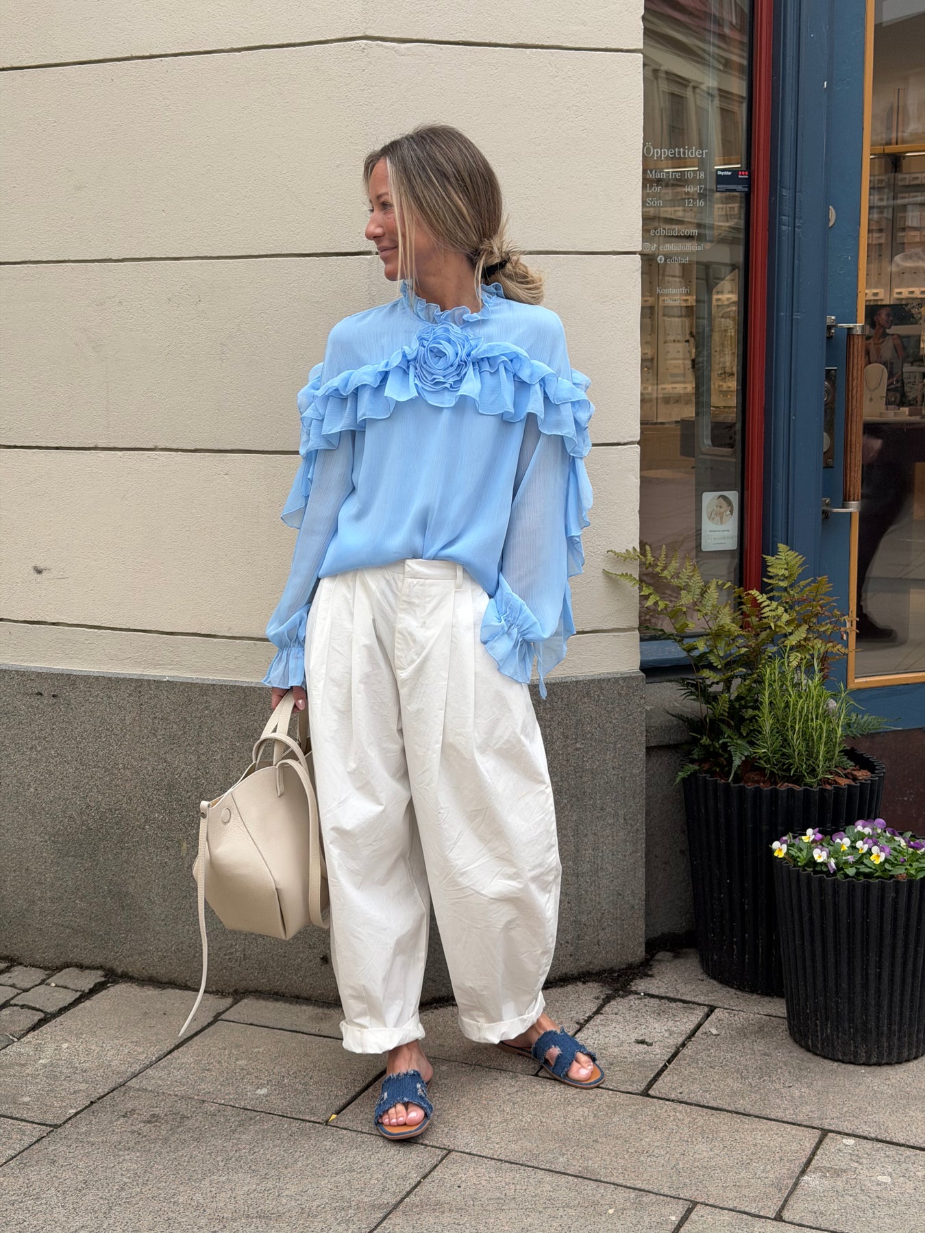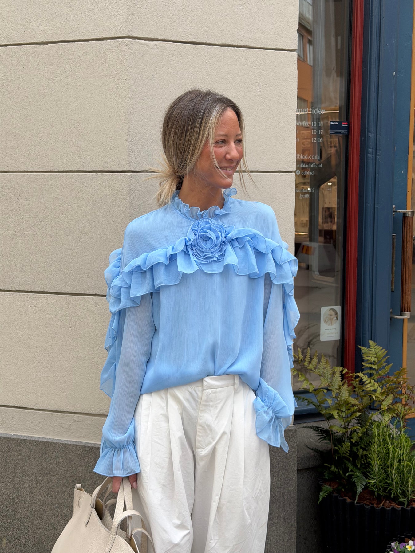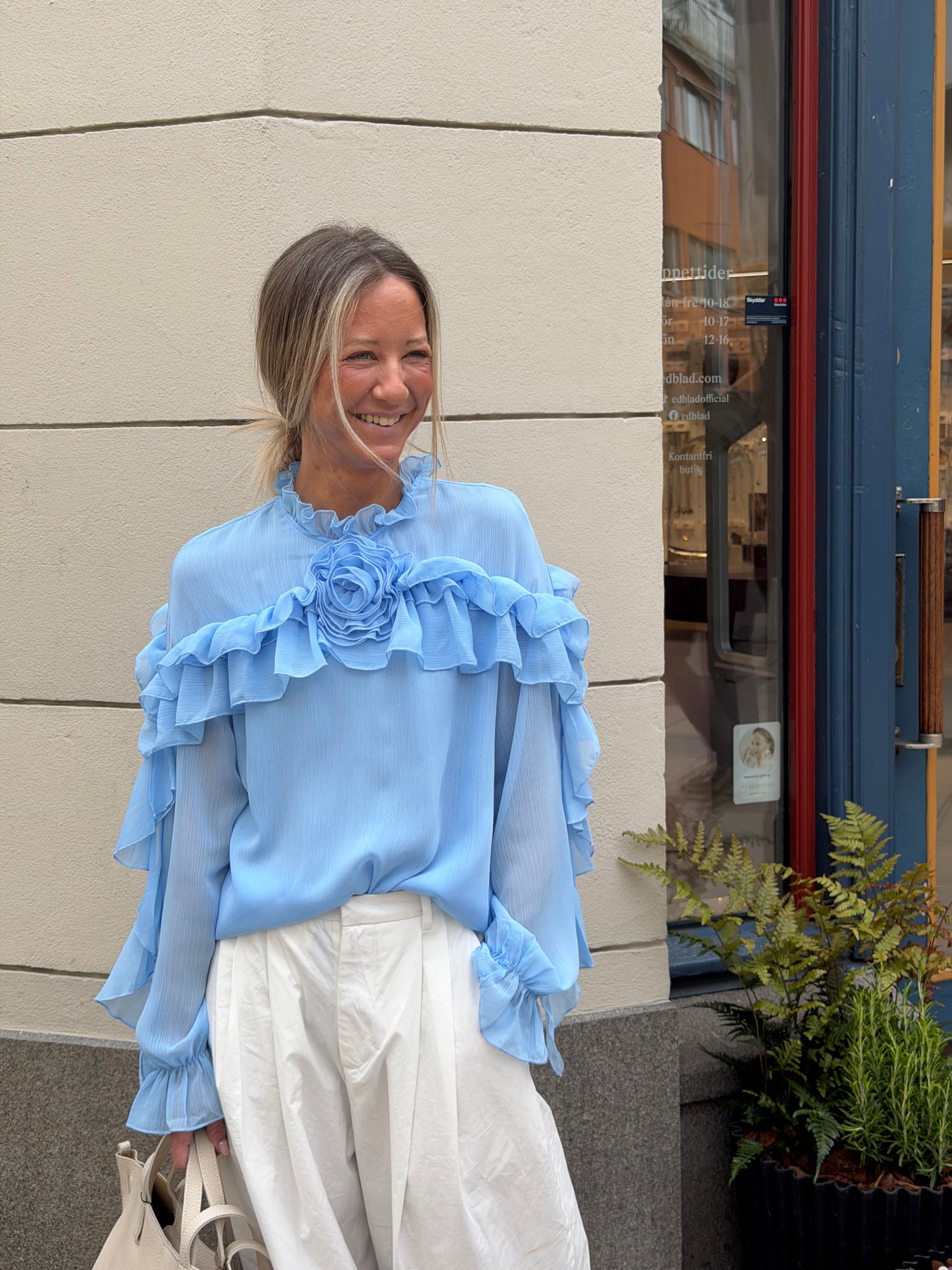 Härlig blus med volanger längs armen och ros mitt fram en storlek som passar 34 till 38