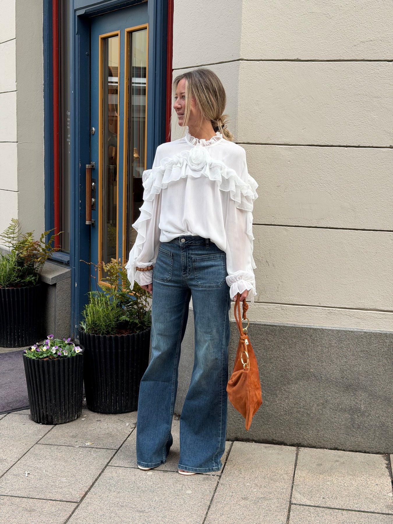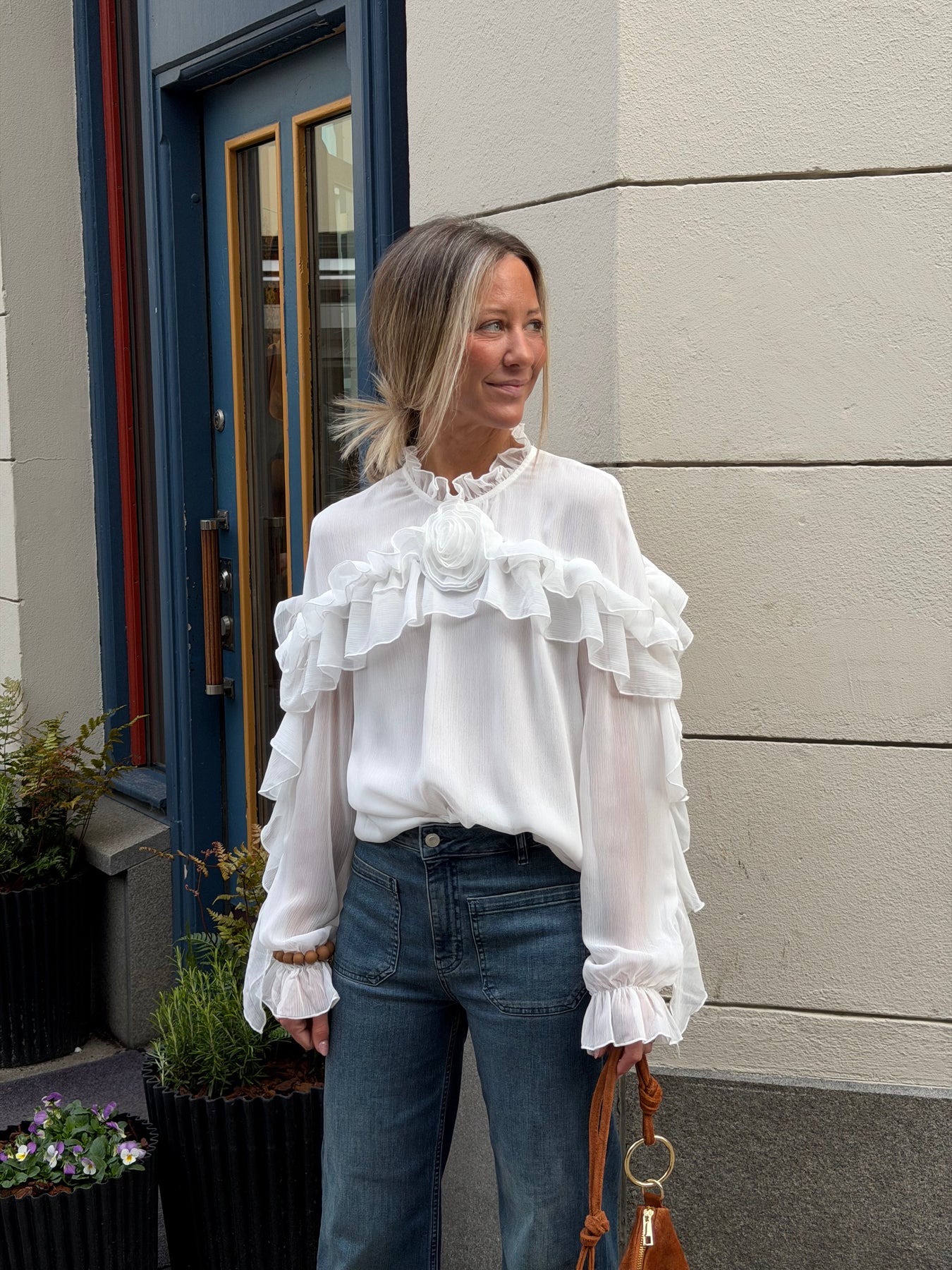 Härlig blus med volanger längs armen och ros mitt fram en storlek som passar 34 till 38materialet är 100 % polyester