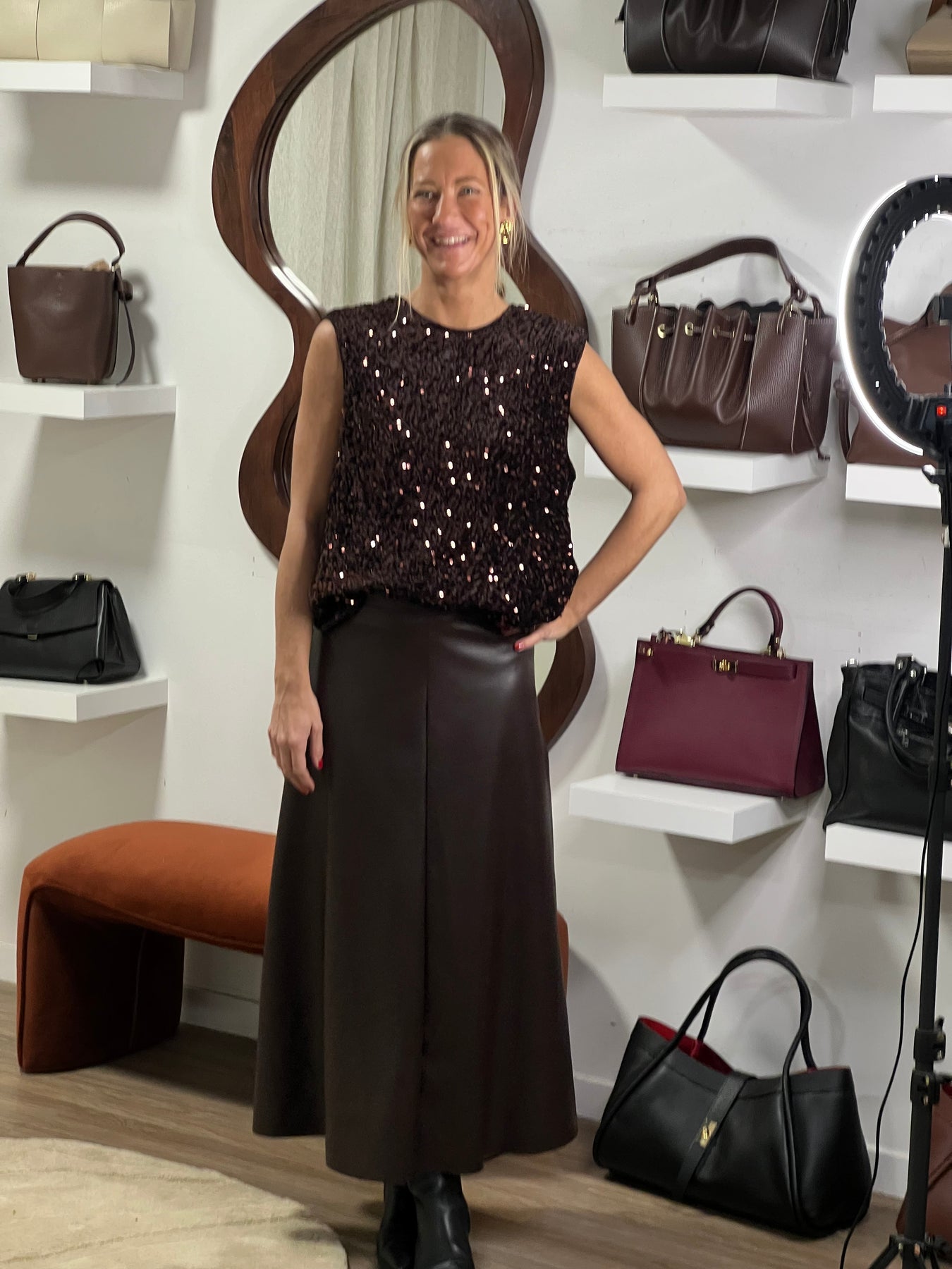 Paljett Topp med stor rosett i ryggen. Tyget är i sammet med små paljetter i stretch tyg normal i storleken.