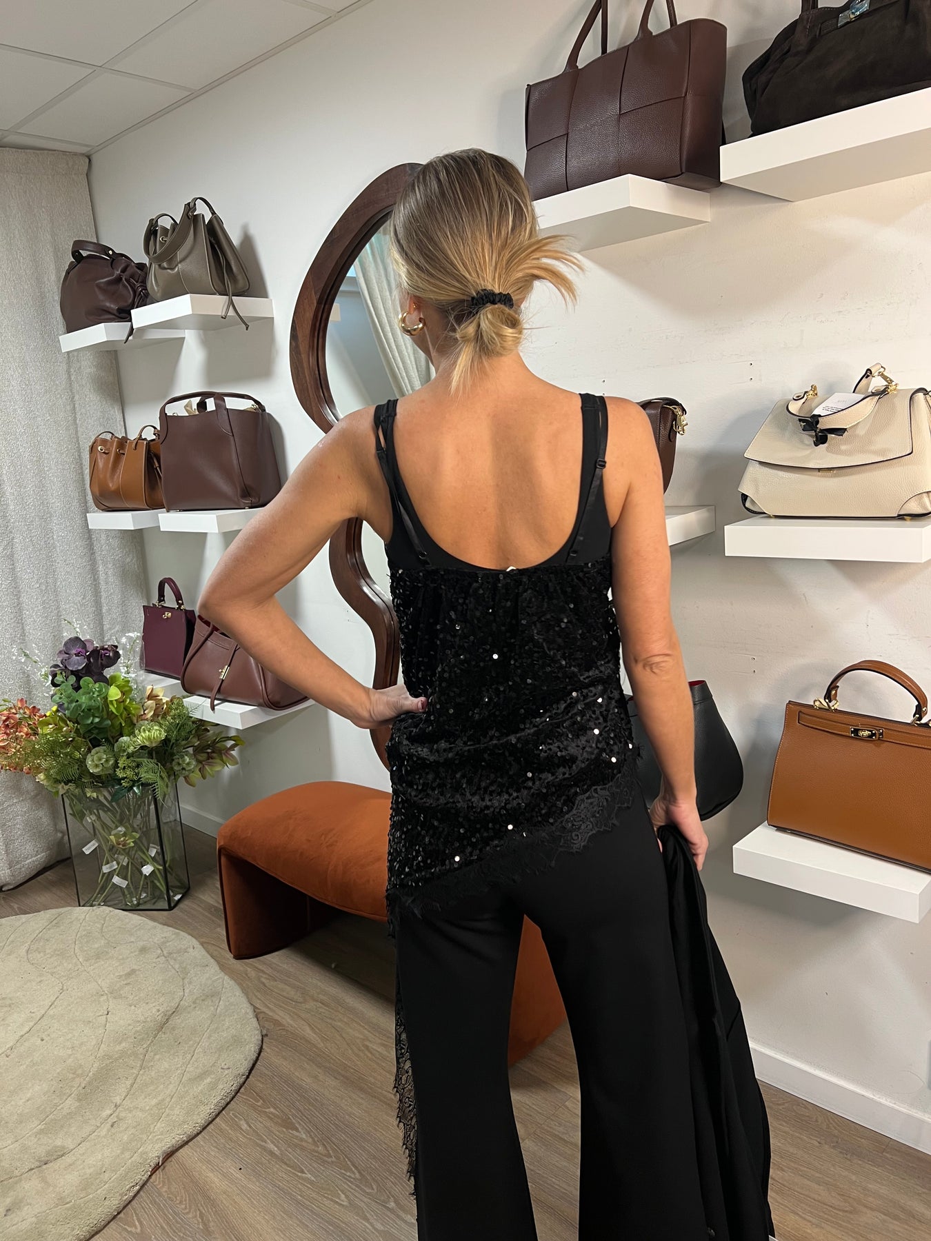 paljett linne med justerbara, axelband och resår i ryggen en storlek som passar 34 till 40