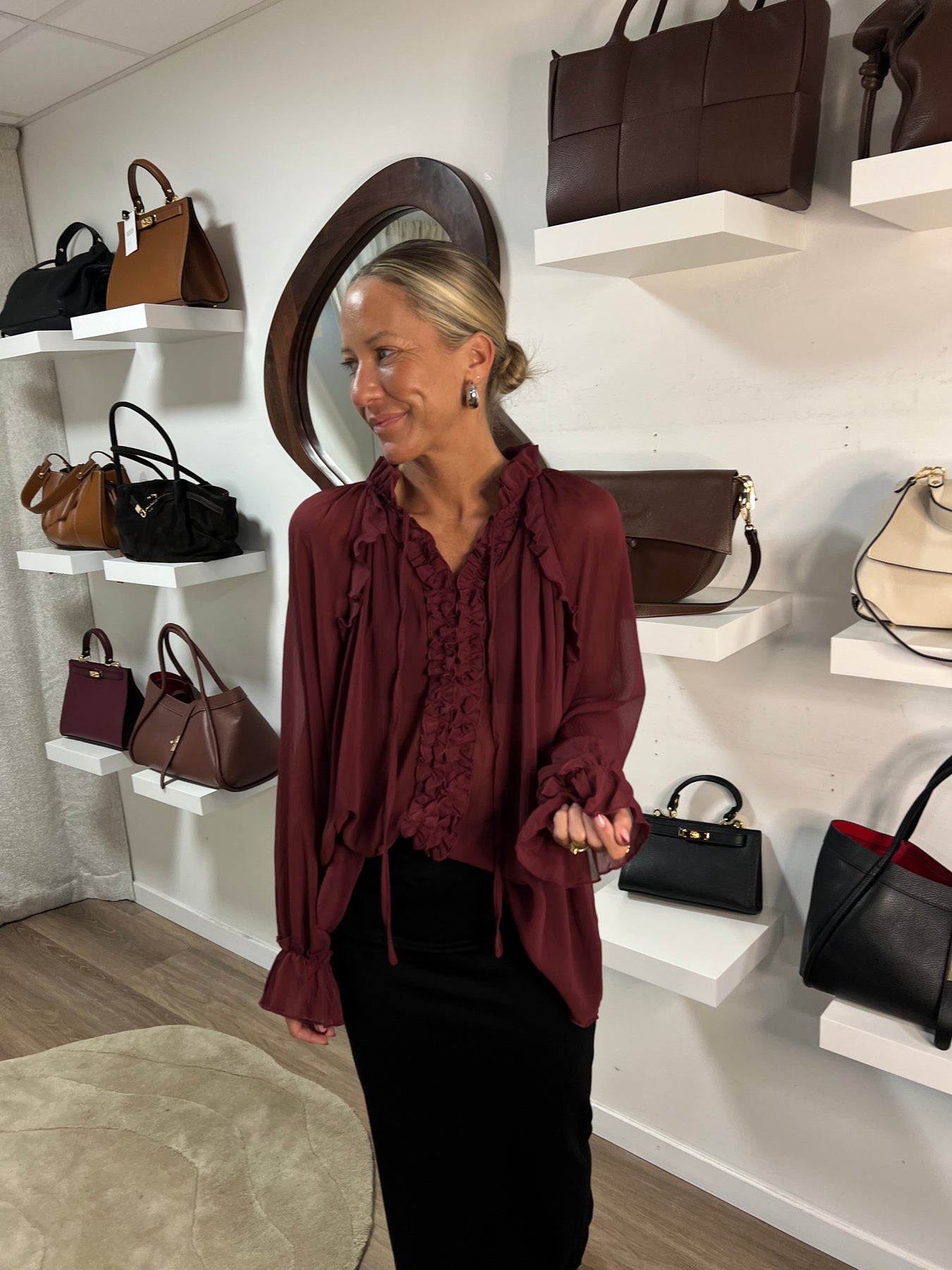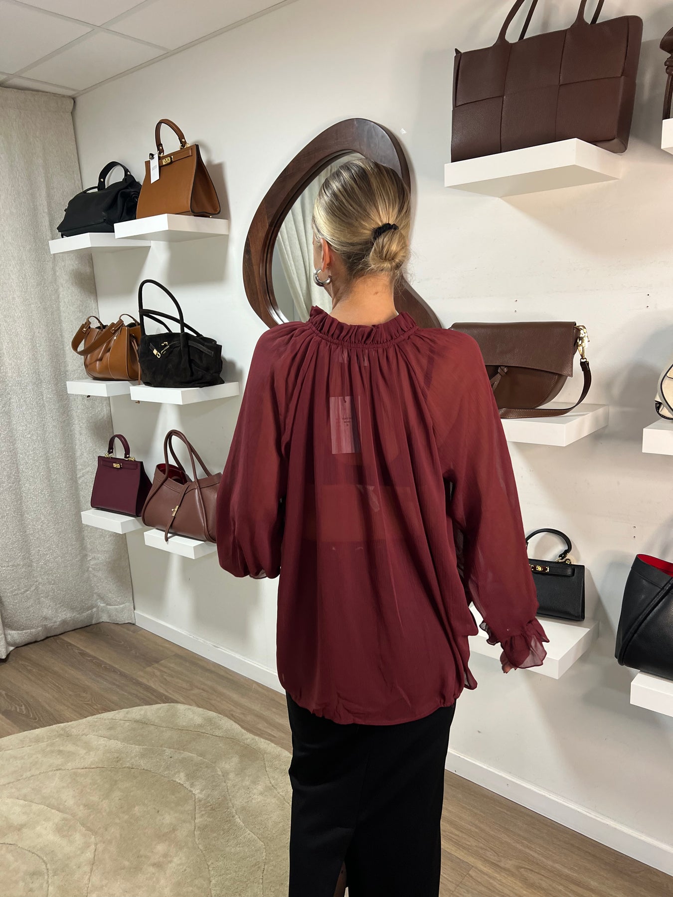 Skön lättsam Blus med volang kant och krås fram till materialet är 100 % polyester