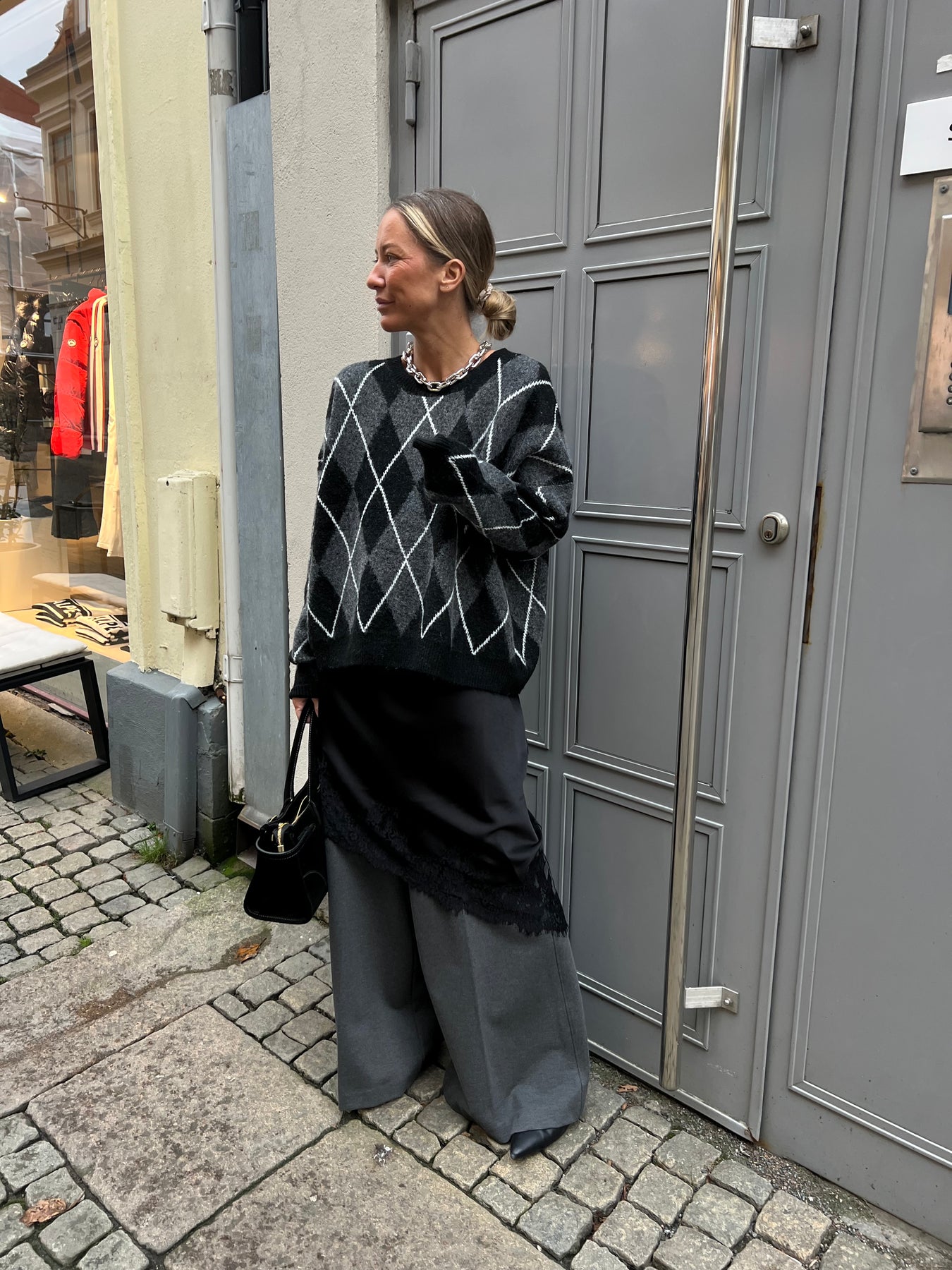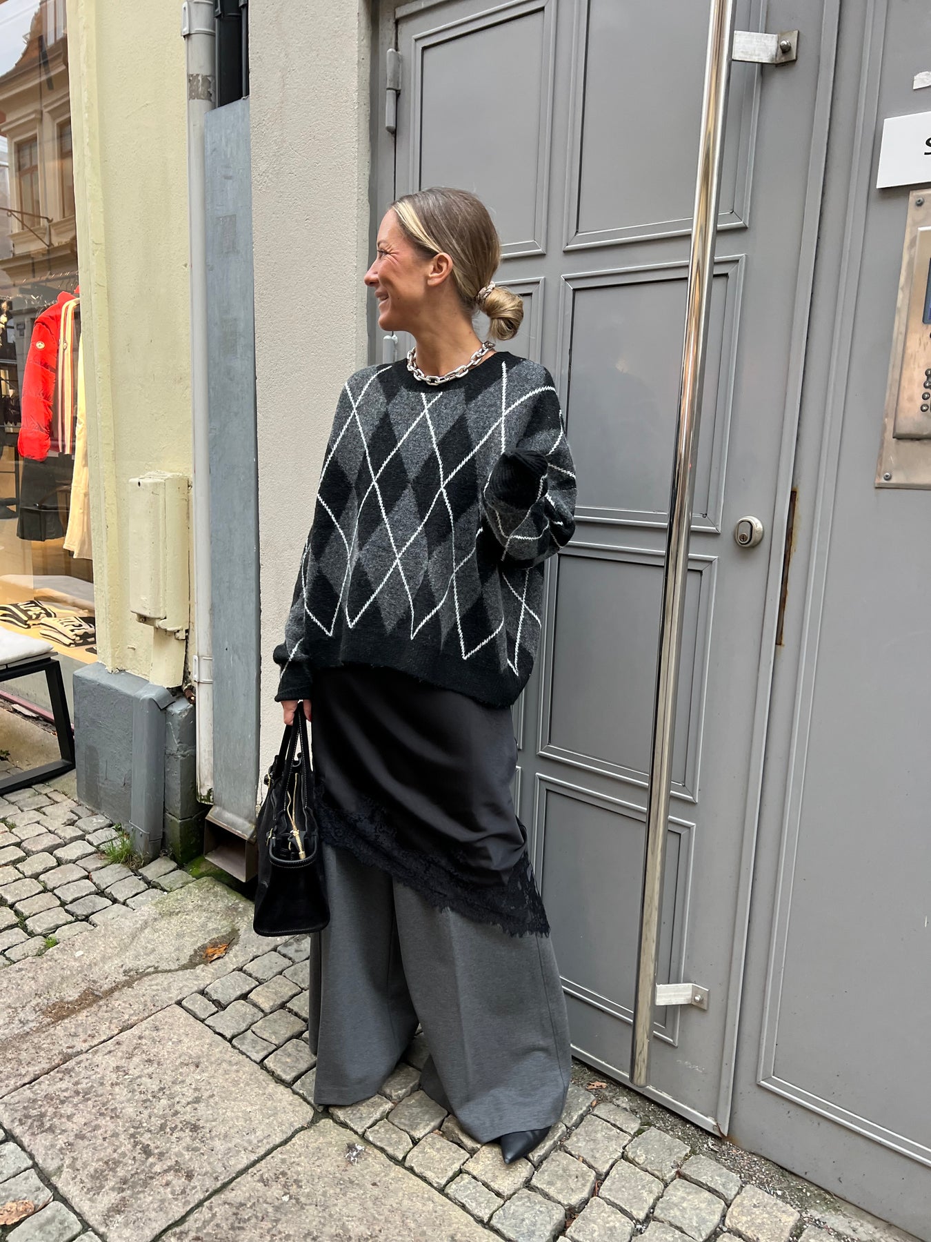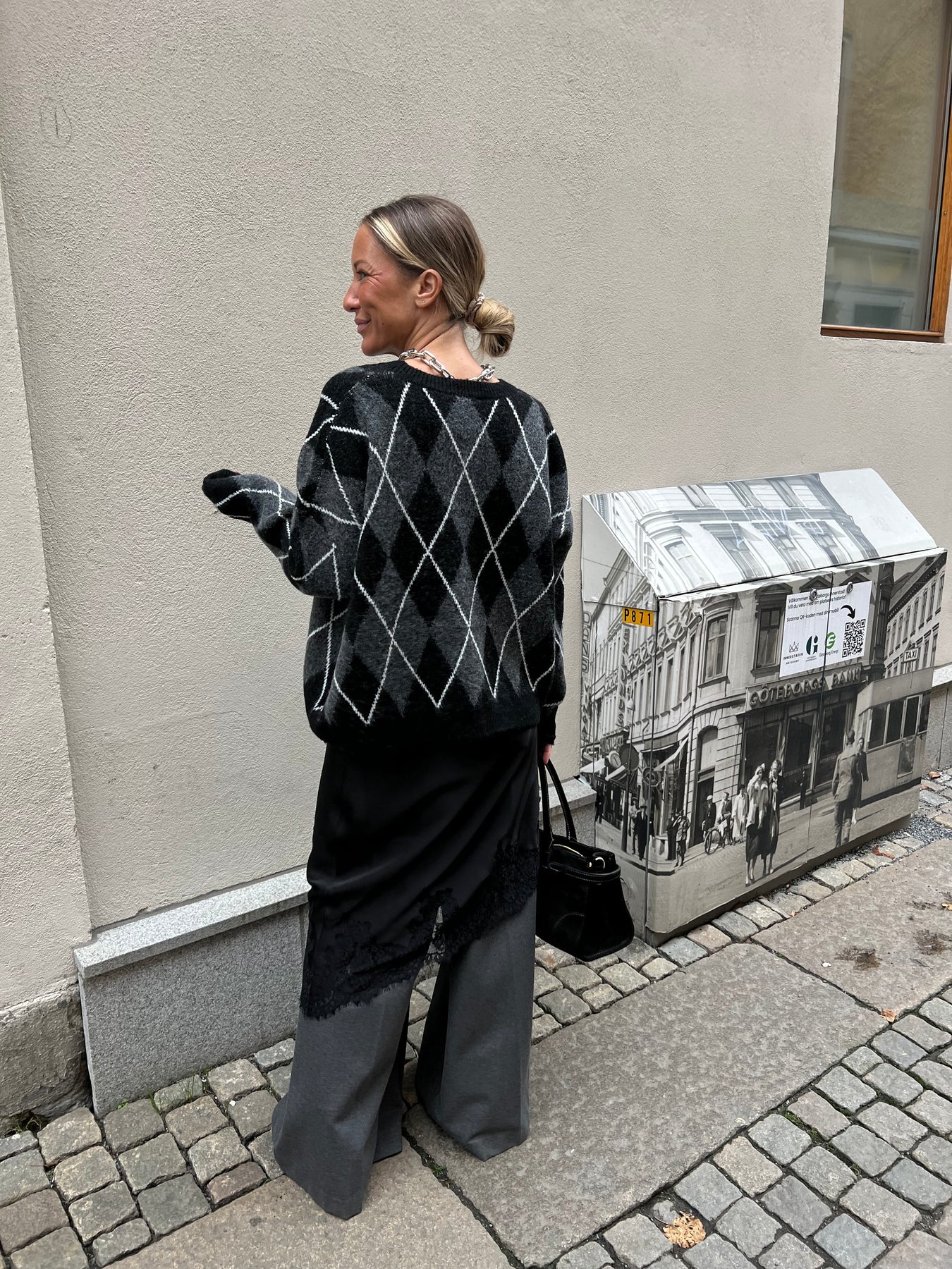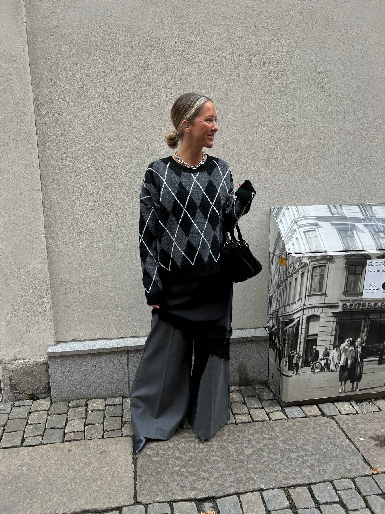 ny rutig tröja i stickad material en storlek som passar 34 till 42 materialet är 50 % Recycle polyester 15 % polyester 13 % akryl 13 % nylon 6 % ull 3 % Spandex