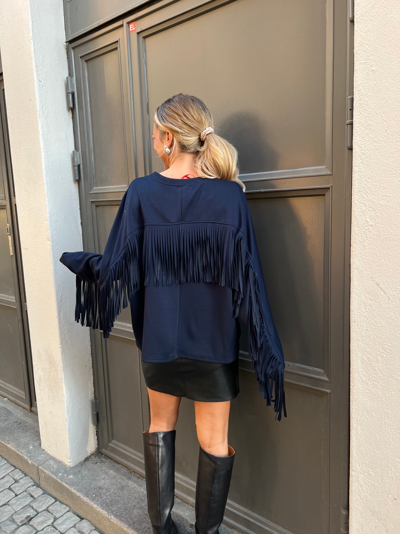 Supercool collegetröja med fransar längs ryggen och armarna, i ett otroligt mjukt och skönt material. En storlek som passar storlek 34 till 42.