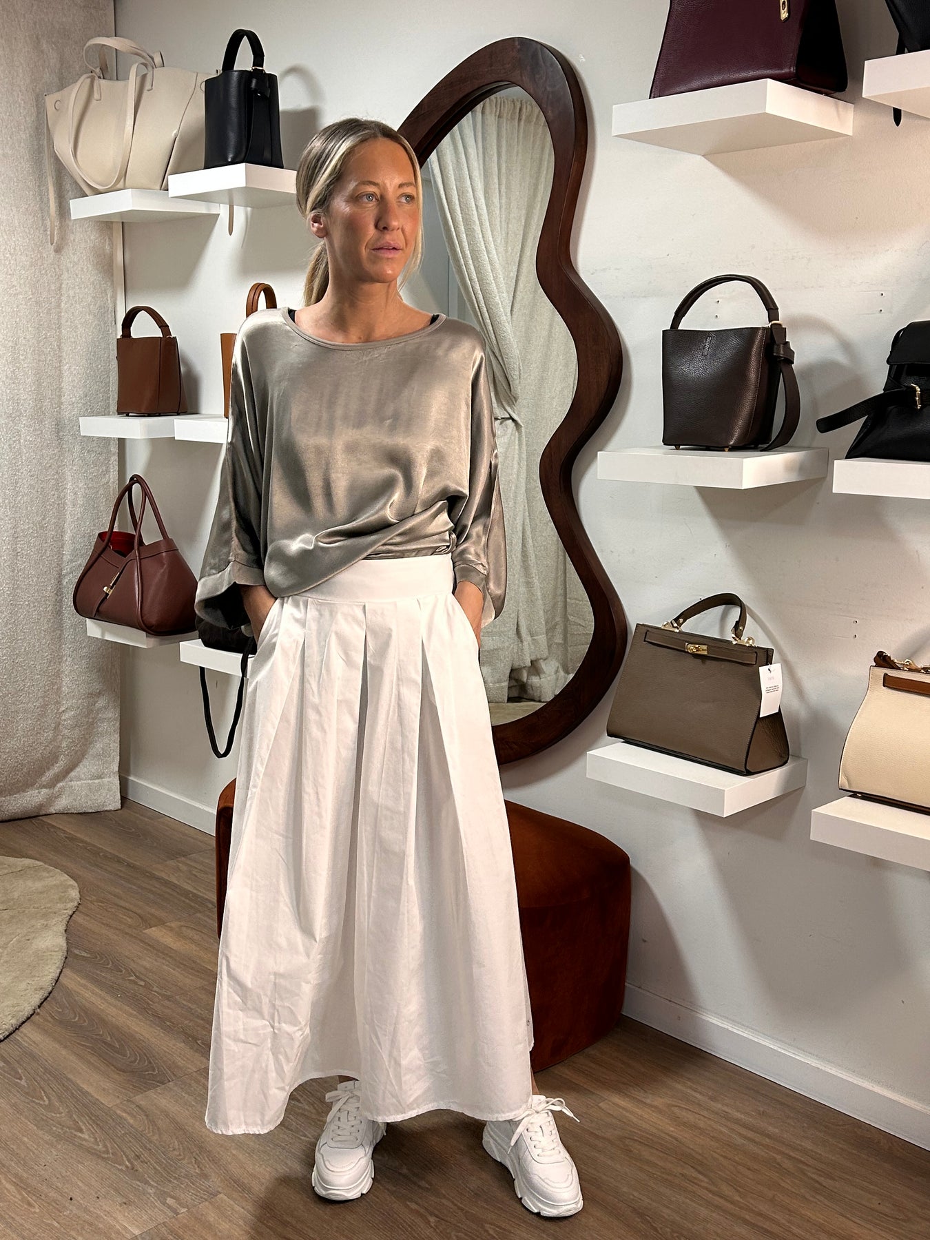 Kjol i 100% bomull med resår baktill. Normal i storlek. Kjolen är i en krispig tunn poplin