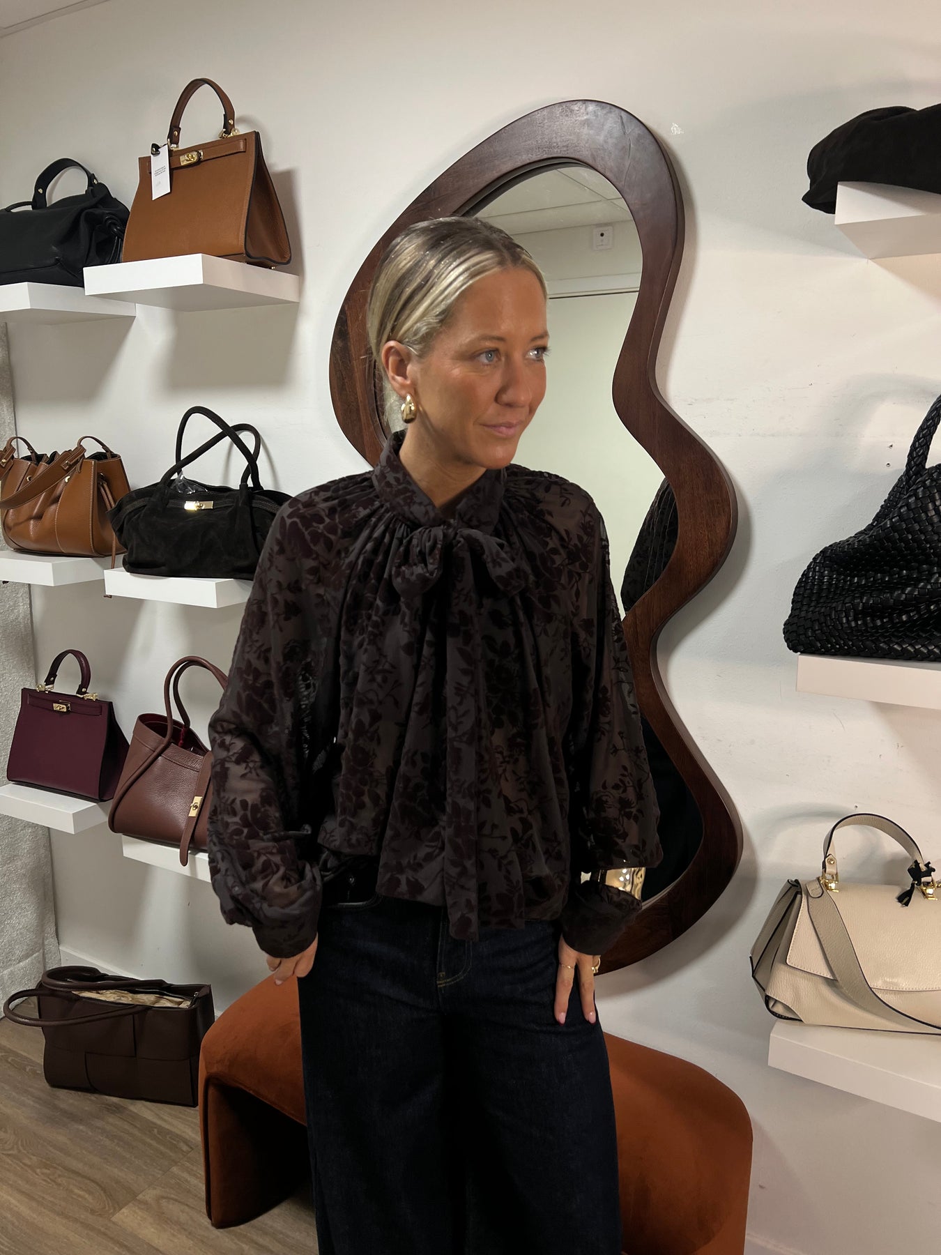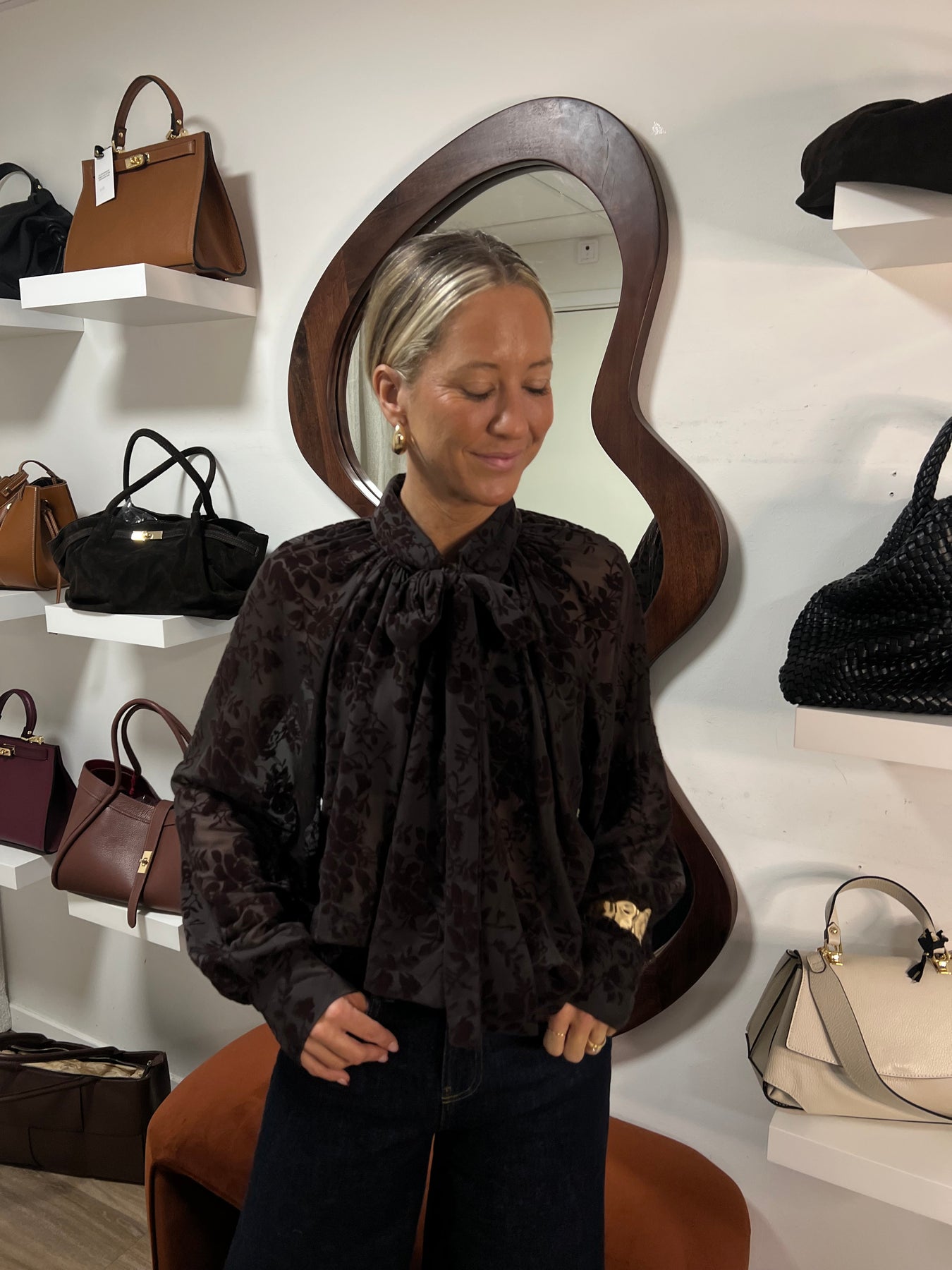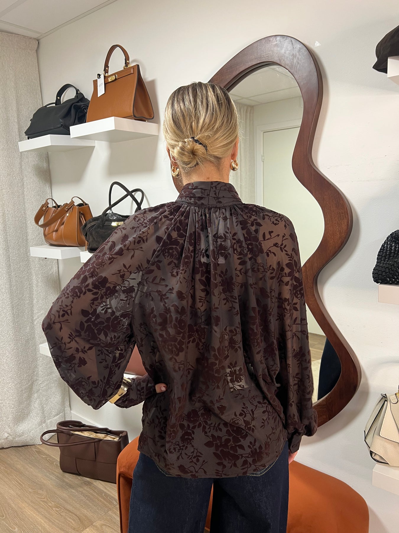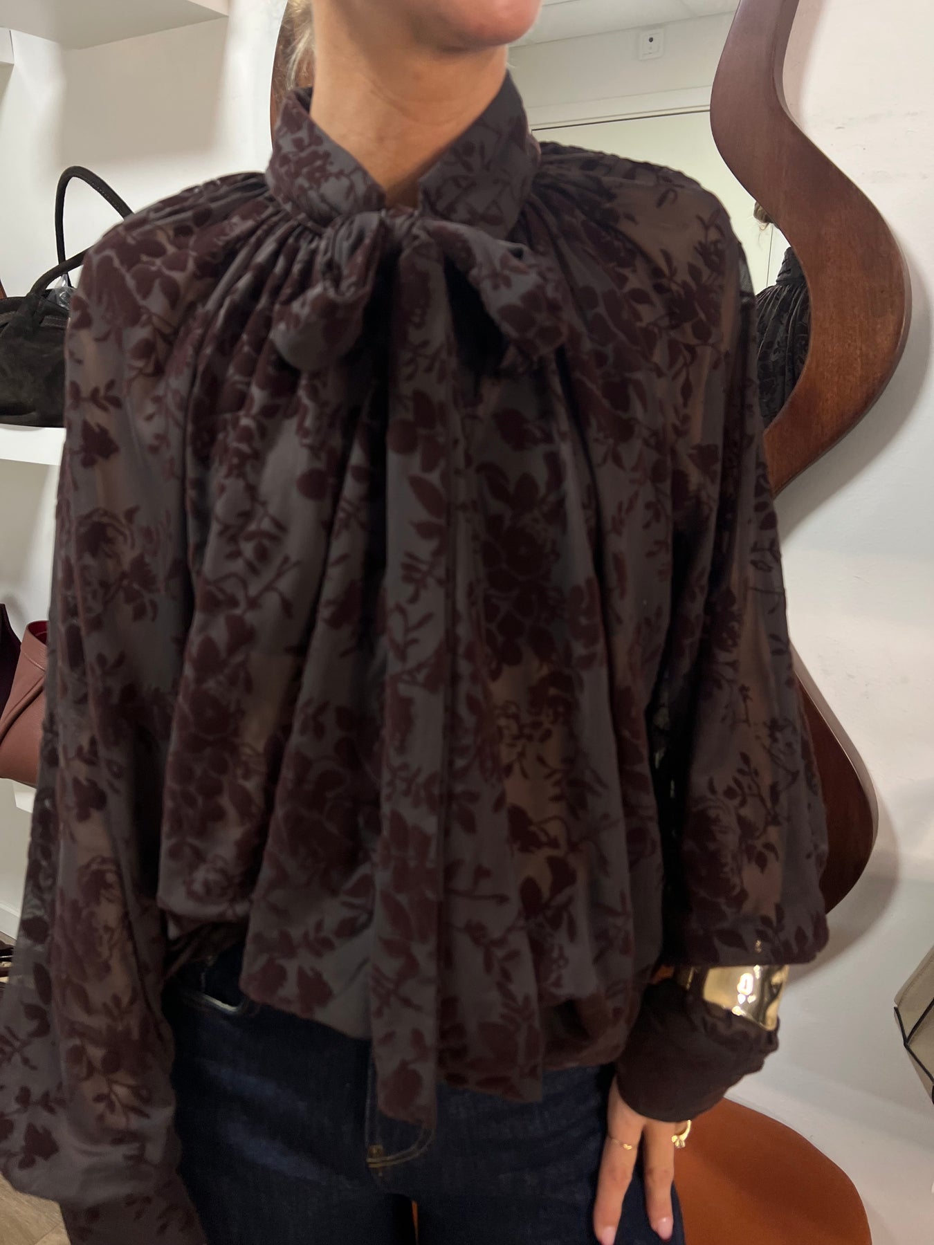 Blouse skjorta i mesh med knyt i halsen och en något puffad arm. Samma fina mönster som vår Cilla topp, I polyester .