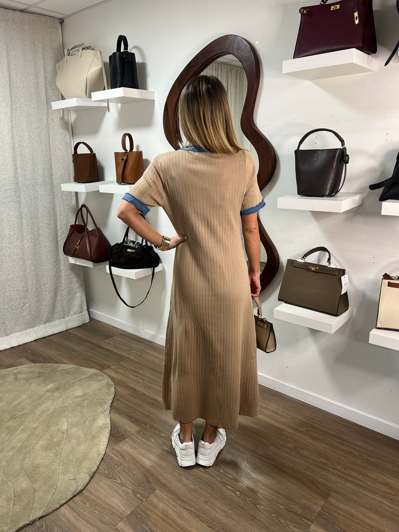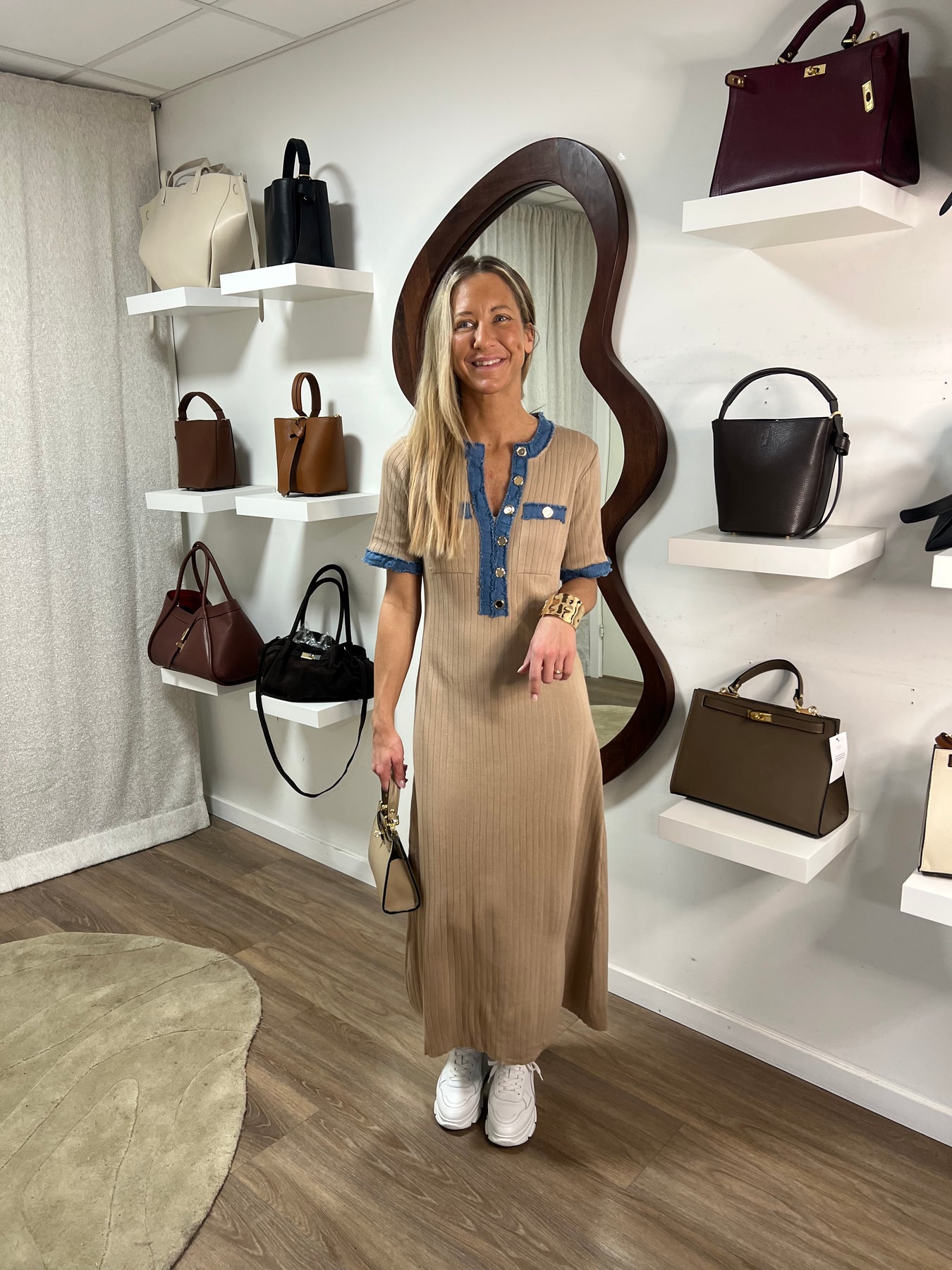 Lång stickad klänning med Denim detaljer. Den är i en storlek passar 34 -40 Materialet är 68 % viskos 32 % polyester
