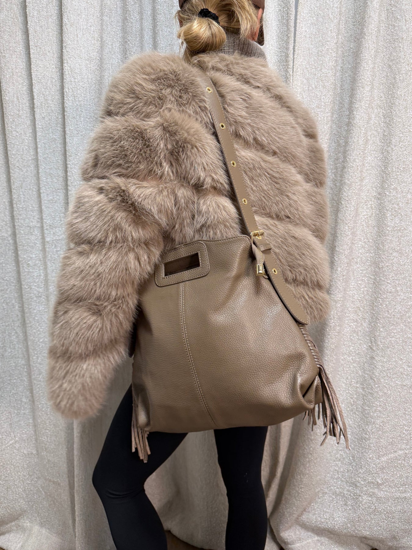 Väska med handtag och tillhörande lång remfransar på sidan 100 % läder