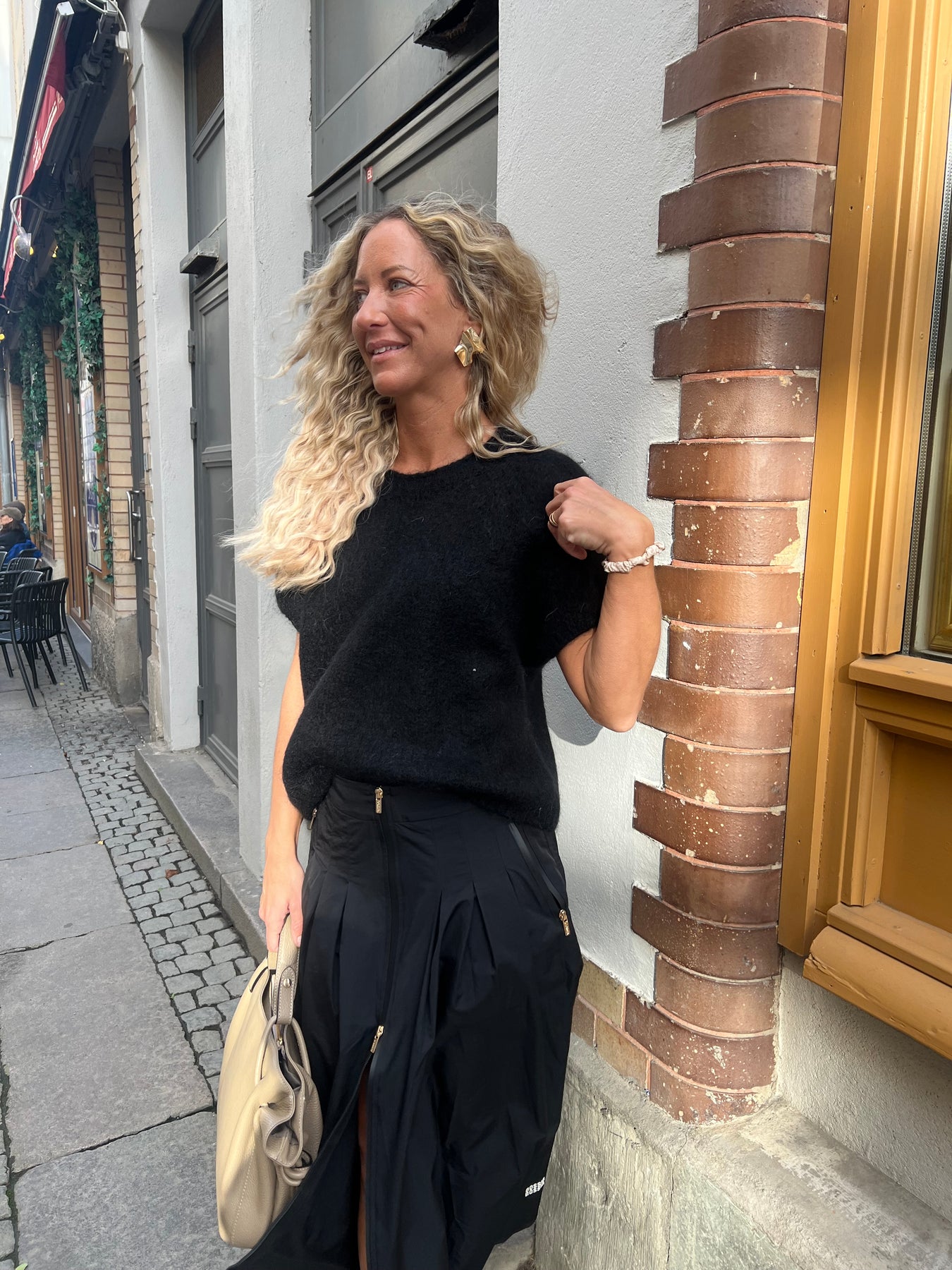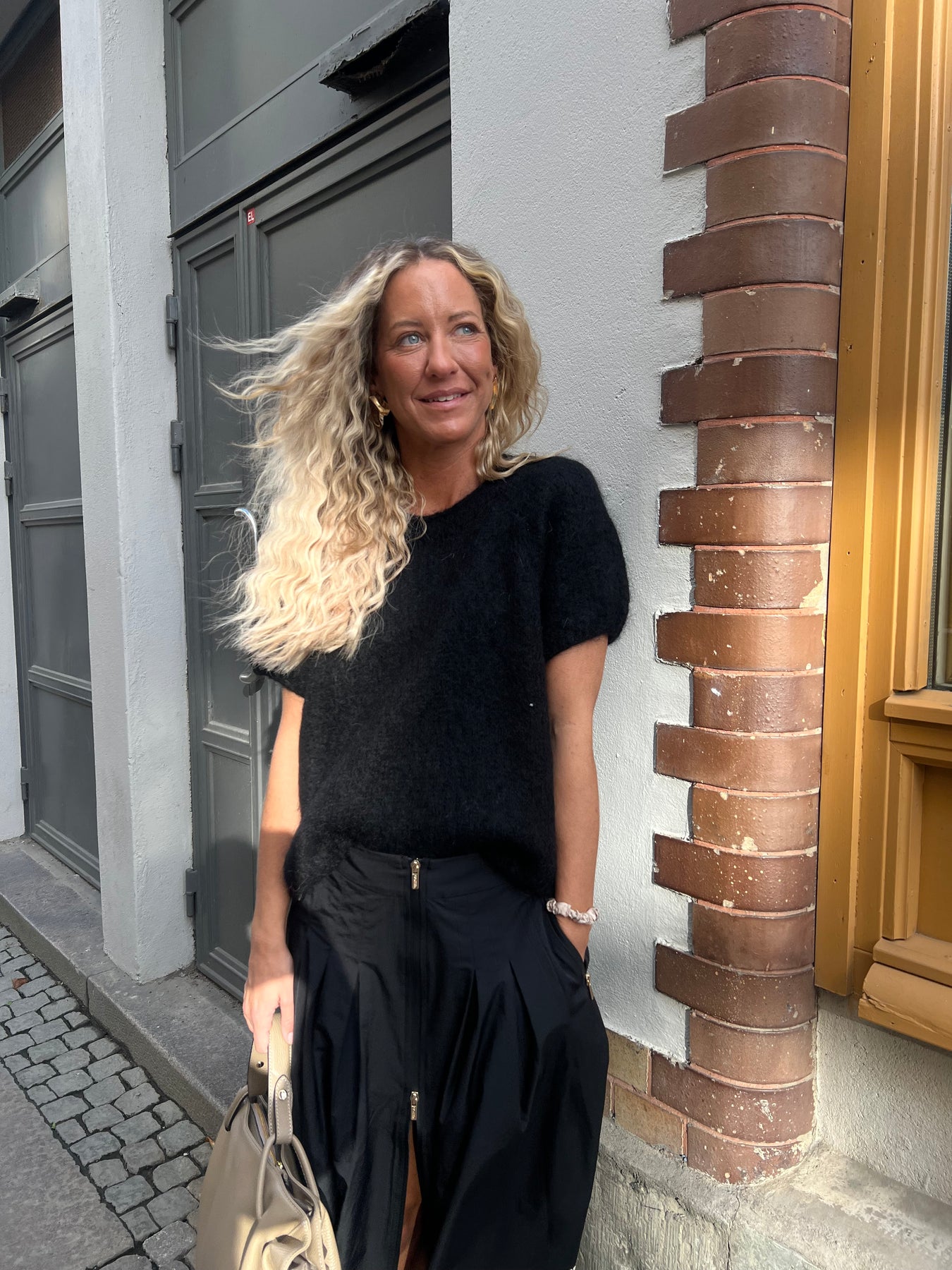 Stickad tröja med kort är en storlek som passar 34 till 40 materialet är 40 % Mohair, 30 % akryl 20 % polyamide  10 % ull