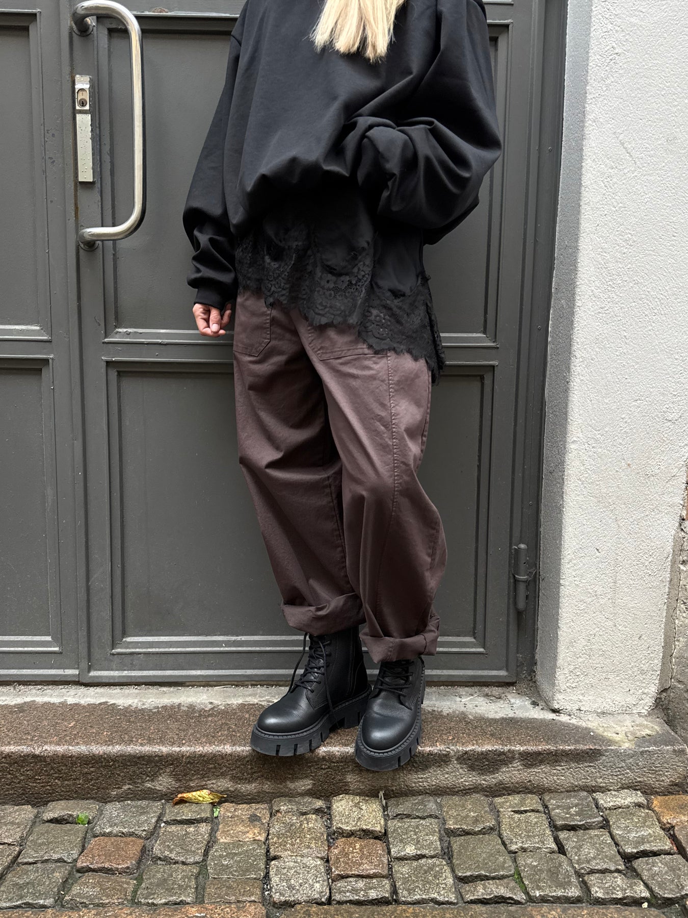 Byxa i oversize, fickor framtill och resår baktill. Det är en storlek som passar 34 till 40. Tunn och skön i materialet.