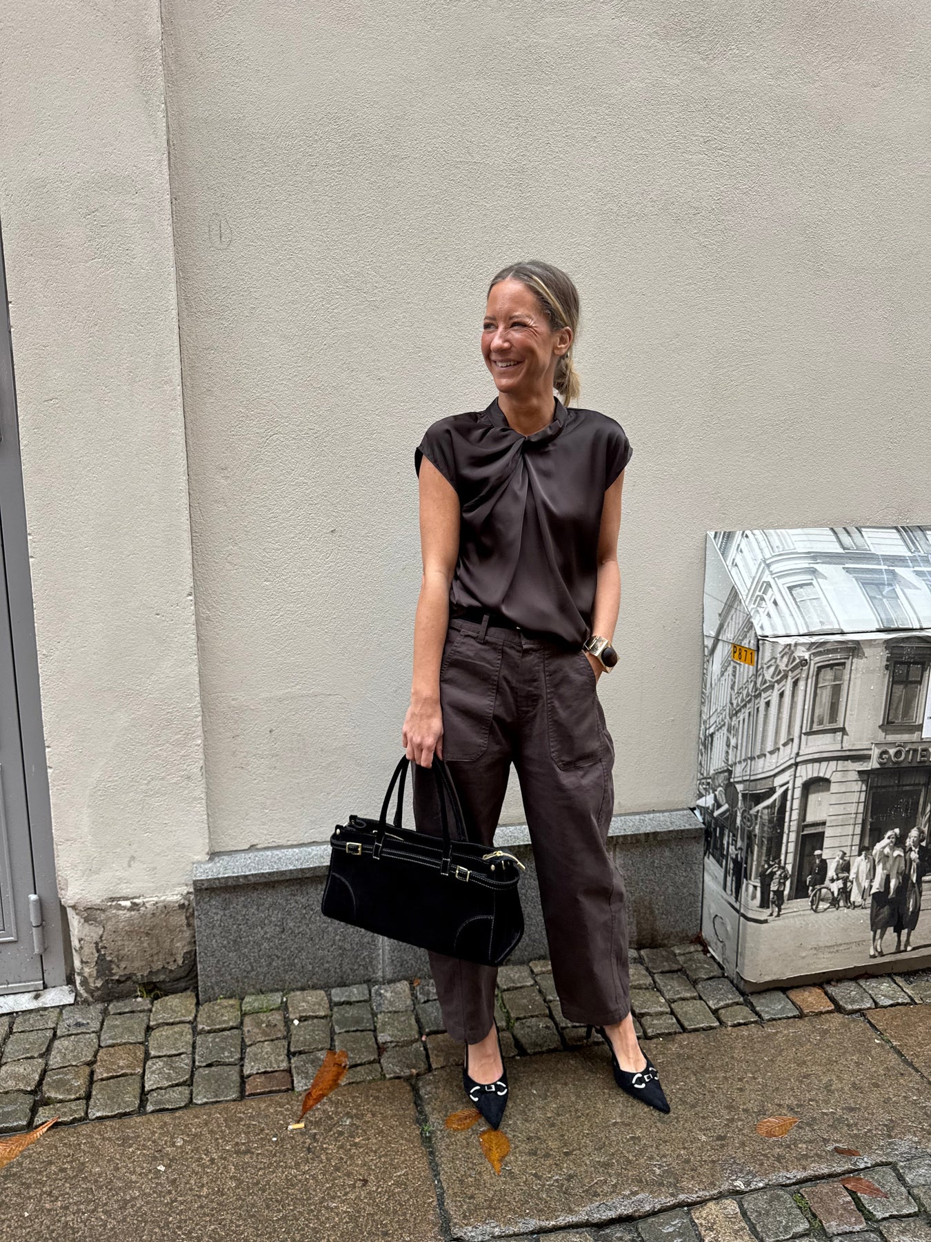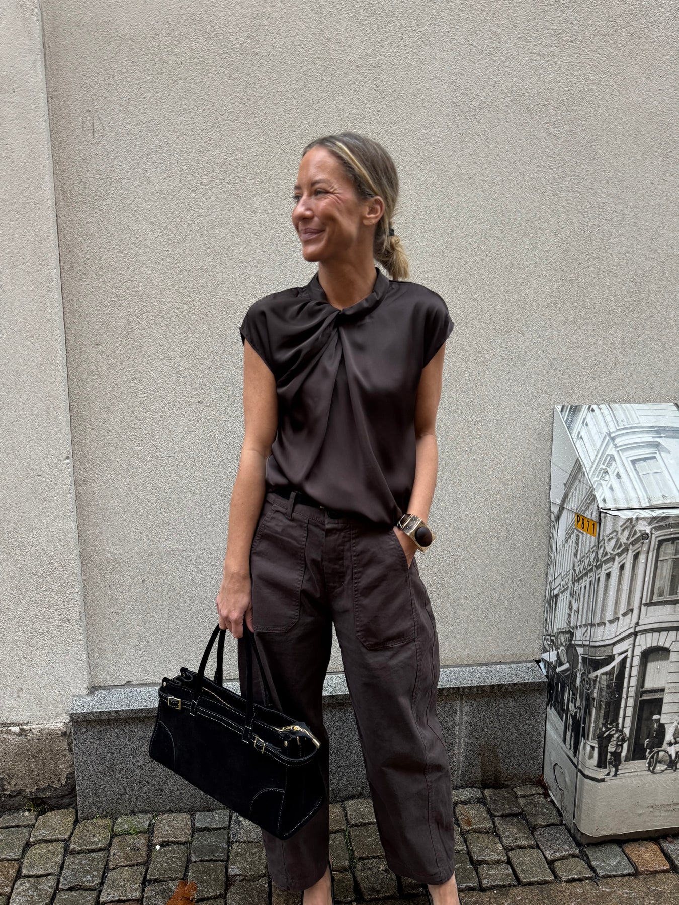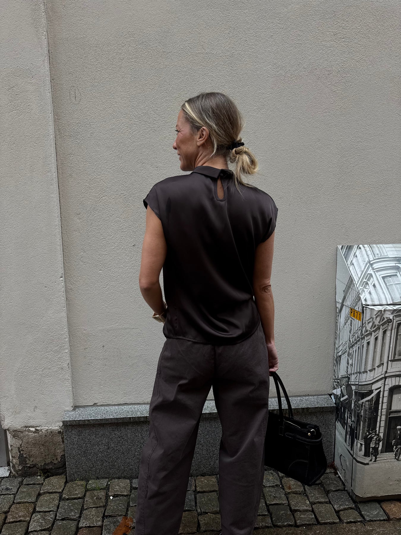 Feminin blus med vacker knutdetalj vid halsen. Blusen är i en skön satinkvalitet som faller snyggt. Passformen är avslappnad, men feminin och blusen kan enkelt dressas upp och ner för att passa både till kontoret och festen.