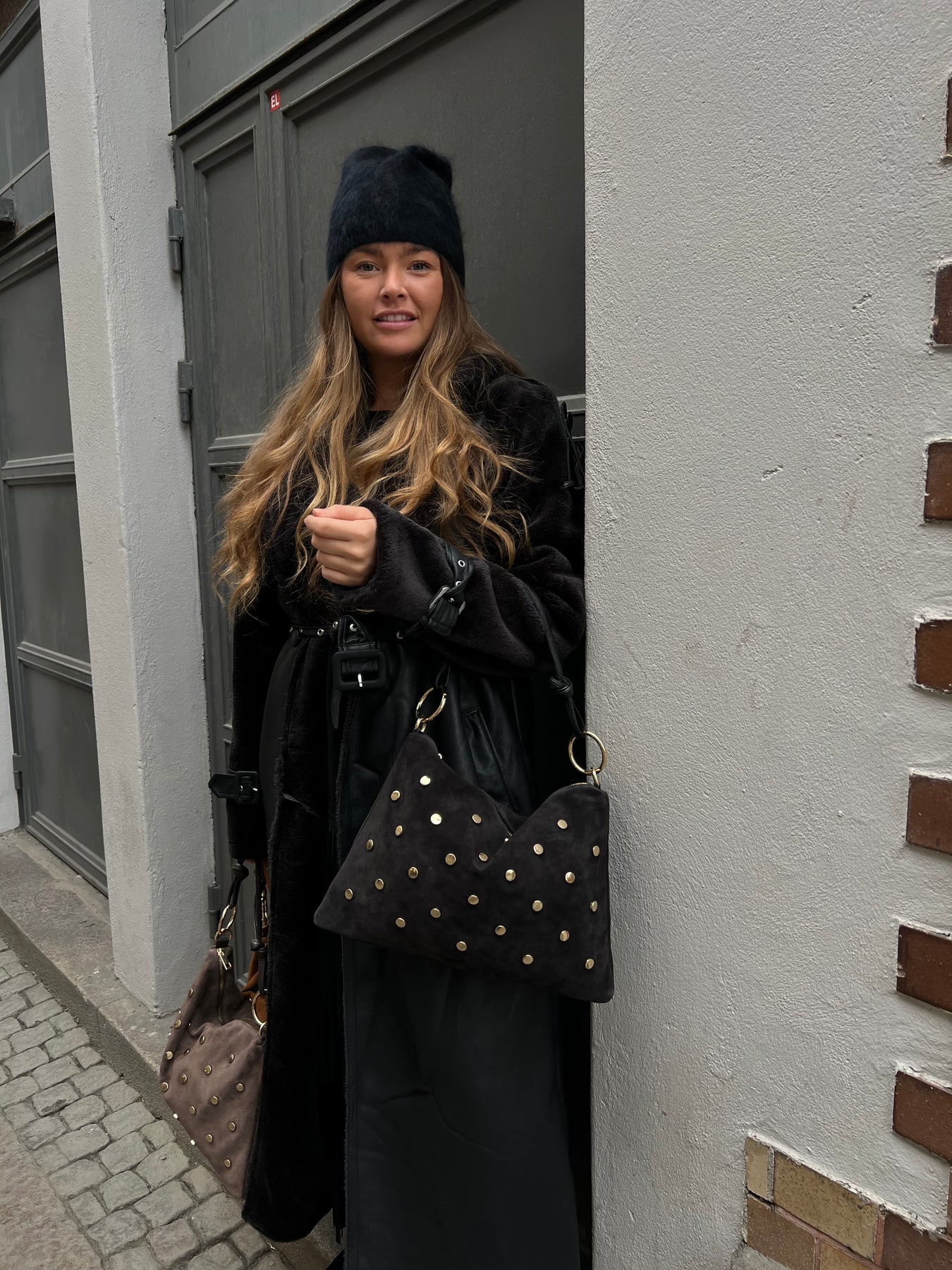 En helt magisk väska med Guldnitar i 100% mocka med både kort och lång tillhörande rem. Tillverkade i Italien