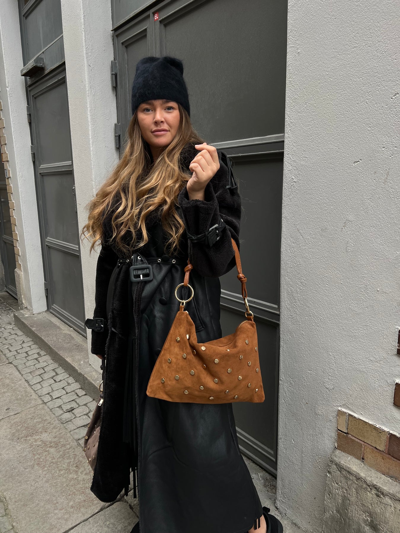 En helt magisk väska med Guldnitar i 100% mocka med både kort och lång tillhörande rem. Tillverkade i Italien