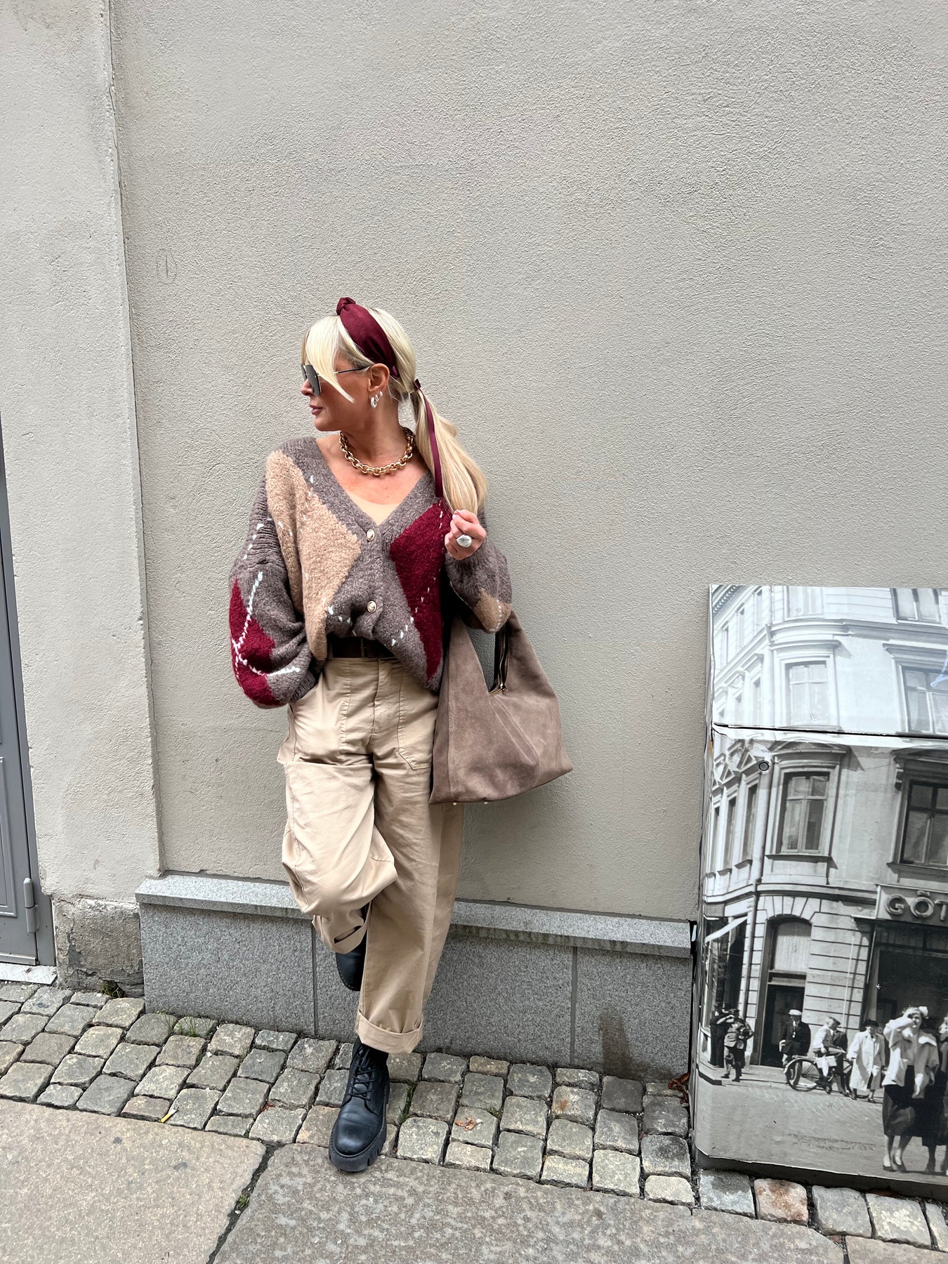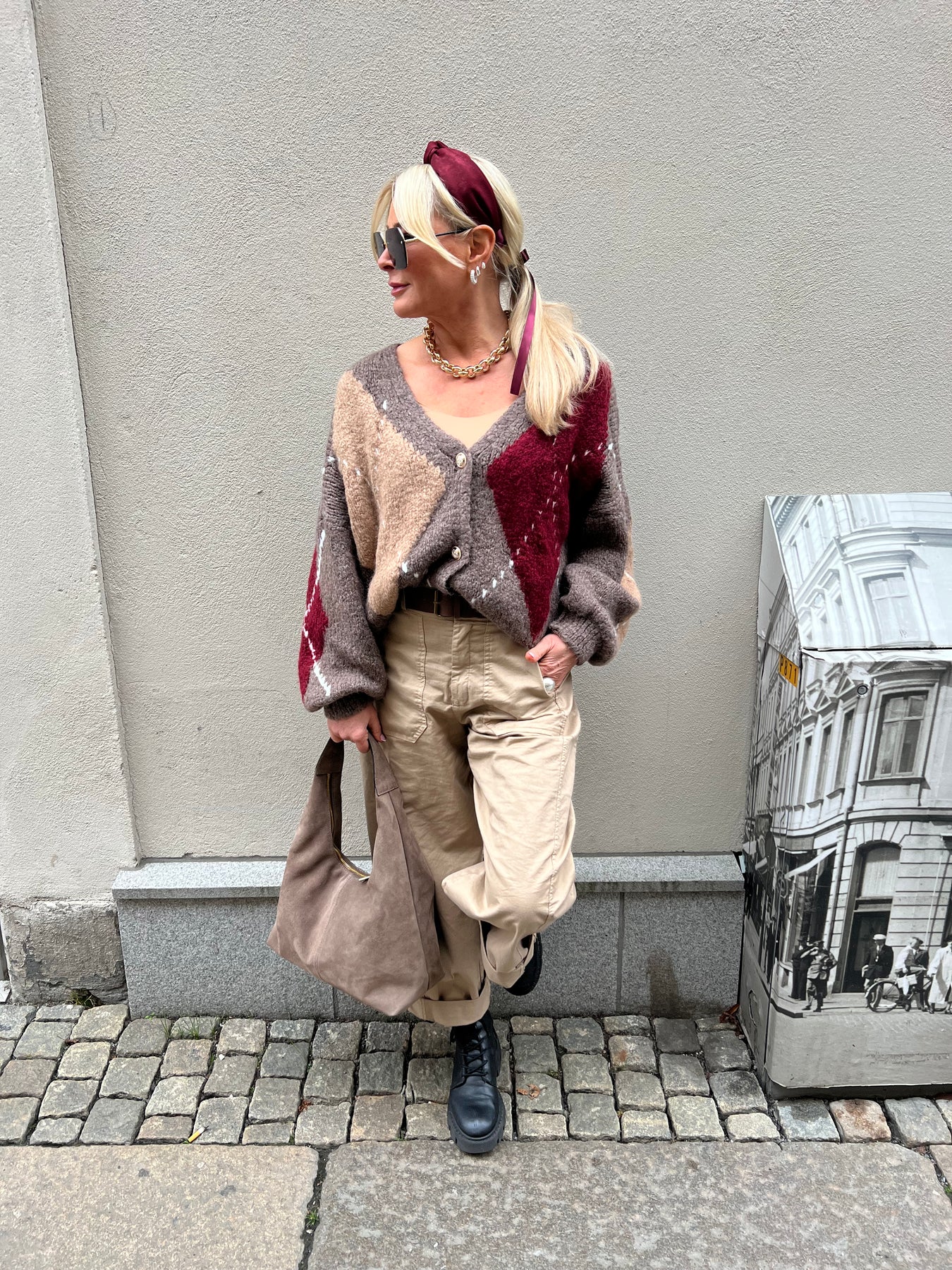 Mjuk och skön stickad kofta med rutor fram till och små guldknappar en storlek som passar 34 till 42. Materialet är