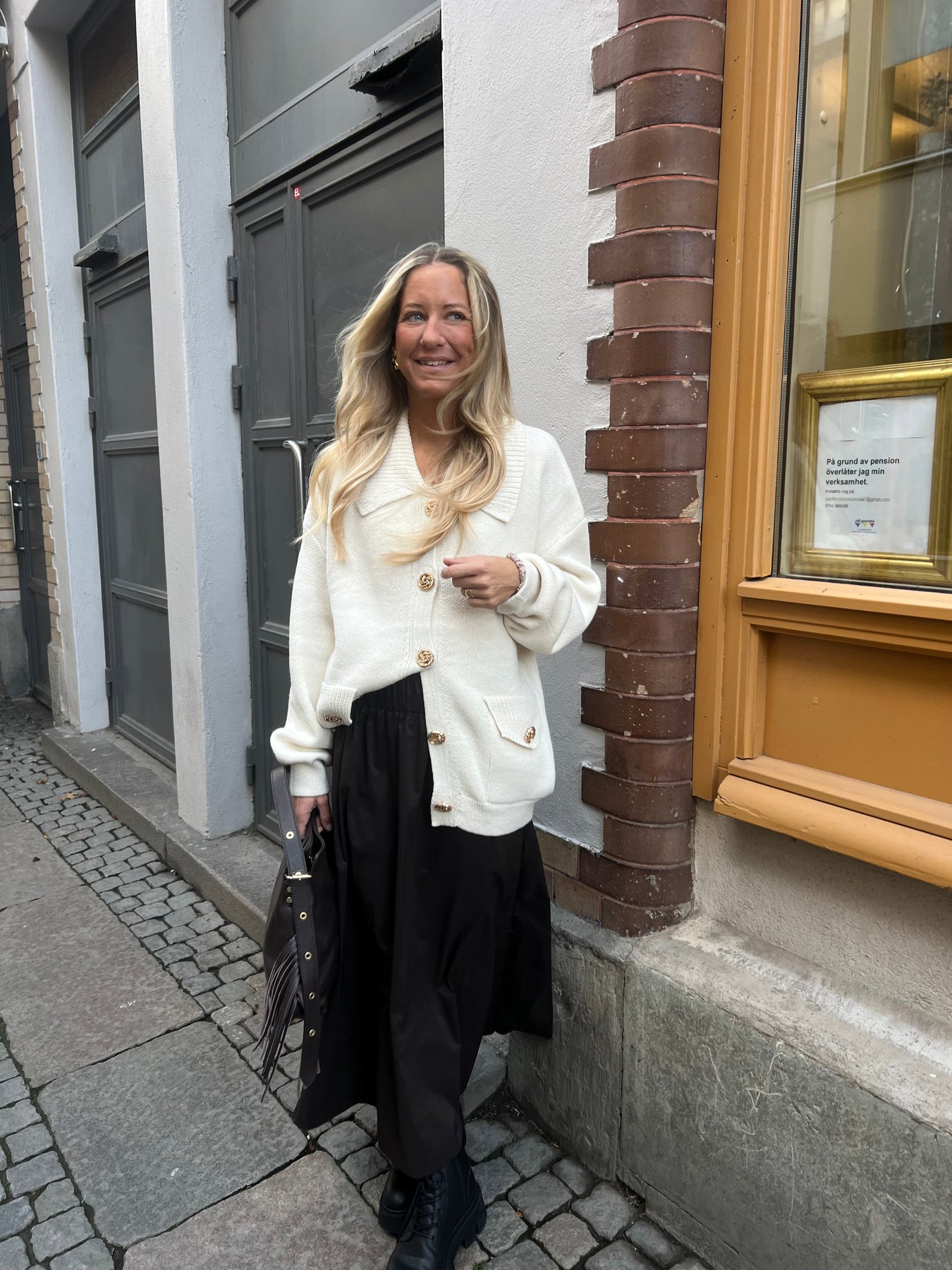 Over kofta i en storlek passar 34 till 42 off White i färgen med stora guldknappar. Materialet är 60 % akryl 32 % viskos 8 % ull.