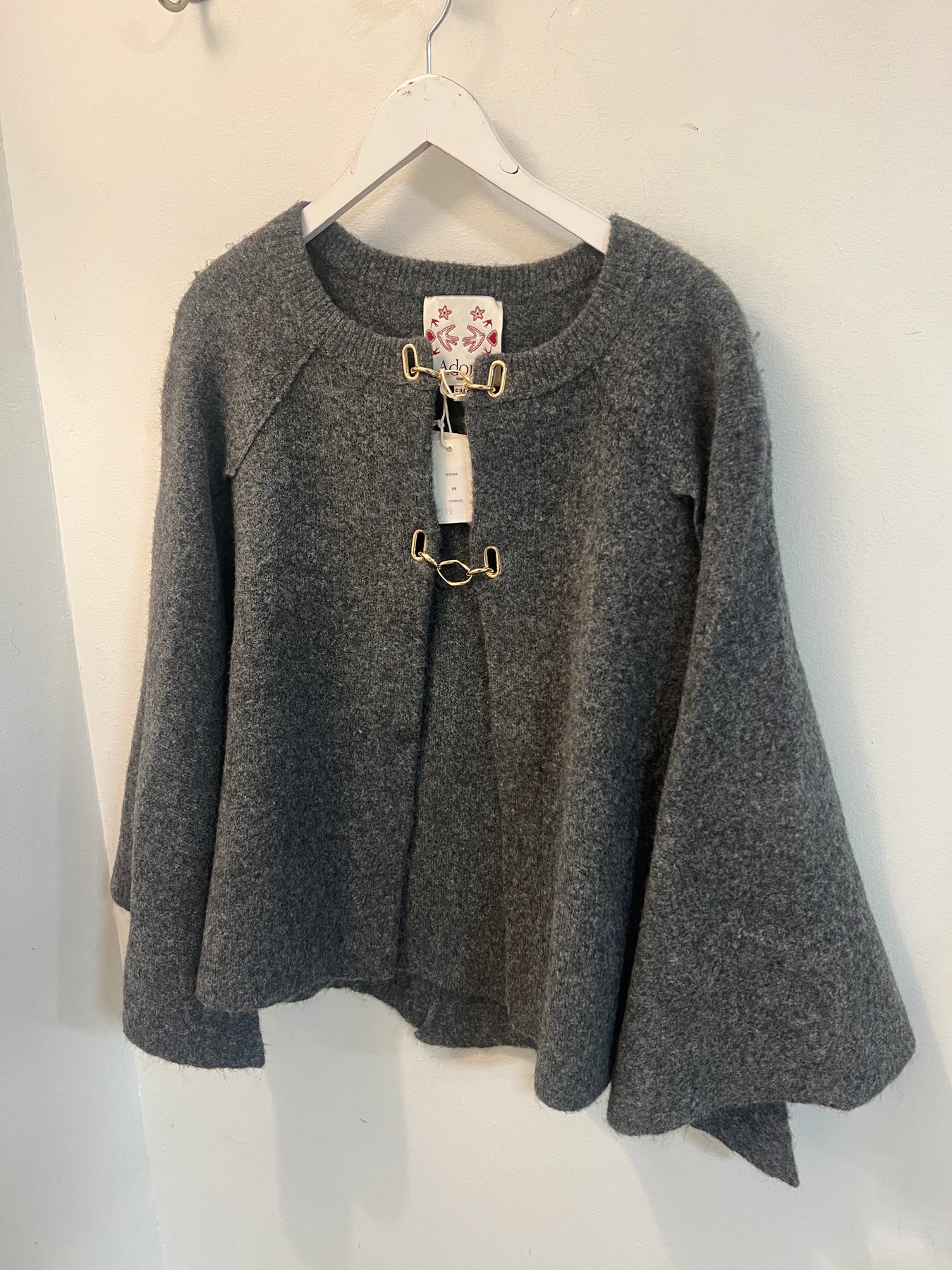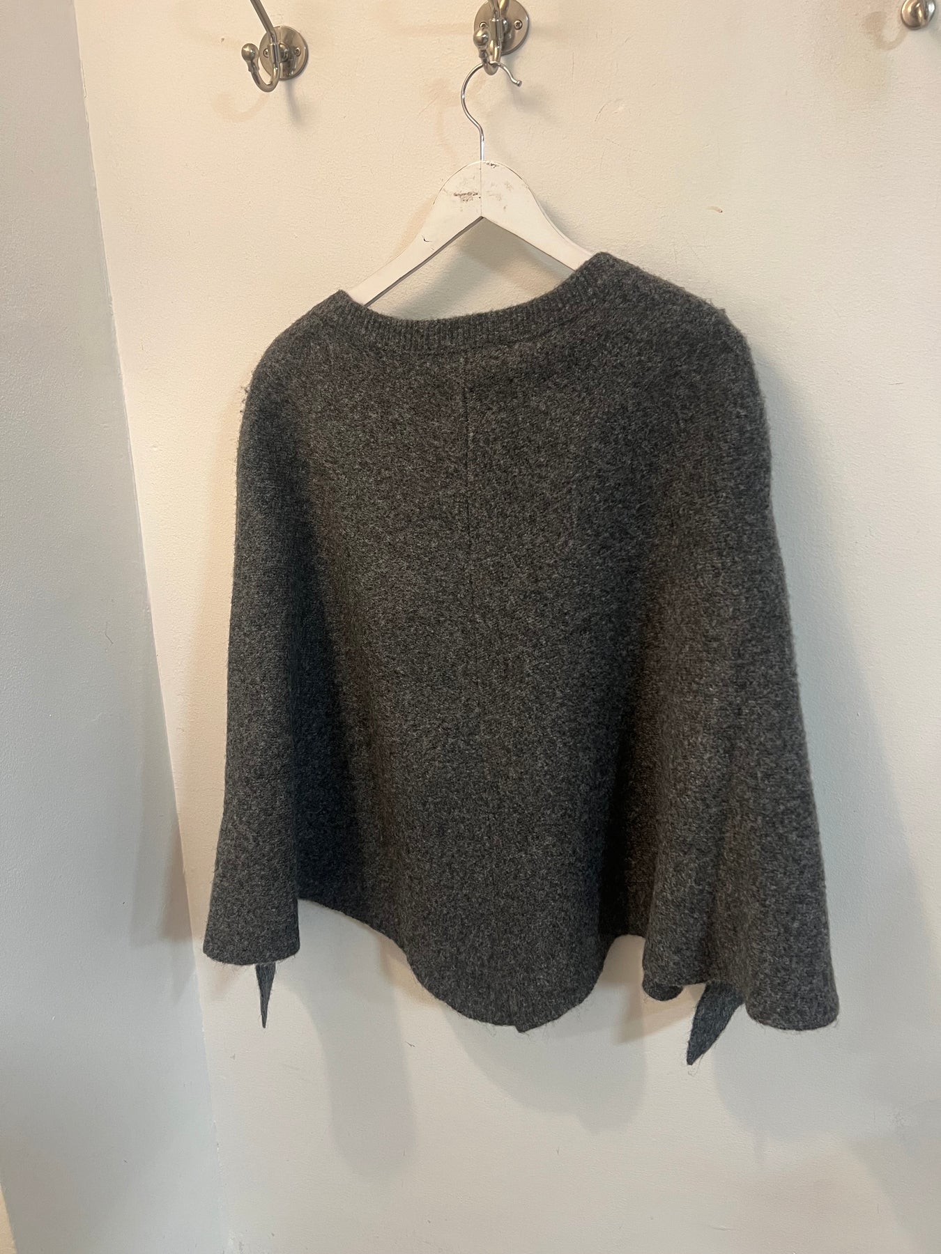 Klassisk snygg poncho, snygg att bära både till kostymbyxor, jeans eller kjol. Knäpper med guld knappar fram till finns i två storlekar normal i storlek den större storleken funkar även till storlek 44. Materialet är