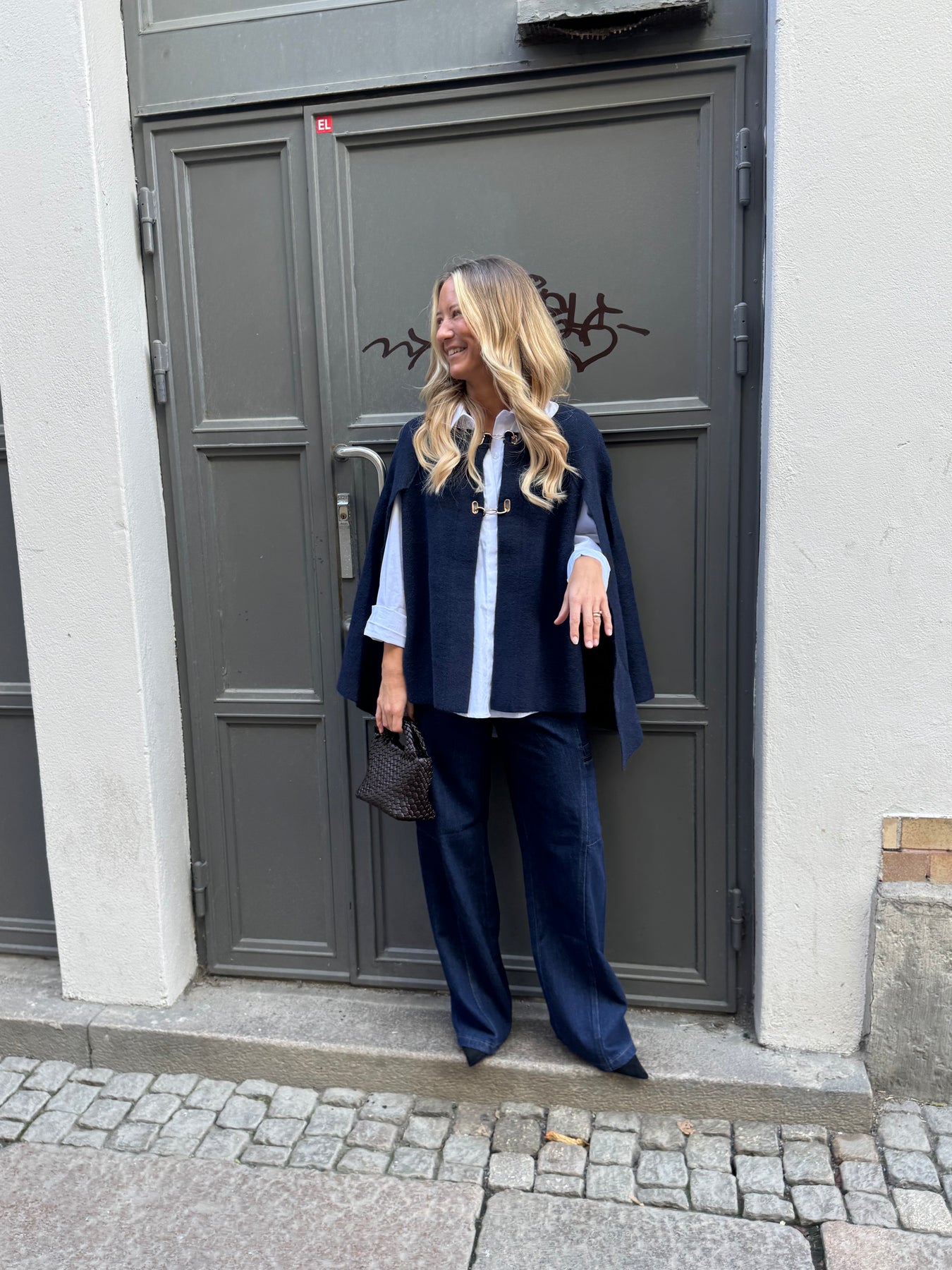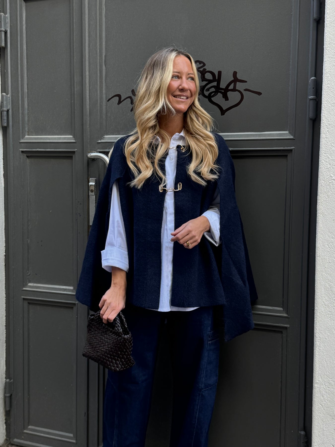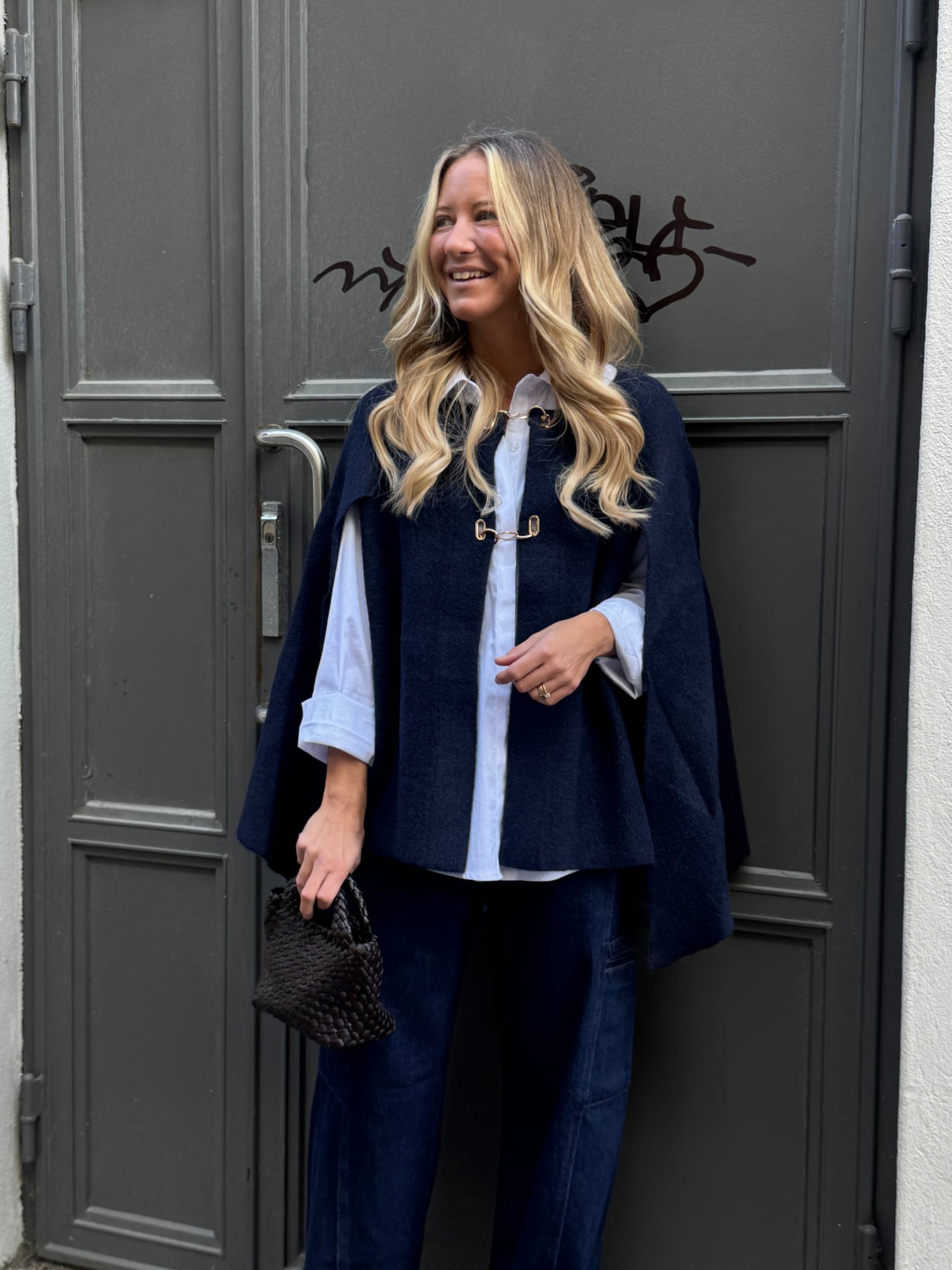 Klassisk snygg poncho, snygg att bära både till kostymbyxor, jeans eller kjol. Knäpper med guld knappar fram till finns i två storlekar normal i storlek den större storleken funkar även till storlek 44. Materialet är